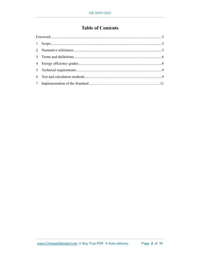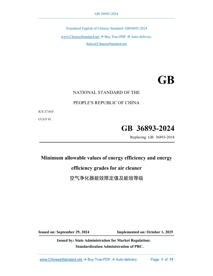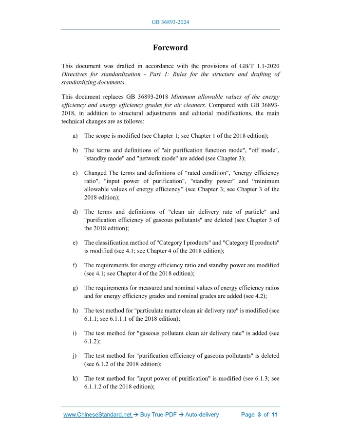 GB 36893-2024: Minimum allowable values of energy efficiency and energy efficiency grades for air cleaner---This is an excerpt. Full copy of true-PDF in English version (including equations, symbols, images, flow-chart, tables, and figures etc.), auto-downloaded/delivered in 9 seconds, can be purchased online: https://www.ChineseStandard.net/PDF.aspx/GB36893-2024 GB NATIONAL STANDARD OF THE PEOPLE'S REPUBLIC OF CHINA ICS 27.010 CCS F 01 Replacing GB 36893-2018 Minimum allowable values of energy efficiency and energy efficiency grades for air cleaner Issued on. SEPTEMBER 29, 2024 Implemented on. OCTOBER 1, 2025 Issued by. State Administration for Market Regulation; Standardization Administration of PRC. Table of ContentsForeword... 3 1 Scope... 5 2 Normative references... 5 3 Terms and definitions... 6 4 Energy efficiency grades... 8 5 Technical requirements... 9 6 Test and calculation methods... 9 7 Implementation of the Standard... 11ForewordThis document was drafted in accordance with the provisions of GB/T 1.1-2020 Directives for standardization - Part 1.Rules for the structure and drafting of standardizing documents. This document replaces GB 36893-2018 Minimum allowable values of the energy efficiency and energy efficiency grades for air cleaners. Compared with GB 36893- 2018, in addition to structural adjustments and editorial modifications, the main technical changes are as follows. a) The scope is modified (see Chapter 1; see Chapter 1 of the 2018 edition); b) The terms and definitions of "air purification function mode", "off mode", "standby mode" and "network mode" are added (see Chapter 3); c) Changed The terms and definitions of "rated condition", "energy efficiency ratio", "input power of purification", "standby power" and “minimum allowable values of energy efficiency” (see Chapter 3; see Chapter 3 of the 2018 edition); d) The terms and definitions of "clean air delivery rate of particle" and "purification efficiency of gaseous pollutants" are deleted (see Chapter 3 of the 2018 edition); e) The classification method of "Category I products" and "Category II products" is modified (see 4.1; see Chapter 4 of the 2018 edition); f) The requirements for energy efficiency ratio and standby power are modified (see 4.1; see Chapter 4 of the 2018 edition); g) The requirements for measured and nominal values of energy efficiency ratios and for energy efficiency grades and nominal grades are added (see 4.2); h) The test method for "particulate matter clean air delivery rate" is modified (see 6.1.1; see 6.1.1.1 of the 2018 edition); i) The test method for "gaseous pollutant clean air delivery rate" is added (see 6.1.2); j) The test method for "purification efficiency of gaseous pollutants" is deleted (see 6.1.2 of the 2018 edition); k) The test method for "input power of purification" is modified (see 6.1.3; see 6.1.1.2 of the 2018 edition); l) The calculation method of the "energy efficiency ratio of gaseous pollutants" is added (see 6.1.4.2); m) The test method for "standby power" is modified (see 6.2; see 6.1.3 of the 2018 edition); n) The implementation requirements for the standard are added (see Chapter 7); o) Appendix A "Test and calculation method for the purification efficiency of gaseous pollutants" is deleted (see Appendix A of the 2018 edition). Please note that some of the contents of this document may involve patents. The issuing organization of this document does not assume the responsibility for identifying patents. This document was proposed by and is under the jurisdiction of the Standardization Administration of the People's Republic of China. This document was first published in 2018 and this is the first revision. Minimum allowable values of energy efficiency and energy efficiency grades for air cleaner1 ScopeThis document specifies the energy efficiency grades, technical requirements, and testing and calculation methods for air cleaners. This document applies to. -- air cleaners with a single-phase rated voltage greater than 5 V and not exceeding 250 V, and other rated voltages not exceeding 480 V; -- air cleaners with the function of removing particulate matter and gaseous pollutants; -- Humidifying purifier and purification fan with independent air purification function modes. This document does not apply to. -- components and modules with air purification functions; -- wearable air cleaners; -- duct purification devices and other similar air cleaners; -- air cleaners designed for industrial use, medical use and vehicles; -- air cleaners used in special environments with corrosive or explosive gases (such as dust, steam or methane gas).2 Normative referencesThe provisions of the following documents constitute the essential clauses of this document through normative references in this text. Among them, for referenced documents with dates, only the versions corresponding to the dates are applicable to this document; for referenced documents without dates, the latest versions (including all amendments) are applicable to this document. GB 12021.9 Minimum allowable values of energy efficiency and energy efficiency grades for electric fans GB/T 18801-2022 Air cleaner GB/T 35758-2017 Household electrical appliances-Measurement of standby power3 Terms and definitionsThe terms and definitions defined in GB/T 18801-2022 and the following apply to this document. 3.1 air purification function mode(s) A working mode in which the product only provides a certain removal ability for one or more target pollutants in indoor air. 3.2 rated condition The working state corresponding to the air cleaner's nominal maximum purification capacity. 3.3 off mode(s) A continuous mode other than standby mode, network mode or active mode when the air cleaner is connected to the mains power. An indicator that only reminds the user that the air cleaner is in the off position is included in the category of off mode. 3.4 standby mode(s) A continuous mode in which the air cleaner provides one or