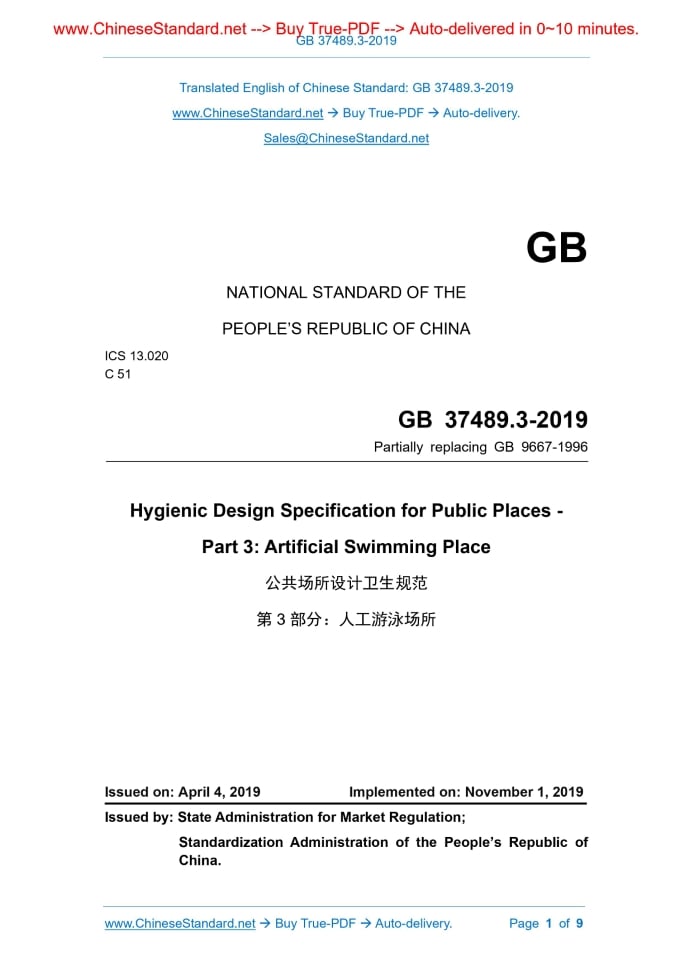 GB 37489.3-2019: Hygienic design specification for public places -- Part 3: Artificial swimming place Delivery: 9 seconds. True-PDF full-copy in English & invoice will be downloaded + auto-delivered via email. See step-by-step procedure Status: Valid