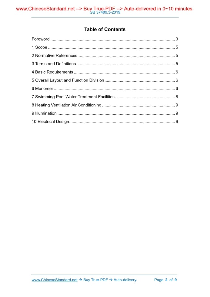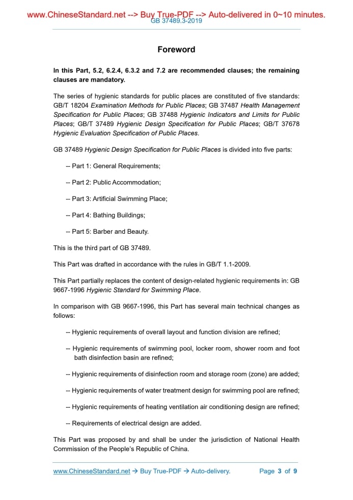 Similar standardsGB 37489.3-2019: Hygienic design specification for public places -- Part 3: Artificial swimming place---This is an excerpt. Full copy of true-PDF in English version (including equations, symbols, images, flow-chart, tables, and figures etc.), auto-downloaded/delivered in 9 seconds, can be purchased online: https://www.ChineseStandard.net/PDF.aspx/GB37489.3-2019 NATIONAL STANDARD OF THE PEOPLE’S REPUBLIC OF CHINA ICS 13.020 C 51 Partially replacing GB 9667-1996 Hygienic Design Specification for Public Places - Part 3: Artificial Swimming Place ISSUED ON: APRIL 4, 2019 IMPLEMENTED ON: NOVEMBER 1, 2019 Issued by: State Administration for Market Regulation; Standardization Administration of the People’s Republic of China. Table of ContentsForeword ... 3 1 Scope ... 5 2 Normative References ... 5 3 Terms and Definitions ... 5 4 Basic Requirements ... 6 5 Overall Layout and Function Division ... 6 6 Monomer ... 6 7 Swimming Pool Water Treatment Facilities ... 8 8 Heating Ventilation Air Conditioning ... 9 9 Illumination ... 9 10 Electrical Design ... 9ForewordIn this Part, 5.2, 6.2.4, 6.3.2 and 7.2 are recommended clauses; the remaining clauses are mandatory. The series of hygienic standards for public places are constituted of five standards: GB/T 18204 Examination Methods for Public Places; GB 37487 Health Management Specification for Public Places; GB 37488 Hygienic Indicators and Limits for Public Places; GB/T 37489 Hygienic Design Specification for Public Places; GB/T 37678 Hygienic Evaluation Specification of Public Places. GB 37489 Hygienic Design Specification for Public Places is divided into five parts: -- Part 1: General Requirements; -- Part 2: Public Accommodation; -- Part 3: Artificial Swimming Place; -- Part 4: Bathing Buildings; -- Part 5: Barber and Beauty. This is the third part of GB 37489. This Part was drafted in accordance with the rules in GB/T 1.1-2009. This Part partially replaces the content of design-related hygienic requirements in: GB 9667-1996 Hygienic Standard for Swimming Place. In comparison with GB 9667-1996, this Part has several main technical changes as follows: -- Hygienic requirements of overall layout and function division are refined; -- Hygienic requirements of swimming pool, locker room, shower room and foot bath disinfection basin are refined; -- Hygienic requirements of disinfection room and storage room (zone) are added; -- Hygienic requirements of water treatment design for swimming pool are refined; -- Hygienic requirements of heating ventilation air conditioning design are refined; -- Requirements of electrical design are added. This Part was proposed by and shall be under the jurisdiction of National Health Commission of the People’s Republic of China. Hygienic Design Specification for Public Places - Part 3: Artificial Swimming Place1 ScopeThis Part of GB 37489 stipulates the basic requirements of newly constructed, expanded and reconstructed artificial swimming places; and the hygienic design requirements of overall layout, function division, monomer, swimming pool water treatment design, heating ventilation air conditioning, illumination and electrical design. This Part is applicable to swimming pools (natatoriums). Other artificial swimming places may take this as a reference. This Part is not applicable to swimming places for infants.2 Normative ReferencesThe following documents are indispensable to the application of this document. In terms of references with a specified date, only versions with a specified date are applicable to this document. In terms of references without a specified date, the latest version (including all the modifications) is applicable to this document. GB 19079.1 Operation Conditions and Technical Requirements for Gymnasium and Playground - Part 1: Swimming Place GB 37489.1 Hygienic Design Specification for Public Places - Part 1: General Requirements CJJ 122 Technical Specification for Water Supply and Drainage Engineering of Swimming Pool JGJ 16 Code for Electrical Design of Civil Buildings3 Terms and DefinitionsThe following terms and definitions are applicable to this document. 3.1 Artificial Swimming Place Artificial swimming place refers to various indoor and outdoor water surfaces (areas) and their facilities and equipment, which are artificially constructed and opened up to the public for swimming activities. Where, A-- the maximum acceptable number of swimmers; S-- swimming pool area, expressed in (m2). 6.2.4 Wardrobes should be manufactured with smooth, mold-proof and water-proof materials. 6.3 Shower Room 6.3.1 Shower rooms for male and female shall be respectively set up. A shower nozzle shall be set up per 20 persons ~ 30 persons. 6.3.2 Shower partitions should be set up. 6.3.3 The walls and ceilings shall use anti-corrosive, heat-resistant, damp-proof and water-proof materials. The ceilings shall have measures to prevent from water vapor condensation. The ground shall be anti-corrosive, anti-seepage and non-slippery; and convenient for cleaning and disinfection. The ground shall have a certain gradient and a water drainage system. 6.3.4 In adjacent area of shower rooms, public bathrooms shall be set up. The floor of public bathrooms shall be lower than the shower rooms. 6.4 Foot Bath Disinfection Basin On the passage from shower room to swimming pool, mandatory passing through-type foot bath disinfection basin shall be set up. Its width shall be the same as the passage; its length shall be not less than 2 m; its depth shall be not less than 20 cm. Foot bath disinfection basin shall have conditions for water supply and drainage. 6.5 Cleaning and Disinfection Room 6.5.1 When public supplies like towels, bath towels and slippers are provided, and cleaning and disinfection of the public supplies are voluntarily conducted, exclusive cleaning and disinfection rooms shall be set up. In the cleaning and disinfection rooms, there shall be a cleaning and disinfection pool exclusive for to
