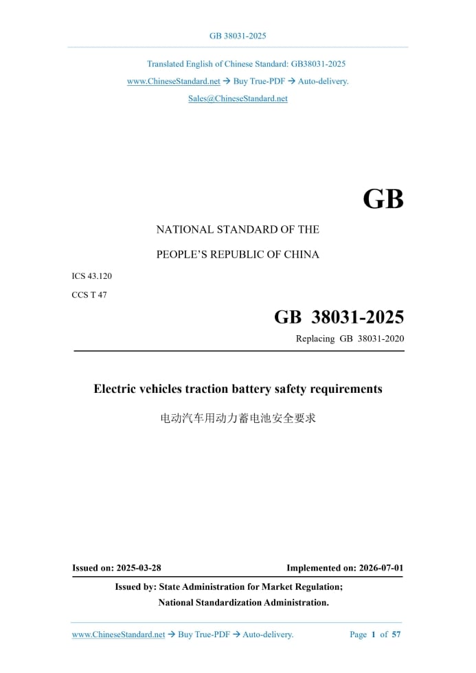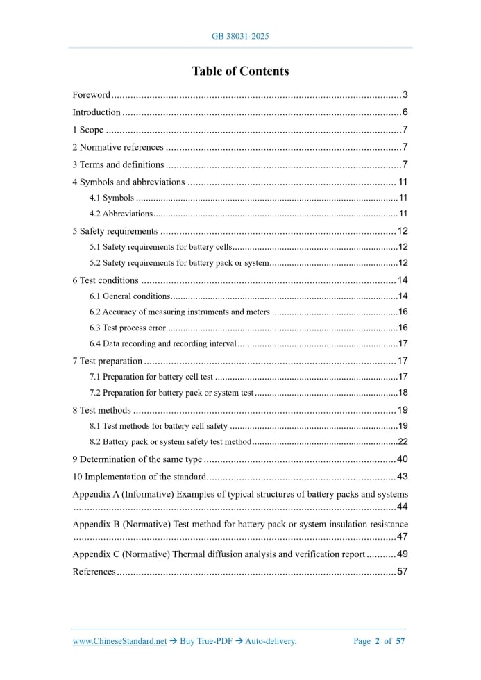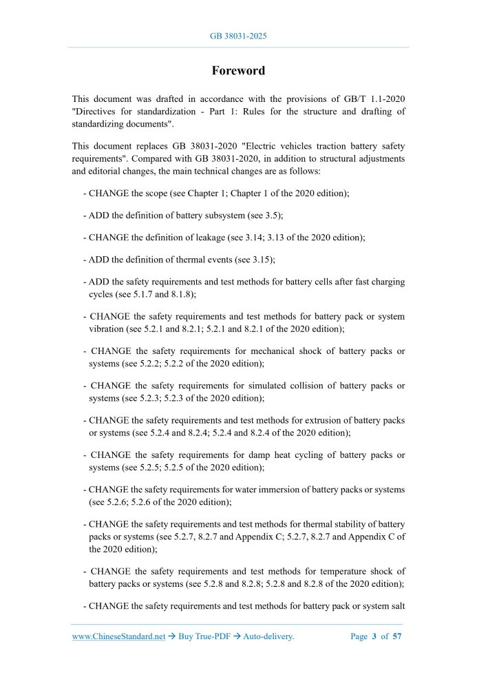 Similar standardsGB 38031-2025: Electric vehicles traction battery safety requirements---This is an excerpt. Full copy of true-PDF in English version (including equations, symbols, images, flow-chart, tables, and figures etc.), auto-downloaded/delivered in 9 seconds, can be purchased online: https://www.ChineseStandard.net/PDF.aspx/GB38031-2025GB NATIONAL STANDARD OF THE PEOPLE’S REPUBLIC OF CHINA ICS 43.120 CCS T 47 Replacing GB 38031-2020 Electric vehicles traction battery safety requirements Issued on. 2025-03-28 Implemented on. 2026-07-01 Issued by. State Administration for Market Regulation; National Standardization Administration. Table of ContentsForeword... 3 Introduction... 6 1 Scope... 7 2 Normative references... 7 3 Terms and definitions... 7 4 Symbols and abbreviations... 11 4.1 Symbols... 11 4.2 Abbreviations... 11 5 Safety requirements... 12 5.1 Safety requirements for battery cells... 12 5.2 Safety requirements for battery pack or system... 12 6 Test conditions... 14 6.1 General conditions... 14 6.2 Accuracy of measuring instruments and meters... 16 6.3 Test process error... 16 6.4 Data recording and recording interval... 17 7 Test preparation... 17 7.1 Preparation for battery cell test... 17 7.2 Preparation for battery pack or system test... 18 8 Test methods... 19 8.1 Test methods for battery cell safety... 19 8.2 Battery pack or system safety test method... 22 9 Determination of the same type... 40 10 Implementation of the standard... 43 Appendix A (Informative) Examples of typical structures of battery packs and systems ... 44 Appendix B (Normative) Test method for battery pack or system insulation resistance ... 47 Appendix C (Normative) Thermal diffusion analysis and verification report... 49 References... 57 Electric vehicles traction battery safety requirements1 ScopeThis document specifies the safety requirements and test methods for power batteries (hereinafter referred to as batteries) for electric vehicles, battery packs or systems. This document applies to power batteries for electric vehicles.2 Normative referencesThe following documents are essential to the application of this document. For the dated documents, only the versions with the dates indicated are applicable to this document; for the undated documents, only the latest version (including all the amendments) is applicable to this standard. GB/T 2423.4 Environmental testing for electric and electronic products - Part 2.Test method - Test Db. Damp heat, cyclic (12 h + 12 h cycle) GB/T 2423.17-2024 Environmental testing - Part 2.Test methods - Test Ka. Salt mist GB/T 2423.43 Environmental testing for electric and electronic products - Part 2. Test methods - Mounting of specimens for vibration, impact and similar dynamic tests GB/T 2423.56 Environmental testing - Part 2.Test methods - Test Fh. Vibration, broadband random and guidance GB/T 4208-2017 Degrees of protection provided by enclosure (IP code) GB/T 19596 Terminology of electric vehicles GB/T 28046.4-2011 Road vehicles - Environmental conditions and testing for electrical and electronic equipment - Part 4.Climatic loads3 Terms and definitionsThe terms and definitions defined in GB/T 19596, as well as the following terms and definitions, apply to this document. 3.1 3.19 End-of-discharge voltage The minimum voltage allowed when the battery cell, module, battery pack or system is discharged according to the conditions specified by the manufacturer. 3.20 Body frame The space frame structure that is formed to ensure the strength and rigidity of the vehicle body. [Source. GB/T 4780-2020, 4.4.3]4 Symbols and abbreviations4.1 Symbols The following symbols apply to this document. I1.1 h rate discharge current (A), whose value is equal to the rated capacity value. I3.3 h rate discharge current (A), whose value is equal to 1/3 of the rated capacity value. 4.2 Abbreviations The following abbreviations apply to this document. BCU. Battery control unit FS. Full scale PSD. Power spectral density RMS. Root mean square SOC. State-of-charge5 Safety requirements5.1 Safety requirements for battery cells 5.1.1 The battery cells shall not catch fire or explode, when subjected to the over- discharge test in accordance with 8.1.2. 5.1.2 The battery cells shall not catch fire or explode, when subjected to the over-charge test in accordance with 8.1.3. 5.1.3 The battery cells shall not catch fire or explode, when subjected to the external short-circuit test in accordance with 8.1.4. 5.1.4 The battery cells shall not catch fire or explode, when subjected to the heating test in accordance with 8.1.5. 5.1.5 The battery cell shall not catch fire or explode, when subjected to temperature cycle test in accordance with 8.1.6. 5.1.6 The battery cell shall not catch fire or explode, when subjected to extrusion test in accordance with 8.1.7. 5.1.7 The battery cell shall not catch fire or explode, when subjected to fast charge cycle in accordance with 8.1.8. 5.2 Safety requirements for battery pack or system 5.2.1 The battery pack or system shall be subjected to vibration test in accordance with 8.2.1; it shall not have leakage, housing crack, fire or explosion. The insulation resistance after the test shall be not less than 100 Ω/V. If there is an AC circuit, the insulation resistance shall be not less than 500 Ω/V. 5.2.2 The battery pack or system shall be subjected to mechanical impact test in accordance with 8.2.2; it shall not have leakage, housing crack, fire or explosion. The insulation resistance after the test shall be not less than 100 Ω/V. If there is an AC circuit, the insulation resistance shall be not less than 500 Ω/V. 5.2.3 The battery pack or system shall be subjected to a simulated collision test in accordance with 8.2.3; there shall be no leakage, housing crack, fire or explosion. The insulation resistance after the test shall be no less than 100 Ω/V. If there is an AC circuit, the insulation resistance shall be no less than 500 Ω/V. 5.2.4 The battery pack 