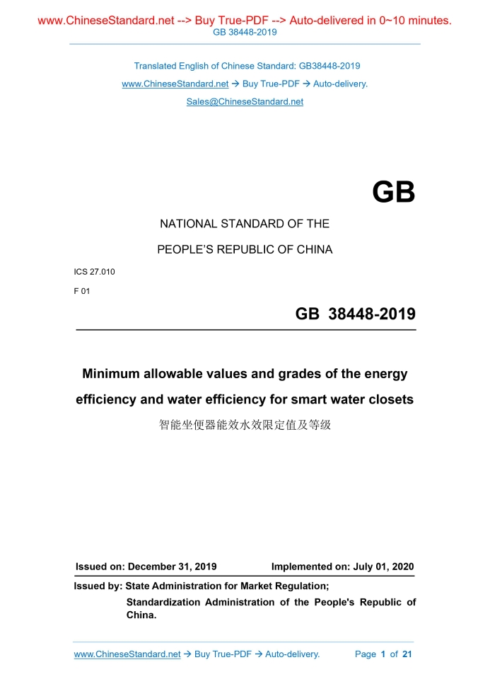 GB 38448-2019: Minimum allowable values and grades of the energy efficiency and water efficiency for smart water closets Delivery: 9 seconds. True-PDF full-copy in English & invoice will be downloaded + auto-delivered via email. See step-by-step procedure Status: Valid GB 38448: Historical versions