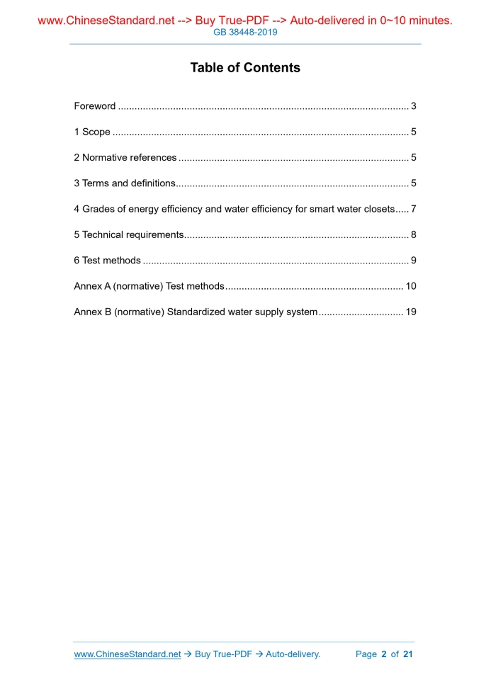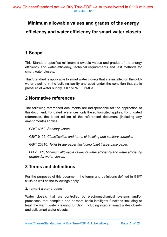Similar standardsGB 38448-2019: Minimum allowable values and grades of the energy efficiency and water efficiency for smart water closets---This is an excerpt. Full copy of true-PDF in English version (including equations, symbols, images, flow-chart, tables, and figures etc.), auto-downloaded/delivered in 9 seconds, can be purchased online: https://www.ChineseStandard.net/PDF.aspx/GB38448-2019 NATIONAL STANDARD OF THE PEOPLE’S REPUBLIC OF CHINA ICS 27.010 F 01 Minimum allowable values and grades of the energy efficiency and water efficiency for smart water closets Issued on. DECEMBER 31, 2019 Implemented on. JULY 01, 2020 Issued by. State Administration for Market Regulation; Standardization Administration of the People's Republic of China. Table of ContentsForeword... 3 1 Scope... 5 2 Normative references... 5 3 Terms and definitions... 5 4 Grades of energy efficiency and water efficiency for smart water closets... 7 5 Technical requirements... 8 6 Test methods... 9 Annex A (normative) Test methods... 10 Annex B (normative) Standardized water supply system... 191 ScopeThis Standard specifies minimum allowable values and grades of the energy efficiency and water efficiency, technical requirements and test methods for smart water closets. This Standard is applicable to smart water closets that are installed on the cold- water pipeline in the building facility and used under the condition that static pressure of water supply is 0.1MPa ~ 0.6MPa.2 Normative referencesThe following referenced documents are indispensable for the application of this document. For dated references, only the edition cited applies. For undated references, the latest edition of the referenced document (including any amendments) applies. GB/T 6952, Sanitary wares GB/T 9195, Classification and terms of building and sanitary ceramics GB/T 20810, Toilet tissue paper (including toilet tissue base paper) GB 25502, Minimum allowable values of water efficiency and water efficiency grades for water closets3 Terms and definitionsFor the purposes of this document, the terms and definitions defined in GB/T 9195 as well as the followings apply. 3.1 smart water closets Water closets that are controlled by electromechanical systems and/or processes, that complete one or more basic intelligent functions including at least the warm water cleaning function, including integral smart water closets and split smart water closets. 3.2 integral smart water closets Smart water closets that the intelligent electromechanical control system and the water closet cannot be used separately. 3.3 split smart water closets The cover part of smart water closets that the intelligent electromechanical control system and the water closet can be separated separately and can be used after combination. 3.4 basic function of smart water closets The most basic movement or ability of intelligence of water closets, including warm water cleaning function (such as hip washing, bidet washing), seat heating function. 3.5 auxiliary function of smart water closets Additional functions to improve the health and hygiene performance of smart water closets, including water temperature adjustment function, seat temperature adjustment function, mobile cleaning function, warm air-drying function, air temperature adjustment function, nozzle adjustment function, automatic flushing function.4 Grades of energy efficiency and water efficiency for smart water closetsThe grade energy efficiency and water efficiency for smart water closets is divided into 3 grades, where grade 3 is the lowest energy efficiency and water efficiency.5 Technical requirements5.1 Basic requirements Under the test conditions specified in the standard, the smart water closets shall meet the relevant requirements specified in the standard. 5.2 Cleaning function 5.2.1 Water temperature characteristics Carry out the test of water temperature characteristics according to the provisions of A.5.2.The highest temperature of cleaning water shall be controlled at 35°C~42°C. 5.2.2 Nozzle self-cleaning Carry out the test of nozzle self-cleaning according to the provisions of A.5.3. The 1/4 ink line at the front of the nozzle shall be cleaned, without any ink residues. 5.3 Flushing function 5.3.1 Washing function It shall meet the requirements for washing function in GB/T 6952. 5.3.2 Water seal recovery It shall meet the requirements for water seal recovery function in GB/T 6952. 5.3.5 Toilet paper emission Carry of the half-flushing toilet paper test of double-flushing smart water closets according to the provisions of A.6.6.There shall be no visible paper in smart water closets every time. 5.3.6 Drainage pipeline transportation characteristics Carry out the pipeline transportation characteristics test according to the provisions of A.6.7.The average transmission distance of the ball shall not be less than 12m. 5.4 Seat heating function Carry out the seat heating function test according to the provisions of A.7.The temperature of all seat test points shall not be less than 30°C and shall not be greater than 42°C.6 Test methodsThe test methods for energy consumption per unit cycle, average water consumption for cleaning, average water consumption for flushing, cleaning function, flushing function, seat heating function are in accordance with Annex A.Annex A(normative) Test methods A.1 Test device A.1.1 The flushing water consumption and flushing function test of smart water closets shall use the standardized water supply system that complies with B.1 in Annex B. A.2 Unit cycle energy consumption test A.2.1Test conditions The average ambient temperature during the test shall be (23±1)°C (collect once per minute during the test period, and take the average value). Keep the inlet water temperature at (15±1)°C. Test environment has no forced convection air (wind speed < 1m/s). A.2.2 Test steps Install the smart water closet to normal use state according to the instructions. Run the hip cleaning mode for 2 cy