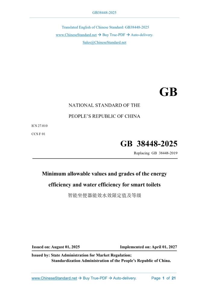 GB NATIONAL STANDARD OF THE PEOPLE’S REPUBLIC OF CHINA ICS 27.010 CCS F 01 GB38448-2025 Replacing GB 38448-2019 Minimum allowable values and grades of the energy efficiency and water efficiency for smart toilets Issued on: AUGUST 01, 2025 Implemented on: APRIL 01, 2027 Issued by. State Administration for Market Regulation; Standardization Administration of the People’s Republic of China.