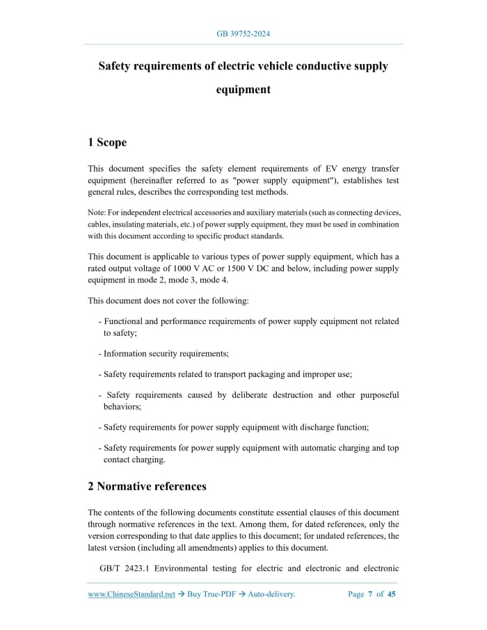 Similar standardsGB 39752-2024: Safety requirements of electric vehicle conductive supply equipment---This is an excerpt. Full copy of true-PDF in English version (including equations, symbols, images, flow-chart, tables, and figures etc.), auto-downloaded/delivered in 9 seconds, can be purchased online: https://www.ChineseStandard.net/PDF.aspx/GB39752-2024GB NATIONAL STANDARD OF THE PEOPLE’S REPUBLIC OF CHINA ICS 43.040.99 CCS T 35 Replacing GB/T 39752-2021 Safety requirements of electric vehicle conductive supply equipment Issued on. JULY 24, 2024 Implemented on. AUGUST 01, 2025 Issued by. State Administration for Market Regulation; National Standardization Administration. Table of ContentsForeword... 3 1 Scope... 7 2 Normative references... 7 3 Terms and definitions... 9 4 Symbols and abbreviations... 16 5 Safety element requirements... 17 6 General test rules... 31 7 Test methods... 34 8 Implementation of the standard... 42 Appendix A (Normative) Installation of EV energy transfer equipment... 43 References... 451 ScopeThis document specifies the safety element requirements of EV energy transfer equipment (hereinafter referred to as "power supply equipment"), establishes test general rules, describes the corresponding test methods. Note. For independent electrical accessories and auxiliary materials (such as connecting devices, cables, insulating materials, etc.) of power supply equipment, they must be used in combination with this document according to specific product standards. This document is applicable to various types of power supply equipment, which has a rated output voltage of 1000 V AC or 1500 V DC and below, including power supply equipment in mode 2, mode 3, mode 4. This document does not cover the following. - Functional and performance requirements of power supply equipment not related to safety; - Information security requirements; - Safety requirements related to transport packaging and improper use; - Safety requirements caused by deliberate destruction and other purposeful behaviors; - Safety requirements for power supply equipment with discharge function; - Safety requirements for power supply equipment with automatic charging and top contact charging.2 Normative referencesThe contents of the following documents constitute essential clauses of this document through normative references in the text. Among them, for dated references, only the version corresponding to that date applies to this document; for undated references, the latest version (including all amendments) applies to this document. GB/T 2423.1 Environmental testing for electric and electronic and electronic products - Part 2.Test methods - Tests A. Cold GB/T 2423.2 Environmental testing for electric and electronic products - Part 2.Test methods - Tests B. Dry heat GB/T 2423.4 Environmental testing for electric and electronic products - Part 2.Test method - Test Db. Damp heat, cyclic (12h + 12h cycle) GB/T 2423.17 Environmental testing for electric and electronic products - Part 2. Test method - Test Ka. Salt mist GB/T 2423.55-2023 Environmental testing - Part 2.Test methods - Test Eh. Hammer tests3 Terms and definitionsThe terms and definitions as defined in GB/T 18487.1-2023 and GB/T 29317-2021, as well as the following terms and definitions, apply to this document. 3.1 EV energy transfer equipment Equipment that connects the electric vehicle to the power grid (power source) and enables energy flow. 3.2 Enclosure An enclosure that provides the appropriate type and degree of protection for its intended use. 3.3 Tool An appliance that can be used to turn screws, latches or similar fixings.4 Symbols and abbreviations4.1 Symbols The following symbols apply to this document. IΔn. Rated residual operating current IK. Protection level code of the enclosure against harmful mechanical collisions from the outside world IPXX. Enclosure protection level code 4.2 Abbreviations The following abbreviations apply to this document. AC. Alternating Current CPT port. Conductive Power Transfer port5 Safety element requirements5.1 Conditions of use 5.1.1 Environmental classification The classification of the use environment of power supply equipment is shown in Table 1. 5.1.2 Pollution degree The pollution degree of the power supply equipment is the pollution degree of the external environment. The minimum pollution degree of the power supply equipment used indoors is PD2.When the indoor environment is exposed to a polluted industrial environment, the minimum pollution degree is PD3.The minimum pollution degree of the power supply equipment used outdoors is PD3. 5.2 Structure 5.2.1 General requirements The structure of the power supply equipment, including the enclosure, partitions, door locking devices and hinges, connections and splicing, shall have sufficient mechanical strength, to withstand the stress encountered during use under normal conditions and fault conditions. 5.2.2 Handles and manual control devices Handles, knobs, clamps, joysticks and other similar moving parts shall be firmly installed and shall not be loose under normal use. 5.2.5 Enclosure openings The configuration and construction of the openings shall ensure that foreign objects entering the openings will not contact the exposed live parts and cause danger. Openings in door panels, panels, covers, etc. shall meet the protection requirements of IPXXC when closed or in place. Power supply equipment intended for use in more than one direction is applicable to each direction. 5.2.6 Protection level The protection level of the power supply equipment's enclosure for outdoor use shall not be less than IP54; the protection level of the power supply equipment's enclosure for indoor use shall not be less than IP32. 5.3.1 Decisive voltage level limit (DVC) The electric shock protection measures depend on the decisive voltage level of the circuit. The decisive voltage level of the circuit depends on the operating voltage limit of the circuit and the insulat