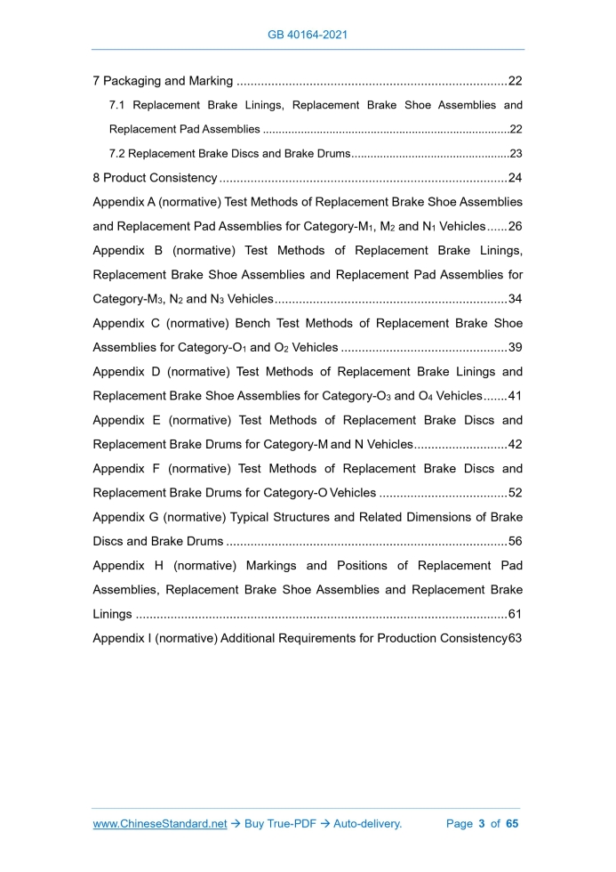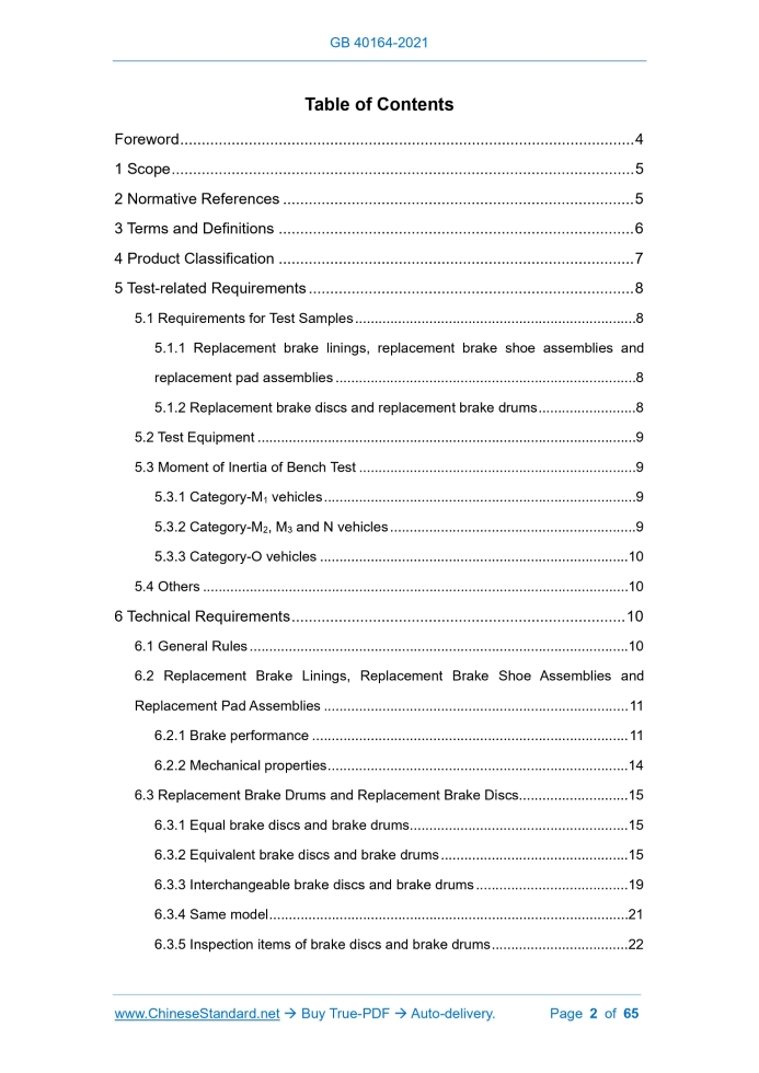 Similar standardsGB 40164-2021: Automobiles and trailer - Specifications and test methods of brake part---This is an excerpt. Full copy of true-PDF in English version (including equations, symbols, images, flow-chart, tables, and figures etc.), auto-downloaded/delivered in 9 seconds, can be purchased online: https://www.ChineseStandard.net/PDF.aspx/GB40164-2021GB NATIONAL STANDARD OF THE PEOPLE’S REPUBLIC OF CHINA ICS 43.040.40 T 24 Automobiles and Trailer - Specifications and Test Methods of Brake Part [Including Amendment 1 2024XG1] Issued on. APRIL 30, 2021 Implemented on. JANUARY 1, 2022 Issued by. State Administration for Market Regulation; Standardization Administration of the People’s Republic of China. Table of ContentsForeword... 4 1 Scope... 5 2 Normative References... 5 3 Terms and Definitions... 6 4 Product Classification... 7 5 Test-related Requirements... 8 6 Technical Requirements... 10 7 Packaging and Marking... 22 8 Product Consistency... 24 Appendix A (normative) Test Methods of Replacement Brake Shoe Assemblies and Replacement Pad Assemblies for Category-M1, M2 and N1 Vehicles... 26 Appendix B (normative) Test Methods of Replacement Brake Linings, Replacement Brake Shoe Assemblies and Replacement Pad Assemblies for Category-M3, N2 and N3 Vehicles... 34 Appendix C (normative) Bench Test Methods of Replacement Brake Shoe Assemblies for Category-O1 and O2 Vehicles... 39 Appendix D (normative) Test Methods of Replacement Brake Linings and Replacement Brake Shoe Assemblies for Category-O3 and O4 Vehicles... 41 Appendix E (normative) Test Methods of Replacement Brake Discs and Replacement Brake Drums for Category-M and N Vehicles... 42 Appendix F (normative) Test Methods of Replacement Brake Discs and Replacement Brake Drums for Category-O Vehicles... 52 Appendix G (normative) Typical Structures and Related Dimensions of Brake Discs and Brake Drums... 56 Appendix H (normative) Markings and Positions of Replacement Pad Assemblies, Replacement Brake Shoe Assemblies and Replacement Brake Linings... 61 Appendix I (normative) Additional Requirements for Production Consistency 63 Amendment 1 [2024XG1]... 66ForewordThis Standard was drafted in accordance with the rules in GB/T 1.1-2009. This Standard was proposed by and shall be under the jurisdiction of Ministry of Industry and Information Technology of the People’s Republic of China. Automobiles and Trailer - Specifications and Test Methods of Brake Part1 ScopeThis Standard specifies the terms and definitions, test-related requirements, technical requirements, test methods, packaging, marking and product consistency of brake replacement parts, such as. brake linings, brake shoe assembly, pad assembly, brake drums and brake discs for automobiles and trailer braking systems. This Standard is applicable to the following brake parts. a) Used for the replacement brake shoe assembly and replacement pad assembly of the friction-type brake of the braking system components of Category-M, Category N and Category-O vehicles that have completed type certification in accordance with GB 12676-2014 or GB 21670-2008; b) Used for the replacement brake linings of Category-M3, Category-N2, Category-N3, Category-O3 or Category-O4 vehicles that have completed type certification in accordance with GB 12676-2014, and designed to be riveted to the brake shoe before assembly and use; c) Used for the replacement brake shoe assembly and pad assembly of the parking braking system for exclusive uses; d) Used for the replacement brake drums and replacement brake discs of the friction-type brake of the braking system components of Category-M, Category-N and Category-O vehicles that have completed type certification in accordance with GB 12676-2014 or GB 21670-2008. This Standard is not applicable to original brake drums, brake discs, brake shoe assembly, pad assembly and brake linings (already installed on the vehicle at the time of type certification), as well as original replacement brake drums, brake discs, brake shoe assembly, pad assembly and brake linings used for vehicle after-sales maintenance service.2 Normative ReferencesThe following documents are indispensable to the application of this document. In terms of references with a specified date, only versions with a specified date are applicable to this document. In terms of references without a specified date, the latest version (including all the modifications) is applicable to this document. GB/T 131 Geometrical Product Specifications (GPS) - Indication of Surface Texture in Technical Product Documentation GB/T 228.1 Metallic Materials - Tensile Testing - Part 1.Method of Test at Room Temperature GB/T 231.1 Metallic Materials - Brinell Hardness Test - Part 1.Test Method GB/T 5620 Road Vehicles - Vocabulary and Definition for Braking of Automotive Vehicles and Their Trailers GB 5763 Brake Linings for Automobiles GB/T 7216 Metallographic Test for Gray Cast Iron GB 12676-2014 Technical Requirements and Testing Methods for Commercial Vehicle and Trailer Braking Systems GB 21670-2008 Technical Requirements and Testing Methods for Passenger Car Braking Systems3 Terms and DefinitionsWhat is defined in GB/T 5620, GB 12676-2014 and GB 21670-2008, and the following terms and definitions are applicable to this document. 3.1 Parking Shoe (pad) Assembly Parking shoe assembly or parking pad assembly separated from the service braking system and exclusively used by the parking braking system. 3.2 Minimum Thickness Minimum thickness refers to the limit thickness allowed by the brake disc. 3.3 Maximum Inside Diameter Maximum inside diameter refers to the inside diameter of the limit friction surface allowed by the brake drum.4 Product Classification4.1 In accordance with the standards implemented for product type certification, brake parts are divided into. 4.2 In accordance with the structures, dimensions and materials, the replacement brake drums and replacement brake discs are subdivided into.5 Test-related