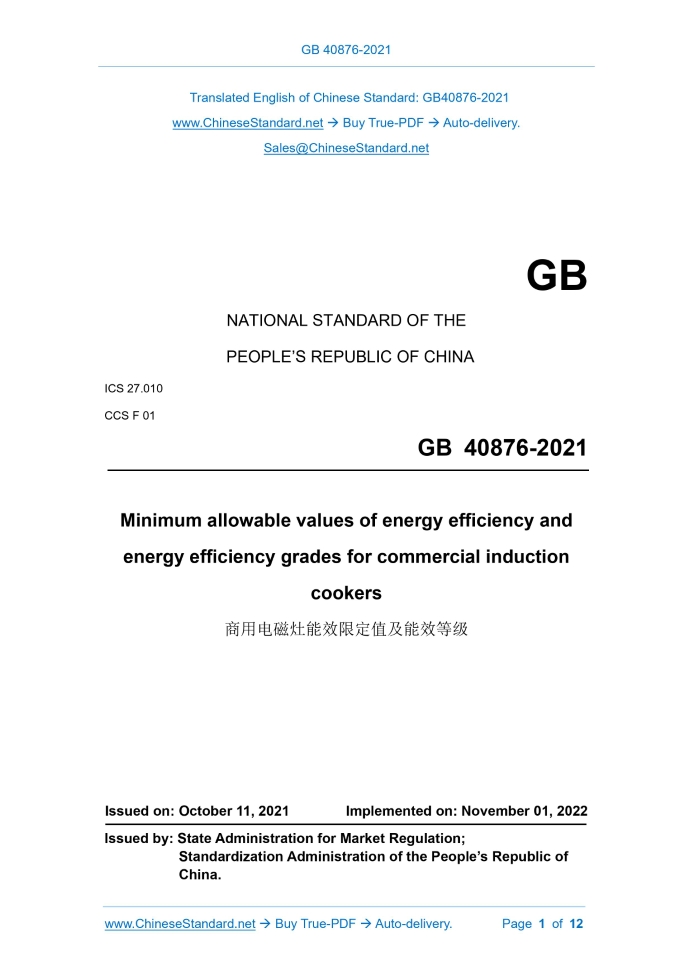 GB 40876-2021: Minimum allowable values of energy efficiency and energy efficiency grades for commercial induction cookers Delivery: 9 seconds. True-PDF full-copy in English & invoice will be downloaded + auto-delivered via email. See step-by-step procedure Status: Valid
