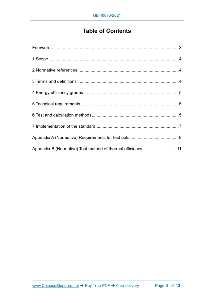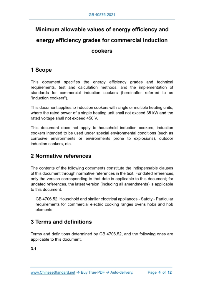 GB 40876-2021: Minimum allowable values of energy efficiency and energy efficiency grades for commercial induction cookers---This is an excerpt. Full copy of true-PDF in English version (including equations, symbols, images, flow-chart, tables, and figures etc.), auto-downloaded/delivered in 9 seconds, can be purchased online: https://www.ChineseStandard.net/PDF.aspx/GB40876-2021 GB NATIONAL STANDARD OF THE PEOPLE’S REPUBLIC OF CHINA ICS 27.010 CCS F 01 Minimum allowable values of energy efficiency and energy efficiency grades for commercial induction cookers ISSUED ON: OCTOBER 11, 2021 IMPLEMENTED ON: NOVEMBER 01, 2022 Issued by: State Administration for Market Regulation; Standardization Administration of the People’s Republic of China. Table of ContentsForeword ... 3 1 Scope ... 4 2 Normative references ... 4 3 Terms and definitions ... 4 4 Energy efficiency grades ... 5 5 Technical requirements ... 5 6 Test and calculation methods ... 5 7 Implementation of the standard ... 7 Appendix A (Normative) Requirements for test pots ... 8 Appendix B (Normative) Test method of thermal efficiency ... 11 Minimum allowable values of energy efficiency and energy efficiency grades for commercial induction cookers1 ScopeThis document specifies the energy efficiency grades and technical requirements, test and calculation methods, and the implementation of standards for commercial induction cookers (hereinafter referred to as "induction cookers"). This document applies to induction cookers with single or multiple heating units, where the rated power of a single heating unit shall not exceed 35 kW and the rated voltage shall not exceed 450 V. This document does not apply to household induction cookers, induction cookers intended to be used under special environmental conditions (such as corrosive environments or environments prone to explosions), outdoor induction cookers, etc.2 Normative referencesThe contents of the following documents constitute the indispensable clauses of this document through normative references in the text. For dated references, only the version corresponding to that date is applicable to this document; for undated references, the latest version (including all amendments) is applicable to this document. GB 4706.52, Household and similar electrical appliances - Safety - Particular requirements for commercial electric cooking ranges ovens hobs and hob elements3 Terms and definitionsTerms and definitions determined by GB 4706.52, and the following ones are applicable to this document. 3.1Appendix B(Normative) Test method of thermal efficiency The test method of thermal efficiency is as follows: a) Under the test conditions specified in 6.1, place the induction cooker at the laboratory ambient temperature for at least 2 h; b) For the non-integrated flat stove, a standard pot in accordance with A.1 and a standard lid in accordance with A.2 can be used for testing. The standard pot shall be a matching port of the smallest specification to cover the heating area; the mass of the pot m2, and the mass of the lid m3 shall be measured; c) For the non-integrated concave stove, the manufacturer's standard pot and the standard lid of A.3 can be used for testing. The test pot shall be a matching pot of the smallest specification to cover the heating area; the mass of the pot m2, and the mass of the lid m3 shall be measured; d) For the integrated stove, use the manufacturer's standard pot and the standard lid of A.3 for testing; the mass of the pot m2 and the mass of the lid m3 shall be measured; e) Fill the pot with 70% of its volume of water; record the mass as m1; the water temperature is 15 °C ±1 °C; f) Place the matching pot with water in the center of the product heating unit; cover it; g) Put the temperature measuring probe into the center of the pot from the lid hole; when the measuring point is 10 mm away from the pot bottom, read the reading t1 of the temperature measuring instrument; h) Start the induction cooker and quickly adjust it to the maximum rated power; i) When the temperature rise of the water is close to 75 K, turn off the induction cooker; record the consumed electric energy E; read the highest temperature reading t2 after 1 min; calculate the thermal efficiency according to Formula (1); ......Source: Above contents are excerpted from the full-copy PDF -- translated/reviewed by: www.ChineseStandard.net / Wayne Zheng et al. Tips & Frequently Asked Questions:Question 1: How long will the true-PDF of English version of GB 40876-2021 be delivered?Answer: The full copy PDF of English version of GB 40876-2021 can be downloaded in 9 seconds, and it will also be emailed to you in 9 seconds (double mechanisms to ensure the delivery reliably), with PDF-invoice.Question 2: Can I share the purchased PDF of GB 40876-2021_English with my colleagues?Answer: Yes. The purchased PDF of GB 40876-2021_English will be deemed to be sold to your employer/organization who actually paid for it, including your colleagues and your employer's intranet.Question 3: Does the price include tax/VAT?Answer: Yes. Our tax invoice, downloaded/delivered in 9 seconds, includes all tax/VAT and complies with 100+ countries' tax regulations (tax exempted in 100+ countries) -- See Avoidance of Double Taxation Agreements (DTAs): List of DTAs signed between Singapore and 100+ countriesQuestion 4: Do you accept my currency other than USD?Answer: Yes. www.ChineseStandard.us -- GB 40876-2021 -- Click this link and select your country/currency to pay, the exact amount in your currency will be printed on the invoice. Full PDF will also be downloaded/emailed in 9 seconds.How to buy and download a true PDF of English version of GB 40876-2021?A step-by-step guide to download PDF of GB 40876-2021_EnglishStep 1: Visit website https://www.ChineseStandard.net (Pay in USD), or https://www.ChineseStandard.us (Pay in any currencies such as Euro, KRW, JPY, AUD).Step 2: Search keyword "GB 40876-2021". Step 3: Click "Add to C