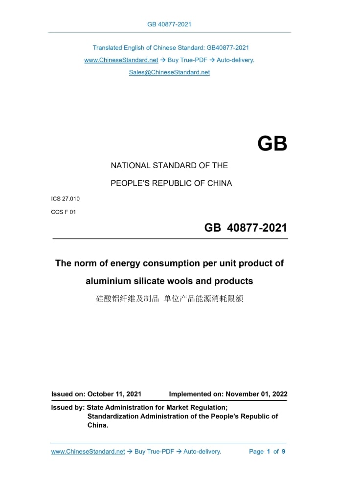 GB 40877-2021: The norm of energy consumption per unit product of aluminium silicate wools and products Delivery: 9 seconds. True-PDF full-copy in English & invoice will be downloaded + auto-delivered via email. See step-by-step procedure Status: Valid