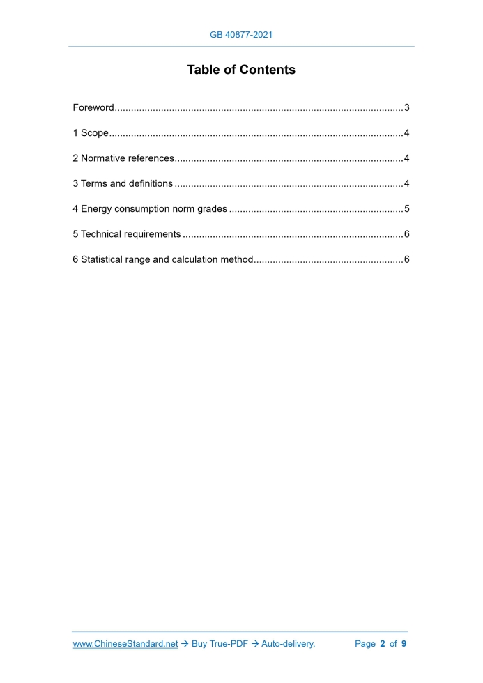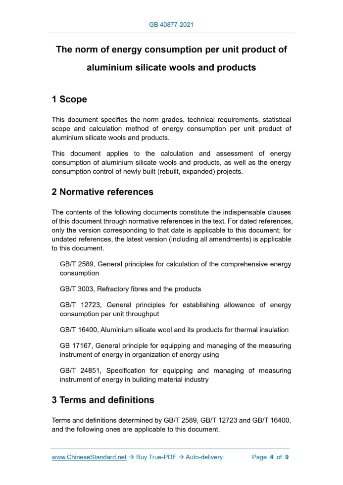 GB 40877-2021: The norm of energy consumption per unit product of aluminium silicate wools and products---This is an excerpt. Full copy of true-PDF in English version (including equations, symbols, images, flow-chart, tables, and figures etc.), auto-downloaded/delivered in 9 seconds, can be purchased online: https://www.ChineseStandard.net/PDF.aspx/GB40877-2021 GB NATIONAL STANDARD OF THE PEOPLE’S REPUBLIC OF CHINA ICS 27.010 CCS F 01 The norm of energy consumption per unit product of aluminium silicate wools and products ISSUED ON: OCTOBER 11, 2021 IMPLEMENTED ON: NOVEMBER 01, 2022 Issued by: State Administration for Market Regulation; Standardization Administration of the People’s Republic of China. Table of ContentsForeword ... 3 1 Scope ... 4 2 Normative references ... 4 3 Terms and definitions ... 4 4 Energy consumption norm grades ... 5 5 Technical requirements ... 6 6 Statistical range and calculation method ... 6 The norm of energy consumption per unit product of aluminium silicate wools and products1 ScopeThis document specifies the norm grades, technical requirements, statistical scope and calculation method of energy consumption per unit product of aluminium silicate wools and products. This document applies to the calculation and assessment of energy consumption of aluminium silicate wools and products, as well as the energy consumption control of newly built (rebuilt, expanded) projects.2 Normative referencesThe contents of the following documents constitute the indispensable clauses of this document through normative references in the text. For dated references, only the version corresponding to that date is applicable to this document; for undated references, the latest version (including all amendments) is applicable to this document. GB/T 2589, General principles for calculation of the comprehensive energy consumption GB/T 3003, Refractory fibres and the products GB/T 12723, General principles for establishing allowance of energy consumption per unit throughput GB/T 16400, Aluminium silicate wool and its products for thermal insulation GB 17167, General principle for equipping and managing of the measuring instrument of energy in organization of energy using GB/T 24851, Specification for equipping and managing of measuring instrument of energy in building material industry3 Terms and definitionsTerms and definitions determined by GB/T 2589, GB/T 12723 and GB/T 16400, and the following ones are applicable to this document. consumed and exported from the construction of infrastructure, technological transformation and other projects. 6.1.1.2 Various energy sources shall be uniformly converted into standard coal according to their calorific value. If there are actual measurement conditions, the calorific value measured by the enterprise during the statistical period shall prevail. If there is no actual measurement condition, use the energy conversion coefficient given in GB/T 2589 to convert into standard coal. 6.1.1.3 The statistical period is a natural year 6.1.2 Classification 6.1.2.1 Aluminium silicate wools The energy consumption of aluminium silicate wools shall include the energy consumption of all production systems, auxiliary production systems and subsidiary production systems involved in the process from the raw materials entering the conveying and batching stage to the warehousing of cellucotton. The spinning process shall include: melting furnace, flow port, air compressor, fan, water pump, spinning, cotton collecting box mesh belt and dust removal. The injection process shall include: melting furnace, flow port, air compressor, fan, water pump, cotton collecting box mesh belt and dust removal. 6.1.2.2 Needled aluminium silicate wool blanket The energy consumption of needled aluminium silicate wool blanket shall include the energy consumption of all production systems, auxiliary production systems, and subsidiary production systems involved in the process from the cellucotton entering the needling stage to the warehousing of finished products, including: cooling fan, carpet roll, needle punch, dust removal, heating furnace (including electric heating and natural gas heating) and mesh belt. 6.1.2.3 Aluminium silicate wool wet-processed products (continuous mechanism) The energy consumption of aluminium silicate wool wet-processed products (continuous mechanism) shall include the energy consumption of all production systems, auxiliary production systems and subsidiary production systems involved in the process from the cellucotton entering the conveying and batching stage, to beating, slag removal, slurry preparation, storage, fourdrinier wire forming, and drying, cutting, to warehousing of the finished products. 6.1.2.4 Aluminium silicate wool wet-processed products (vacuum suction filtration) The energy consumption of aluminium silicate wool wet-processed products (vacuum suction filtration) shall include the energy consumption of all production systems, auxiliary production systems and subsidiary production systems involved in the process from the cellucotton entering the conveying and batching stage, to beating, slag removal, slurry preparation, vacuum suction filtration, and drying, cutting to warehousing of finished products. 6.2 Statistical method Use energy measuring instruments to measure and count the amount of energy consumption during the statistical period; do not recalculate or miss calculation. The energy measuring instruments shall comply with the relevant provisions of GB 17167 and GB/T 24851. 6.3 Calculation methods 6.3.1 Principle The calculation of the comprehensive energy consumption of aluminium silicate wools and products shall comply with the provisions of GB/T 2589 on the calculation principle and calculation range. 6.3.2 Calculation of comprehensive energy consumption of products The comprehensive energy consumption of aluminium silicate wools or products shall be calculated according to Formula (1): Where: E – the comprehensive en