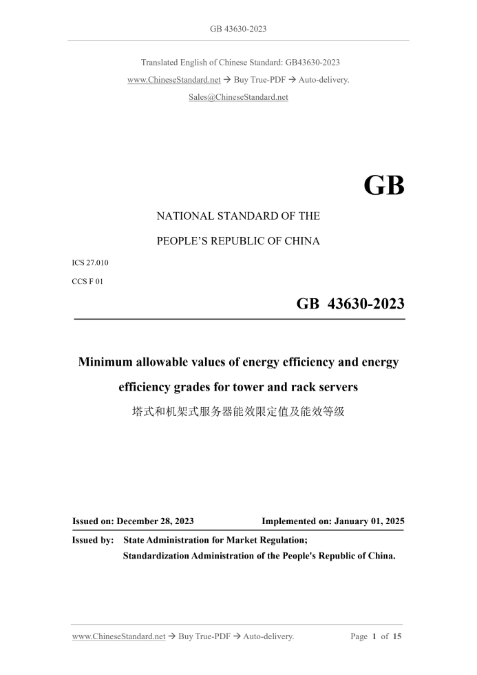 GB NATIONAL STANDARD OF THE PEOPLE’S REPUBLIC OF CHINA ICS 27.010 CCS F 01 Minimum allowable values of energy efficiency and energy efficiency grades for tower and rack servers Issued on: DECEMBER 28, 2023 Implemented on: JANUARY 01, 2025 Issued by. State Administration for Market Regulation; Standardization Administration of the People's Republic of China.
