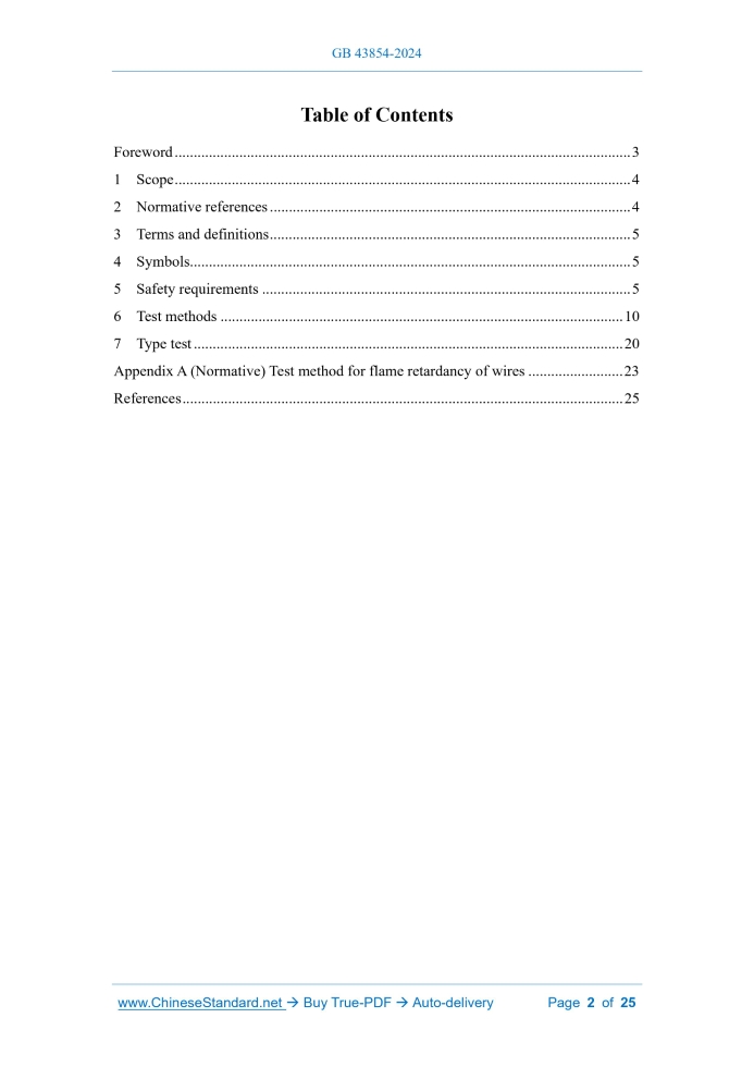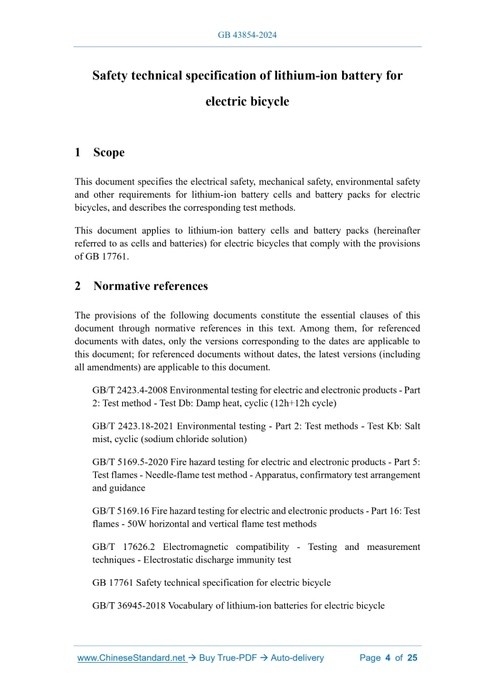 Similar standardsGB 43854-2024: Safety technical specification of lithium-ion battery for electric bicycle---This is an excerpt. Full copy of true-PDF in English version (including equations, symbols, images, flow-chart, tables, and figures etc.), auto-downloaded/delivered in 9 seconds, can be purchased online: https://www.ChineseStandard.net/PDF.aspx/GB43854-2024GB NATIONAL STANDARD OF THE PEOPLE'S REPUBLIC OF CHINA ICS 43.140 CCS Y 14 Safety technical specification of lithium-ion battery for electric bicycle Issued on. APRIL 25, 2024 Implemented on. NOVEMBER 1, 2024 Issued by. State Administration for Market Regulation; Standardization Administration of PRC. Table of ContentsForeword... 3 1 Scope... 4 2 Normative references... 4 3 Terms and definitions... 5 4 Symbols... 5 5 Safety requirements... 5 6 Test methods... 10 7 Type test... 20 Appendix A (Normative) Test method for flame retardancy of wires... 23 References... 25ForewordThis document was drafted in accordance with the provisions of GB/T 1.1-2020 Directives for standardization - Part 1.Rules for the structure and drafting of standardizing documents. Please note that some of the contents of this document may involve patents. The issuing organization of this document does not assume the responsibility for identifying patents. This document is proposed by and is under the jurisdiction of the Ministry of Industry and Information Technology of the People's Republic of China. Safety technical specification of lithium-ion battery for electric bicycle1 ScopeThis document specifies the electrical safety, mechanical safety, environmental safety and other requirements for lithium-ion battery cells and battery packs for electric bicycles, and describes the corresponding test methods. This document applies to lithium-ion battery cells and battery packs (hereinafter referred to as cells and batteries) for electric bicycles that comply with the provisions of GB 17761.2 Normative referencesThe provisions of the following documents constitute the essential clauses of this document through normative references in this text. Among them, for referenced documents with dates, only the versions corresponding to the dates are applicable to this document; for referenced documents without dates, the latest versions (including all amendments) are applicable to this document. GB/T 2423.4-2008 Environmental testing for electric and electronic products - Part 2.Test method - Test Db. Damp heat, cyclic (12h+12h cycle) GB/T 2423.18-2021 Environmental testing - Part 2.Test methods - Test Kb. Salt mist, cyclic (sodium chloride solution) GB/T 5169.5-2020 Fire hazard testing for electric and electronic products - Part 5. Test flames - Needle-flame test method - Apparatus, confirmatory test arrangement and guidance GB/T 5169.16 Fire hazard testing for electric and electronic products - Part 16.Test flames - 50W horizontal and vertical flame test methods GB/T 17626.2 Electromagnetic compatibility - Testing and measurement techniques - Electrostatic discharge immunity test3 Terms and definitionsThe terms and definitions defined in GB/T 36945-2018 and the following apply to this document. 3.1 rated capacity The capacity value of a cell or battery measured under specified conditions and declared by the manufacturer. 3.2 cell A basic unit device that directly converts chemical energy into electrical energy. 3.3 battery A combination assembled by one or more cells and necessary components such as cases, terminals and protective devices. 3.4 thermal runaway The chain reaction of heat release from cells causes the battery temperature to rise uncontrollably.4 SymbolsThe following symbols apply to this document. C2.2-hour rate rated capacity (Ah)5 Safety requirements5.1 Cell safety requirements 5.1.1 Overcharge When tested according to the test method in 6.3.1, the cell shall not catch fire or explode. 5.1.2 Over discharge When tested according to the test method in 6.3.2, the cell shall not catch fire or explode. 5.1.3 External short circuit When tested according to the test method in 6.3.3, the cell shall not catch fire or explode. 5.1.6 Marking The cell shall be clearly marked with at least the following signs in a conspicuous location. 5.2 Battery safety requirements 5.2.1 Electrical safety 5.2.1.1 Electrostatic discharge After the test according to 6.4.1.1, the overcharge protection and short circuit protection functions of the battery shall be normal. 5.2.2 Mechanical safety 5.2.2.1 Extrusion When tested according to the test method in 6.4.2.1, the battery shall not catch fire or explode. 5.2.2.2 Acceleration shock When tested according to the test method in 6.4.2.2, the battery shall not leak, rupture, catch fire or explode. 5.2.2.3 Vibration When tested according to the test method in 6.4.2.3, the battery shall not leak, rupture, catch fire or explode. 5.2.2.4 Free fall When tested according to the test method in 6.4.2.4, the battery shall not catch fire or explode. 5.2.2.5 Hander strength When tested according to the test method in 6.4.2.5, the hander of the battery shall not break, and the connection between the handle and the case shall not crack or fall off. 5.2.3 Environmental safety 5.2.3.6 Flame retardancy When tested according to the test method of 6.4.3.6, the non-metallic casing of the battery shall meet the requirements of V-0 level; the printed circuit board shall meet the requirements of V-1 level; and the insulation of the wires shall not contribute to the spread of flames. 5.2.4 Heat diffusion When tested according to the test method in 6.4.4, the battery shall not catch fire or explode within 5 minutes after the thermal runaway alarm is issued. 5.2.5 Mutual recognition and coordinated charging The battery shall have the function of mutual recognition and coordinated charging with the charging device. When tested according to the test method in 6.4.5, the battery shall first be mutually recognized and collaboratively identified with the charging devi