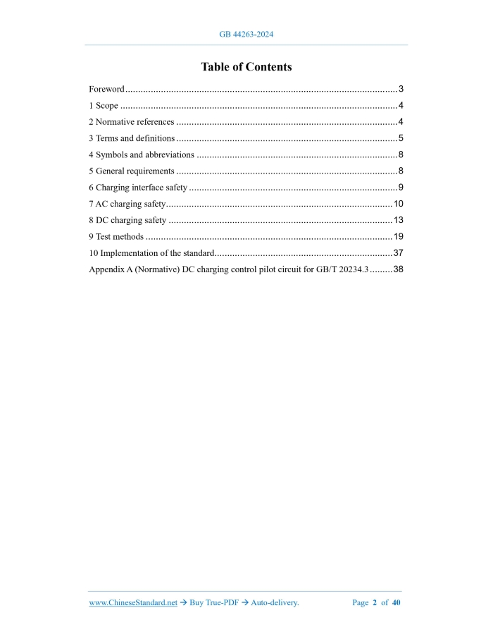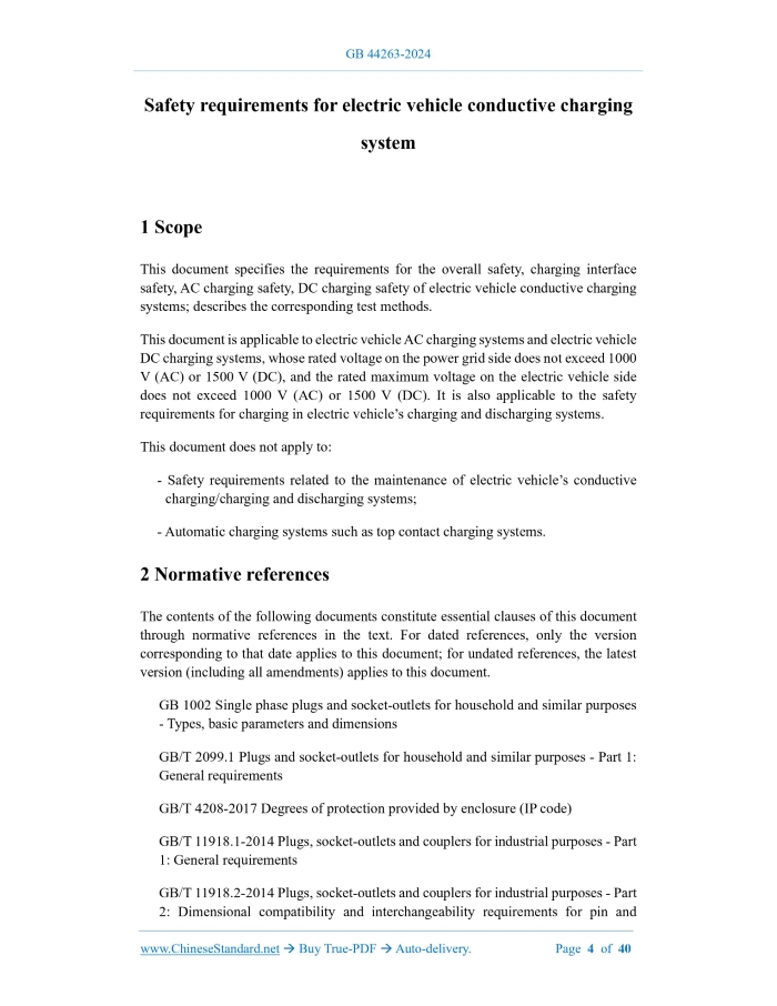 Similar standardsGB 44263-2024: Safety requirements for electric vehicle conductive charging system---This is an excerpt. Full copy of true-PDF in English version (including equations, symbols, images, flow-chart, tables, and figures etc.), auto-downloaded/delivered in 9 seconds, can be purchased online: https://www.ChineseStandard.net/PDF.aspx/GB44263-2024GB NATIONAL STANDARD OF THE PEOPLE’S REPUBLIC OF CHINA ICS 43.040.99 CCS T 35 Safety requirements for electric vehicle conductive charging system Issued on. JULY 24, 2024 Implemented on. AUGUST 01, 2025 Issued by. State Administration for Market Regulation; National Standardization Administration. Table of ContentsForeword... 3 1 Scope... 4 2 Normative references... 4 3 Terms and definitions... 5 4 Symbols and abbreviations... 8 5 General requirements... 8 6 Charging interface safety... 9 7 AC charging safety... 10 8 DC charging safety... 13 9 Test methods... 19 10 Implementation of the standard... 37 Appendix A (Normative) DC charging control pilot circuit for GB/T 20234.3... 38ForewordThis document was drafted in accordance with the provisions of GB/T 1.1-2020 "Directives for standardization - Part 1.Rules for the structure and drafting of standardizing documents". Please note that some contents of this document may involve patents. The issuing agency of this document does not assume the responsibility for identifying patents. This document was proposed by AND shall be under the jurisdiction of the Ministry of Industry and Information Technology of the People's Republic of China and the National Energy Administration (responsible according to the division of responsibilities). Safety requirements for electric vehicle conductive charging system1 ScopeThis document specifies the requirements for the overall safety, charging interface safety, AC charging safety, DC charging safety of electric vehicle conductive charging systems; describes the corresponding test methods. This document is applicable to electric vehicle AC charging systems and electric vehicle DC charging systems, whose rated voltage on the power grid side does not exceed 1000 V (AC) or 1500 V (DC), and the rated maximum voltage on the electric vehicle side does not exceed 1000 V (AC) or 1500 V (DC). It is also applicable to the safety requirements for charging in electric vehicle’s charging and discharging systems. This document does not apply to. - Safety requirements related to the maintenance of electric vehicle’s conductive charging/charging and discharging systems; - Automatic charging systems such as top contact charging systems.2 Normative referencesThe contents of the following documents constitute essential clauses of this document through normative references in the text. For dated references, only the version corresponding to that date applies to this document; for undated references, the latest version (including all amendments) applies to this document. GB 1002 Single phase plugs and socket-outlets for household and similar purposes - Types, basic parameters and dimensions GB/T 2099.1 Plugs and socket-outlets for household and similar purposes - Part 1. General requirements GB/T 4208-2017 Degrees of protection provided by enclosure (IP code) GB/T 11918.1-2014 Plugs, socket-outlets and couplers for industrial purposes - Part 1.General requirements GB/T 11918.2-2014 Plugs, socket-outlets and couplers for industrial purposes - Part 2.Dimensional compatibility and interchangeability requirements for pin and contact-tube accessories GB 18384 Electric vehicles safety requirements GB/T 18487.1-2023 Electric vehicle conductive charging system - Part 1.General requirements GB/T 20234.1-2023 Connection set for conductive charging of electric vehicles - Part 1.General requirements3 Terms and definitionsThe terms and definitions as defined in GB/T 18487.1-2023 and GB/T 20234.4, as well as the following terms and definitions, apply to this document. 3.1 Electric vehicle conductive charging system Electric vehicle charging system using conductive charging.4 Symbols and abbreviations4.1 Symbols The following symbols apply to this document. 4.2 Abbreviations The following abbreviations apply to this document.5 General requirements5.1 Conditions for use of electric vehicle charging mode 5.1.1 Mode 1 specified in 5.1 of GB/T 18487.1-2023 shall not be used to charge electric vehicles. 5.1.2 When the power supply side uses a 10 A (AC) single-phase two-pole grounded plug that complies with the requirements of GB/T 2099.1 and GB 1002, the output current shall not exceed 8 A (AC). 5.2 Prerequisites for the implementation of this document The prerequisite for the implementation of this document is that the power supply equipment shall comply with the provisions of GB 39752 and the electric vehicle shall comply with the provisions of GB 18384.6 Charging interface safety6.1 Charging interface protection level The protection level of the charging interface against dangerous parts shall meet the following requirements. 6.2 Charging interface temperature protection function 6.2.1 AC charging interface temperature protection function The AC charging interface has the following temperature protection functions. 6.2.2 DC vehicle interface temperature protection function The DC vehicle interface has the following temperature protection functions.7 AC charging safety7.1 System design safety 7.1.1 Control pilot circuit The AC power supply system has a control pilot function. 7.1.2 Charging cable current carrying capacity detection function Electric vehicles shall have the ability to confirm the rated capacity of the charging cable, by monitoring whether the resistance value between testing point 3 and PE complies with Table A.5 in GB/T 18487.1-2023. 7.1.3 Equipment power supply capacity declaration function The AC power supply equipment shall be able to inform the electric vehicle of the current power supply capacity, by setting the PWM signal duty cycle. The relationship between the dut