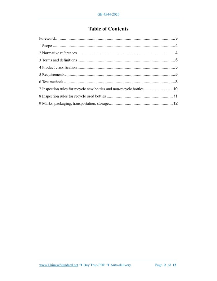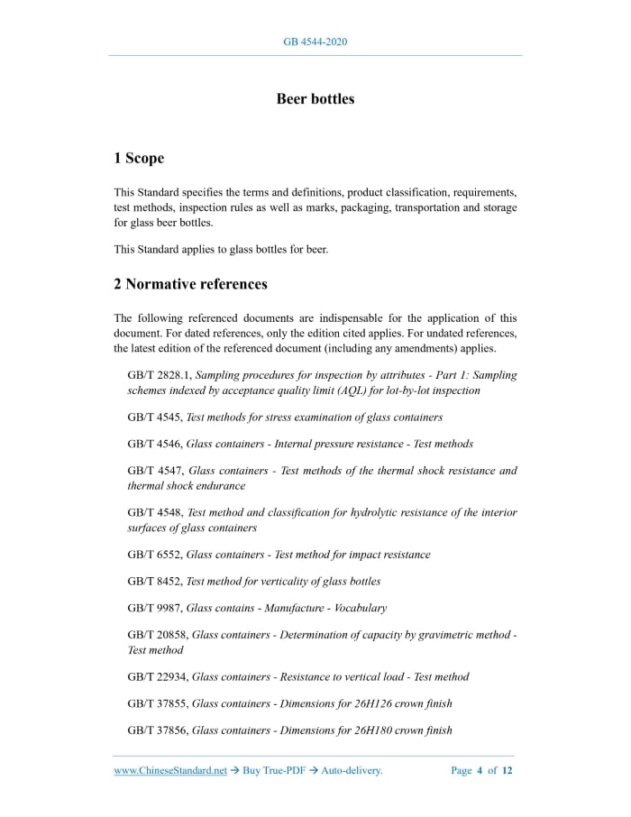 Similar standardsGB 4544-2020: Beer bottles---This is an excerpt. Full copy of true-PDF in English version (including equations, symbols, images, flow-chart, tables, and figures etc.), auto-downloaded/delivered in 9 seconds, can be purchased online: https://www.ChineseStandard.net/PDF.aspx/GB4544-2020GB NATIONAL STANDARD OF THE PEOPLE’S REPUBLIC OF CHINA ICS 55.100 Y 22 Replacing GB 4544-1996 Beer bottles 啤酒瓶 ISSUED ON: JULY 23, 2020 IMPLEMENTED ON: AUGUST 01, 2021 Issued by: State Administration for Market Regulation; Standardization Administration of the People's Republic of China. Table of ContentsForeword ... 3 1 Scope ... 4 2 Normative references ... 4 3 Terms and definitions ... 5 4 Product classification ... 5 5 Requirements ... 5 6 Test methods ... 8 7 Inspection rules for recycle new bottles and non-recycle bottles ... 10 8 Inspection rules for recycle used bottles ... 11 9 Marks, packaging, transportation, storage ... 12 Beer bottles1 ScopeThis Standard specifies the terms and definitions, product classification, requirements, test methods, inspection rules as well as marks, packaging, transportation and storage for glass beer bottles. This Standard applies to glass bottles for beer.2 Normative referencesThe following referenced documents are indispensable for the application of this document. For dated references, only the edition cited applies. For undated references, the latest edition of the referenced document (including any amendments) applies. GB/T 2828.1, Sampling procedures for inspection by attributes - Part 1: Sampling schemes indexed by acceptance quality limit (AQL) for lot-by-lot inspection GB/T 4545, Test methods for stress examination of glass containers GB/T 4546, Glass containers - Internal pressure resistance - Test methods GB/T 4547, Glass containers - Test methods of the thermal shock resistance and thermal shock endurance GB/T 4548, Test method and classification for hydrolytic resistance of the interior surfaces of glass containers GB/T 6552, Glass containers - Test method for impact resistance GB/T 8452, Test method for verticality of glass bottles GB/T 9987, Glass contains - Manufacture - Vocabulary GB/T 20858, Glass containers - Determination of capacity by gravimetric method - Test method GB/T 22934, Glass containers - Resistance to vertical load - Test method GB/T 37855, Glass containers - Dimensions for 26H126 crown finish GB/T 37856, Glass containers - Dimensions for 26H180 crown finish3 Terms and definitionsFor the purposes of this document, the terms and definitions defined in GB/T 9987 as well as the followings apply. 3.1 recycle beer bottle Beer bottles that are designed to be refilled with beer multiple times. 3.2 recycle new bottle Recycle beer bottles that have not yet been filled with beer, and can be handed over and accepted. 3.3 recycle used bottle Recycle beer bottles that have already been filled with beer and can be refilled with beer. 3.4 non-recycle bottle Beer bottles that are designed to be non-refillable.4 Product classification4.1 Beer bottles are classified into recycle beer bottles and non-recycle bottles according to the way they are used. 4.2 Recycle beer bottles can be divided into recycle new bottles and recycle used bottles according to the state of use.5 Requirements5.1 Physical and chemical properties The physical and chemical properties shall meet the requirements in Table 1. There shall be no calculus on the sealing surface. There shall be no calculus with a diameter greater than 1.5 mm in the remaining parts. There are no more than 2 calculus with a diameter of 0.3 mm ~ 1.5 mm and no cracks around each bottle. 5.3.2 Cracks There shall be none. 5.3.3 Air bubbles There shall be no broken air bubbles and surface bubbles. There shall be no air bubbles of which the diameter is greater than 3 mm. No more than 3 bubbles of which the diameter is 1 mm ~ 3 mm per bottle. For air bubbles below 1 mm, there are no more than 5 per square centimeter. 5.3.4 Defects of bottle mouth There shall be no defects affecting the sealing and safe use on the sealing surface of the bottle mouth. There shall be no flying thorns, poor forming and misalignment at the bottle mouth. 5.3.5 Inner wall defects There shall be no sticky material, spikes, glass wires, and glass fragments on the inner wall of the bottle. 5.3.6 Sutures and surface defects There shall be no sharp and prickly sutures and obvious initial sutures. There shall be no severe and obvious streaks, cold spots, stains and other defects that seriously affect the appearance. When necessary, it can also be subject to the sealed sample confirmed by both the supplier and the buyer. 5.3.7 Bottom knurling There shall be knurling on the support surface of the bottom of the bottle.6 Test methods6.1 Physical and chemical properties 6.1.1 Vertical load strength According to the provisions of GB/T 22934. Pressurize at a propulsion speed of 2 mm/min. 6.1.2 Resistance to internal pressure According to the provisions of GB/T 4546. 6.1.3 Thermal shock resistance According to the provisions of the passing test in GB/T 4547. 6.1.4 Shock resistance According to the provisions of the passing test in GB/T 6552. During the impact test, the impact point is located in the middle of the bottle body, and the suture shall be avoided. 6.1.5 Internal stress According to the provisions of GB/T 4545. 6.1.6 Water resistance of inner surface According to the provisions of GB/T 4548. 6.2 Specifications and sizes 6.2.1 Mouthful capacity According to the provisions of GB/T 20858. 6.2.2 Bottle height Measure with a height vernier caliper or a height measuring device with a graduation value of 0.02 mm. 6.2.3 Bottle outer diameter Measure the maximum outer diameter of the bottle with a vernier caliper, gauge or other outer diameter measuring device of which the division value is 0.02 mm. Any point on the same cross-section shall meet the requirements. 6.2.4 Vertical axis deviation According to the provisions of GB/T