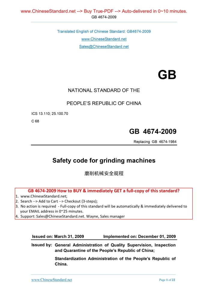 GB 4674-2009: Safety code for grinding machines Delivery: 9 seconds. True-PDF full-copy in English & invoice will be downloaded + auto-delivered via email. See step-by-step procedure Status: Valid GB 4674: Historical versions