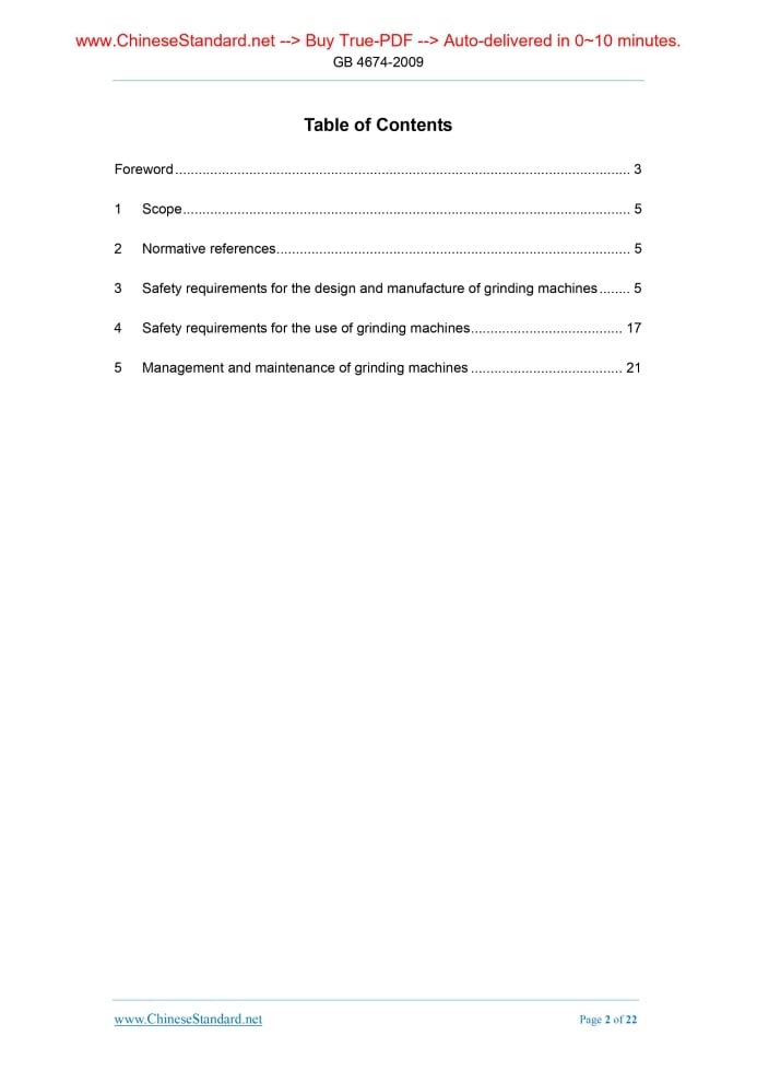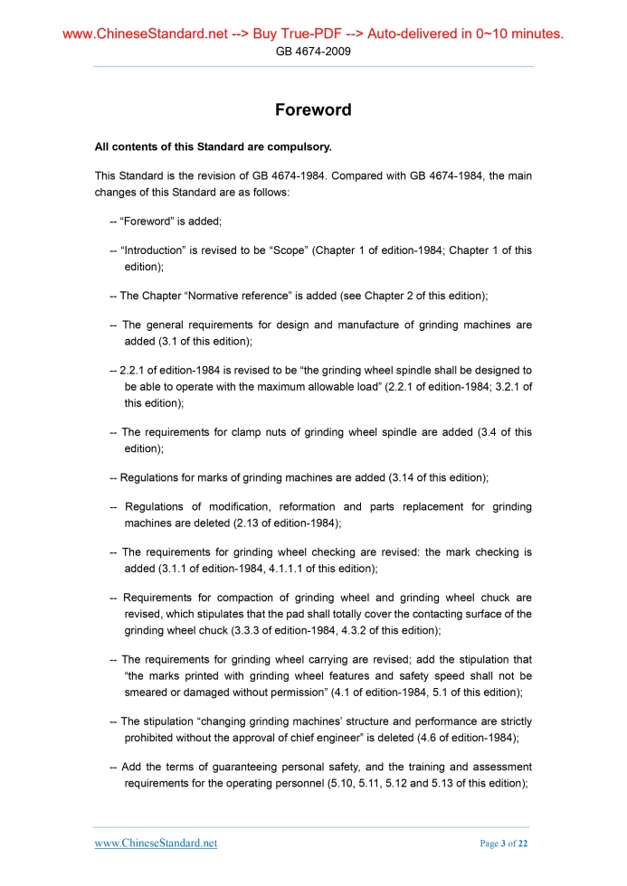 GB 4674-2009: Safety code for grinding machines---This is an excerpt. Full copy of true-PDF in English version (including equations, symbols, images, flow-chart, tables, and figures etc.), auto-downloaded/delivered in 9 seconds, can be purchased online: https://www.ChineseStandard.net/PDF.aspx/GB4674-2009GB NATIONAL STANDARD OF THE PEOPLE’S REPUBLIC OF CHINA ICS 13.110; 25.100.70 C 68 Replacing GB 4674-1984 Safety code for grinding machines Issued on: MARCH 31, 2009 Implemented on: DECEMBER 01, 2009 Issued by. General Administration of Quality Supervision, Inspection and Quarantine of the People’s Republic of China; Standardization Administration of the People’s Republic of China. Table of ContentsForeword... 3 1 Scope... 5 2 Normative references... 5 3 Safety requirements for the design and manufacture of grinding machines... 5 4 Safety requirements for the use of grinding machines... 17 5 Management and maintenance of grinding machines... 21ForewordAll contents of this Standard are compulsory. This Standard is the revision of GB 4674-1984.Compared with GB 4674-1984, the main changes of this Standard are as follows. -- “Foreword” is added; -- “Introduction” is revised to be “Scope” (Chapter 1 of edition-1984; Chapter 1 of this edition); -- The Chapter “Normative reference” is added (see Chapter 2 of this edition); -- The general requirements for design and manufacture of grinding machines are added (3.1 of this edition); -- 2.2.1 of edition-1984 is revised to be “the grinding wheel spindle shall be designed to be able to operate with the maximum allowable load” (2.2.1 of edition-1984; 3.2.1 of this edition); -- The requirements for clamp nuts of grinding wheel spindle are added (3.4 of this edition); -- Regulations for marks of grinding machines are added (3.14 of this edition); -- Regulations of modification, reformation and parts replacement for grinding machines are deleted (2.13 of edition-1984); -- The requirements for grinding wheel checking are revised. the mark checking is added (3.1.1 of edition-1984, 4.1.1.1 of this edition); -- Requirements for compaction of grinding wheel and grinding wheel chuck are revised, which stipulates that the pad shall totally cover the contacting surface of the grinding wheel chuck (3.3.3 of edition-1984, 4.3.2 of this edition); -- The requirements for grinding wheel carrying are revised; add the stipulation that “the marks printed with grinding wheel features and safety speed shall not be smeared or damaged without permission” (4.1 of edition-1984, 5.1 of this edition); -- The stipulation “changing grinding machines’ structure and performance are strictly prohibited without the approval of chief engineer” is deleted (4.6 of edition-1984); -- Add the terms of guaranteeing personal safety, and the training and assessment requirements for the operating personnel (5.10, 5.11, 5.12 and 5.13 of this edition); -- Appropriate revisions are made in text editing. This Standard was proposed by State Administration of State Work Safety Supervision Authority. This Standard shall be under the jurisdiction of National Technical Committee of Work Safety standardization. Drafting organization of this Standard. Tangshan Institute of China Coal Research Institute, Kailuan (Group) Co., Ltd., and CNR Tangshan Railway Vehicles Equipment Co., Ltd. Main drafters of this Standard. Zhang Wenjun, Wang Zhongchang, Zhang Ruixi, He Xiaoqun, Wei Guanghou, Chen ying, and Mou JianHua. Previous version replaced by this Standard is as follows. — GB 4674-1984. Safety Code for Grinding Machines1 ScopeThis Standard stipulates the safety technical requirements in design and manufacture, use, management and maintenance of grinding machines. This Standard applies to the grinding machines that use grinding wheel or grinding segment to conduce manual, mechanical or automatic process. This Standard does not apply to grinding processing machines that use grinding head with a handle, coated abrasive tools, oilstone and grinding paste.2 Normative referencesThe articles contained in the following documents have become part of this Standard when they are quoted herein. For the dated documents so quoted, all the modifications (excluding corrections) or revisions made thereafter shall not be applicable to this Standard. For the undated documents so quoted, the latest editions shall be applicable to this Standard. GB/T 6171 Hexagon nuts, style 1, with fine pitch thread (eqv ISO 8673.1999) GB 12348 Emission standard for industrial enterprises noise at boundary GB/T 16769 Metal-cutting machine tools - Measurement method of sound pressure level (neq ISO/DIS 230-5-2.1996) JB/T 9878 Measurement of dust concentration of metal-cutting machine tool3 Safety requirements for the design andmanufacture of grinding machines 3.1 General requirements 3.1.1 The design shall, as possible, eliminate or reduce all potential dangerous factors. 3.1.2 Necessary safety devices shall be adopted, in case of dangers that cannot be avoided or fully restrained through design. Table 1 The matching of grinding wheel hole diameter and the grinding wheel spindle or grinding wheel chuck (mm) Grinding wheel hole diameter Diameter of grinding wheel spindle or grinding wheel chuck Grinding methods H11 f7 Mirror-surface grinding, thread grinding, and high-speed grinding with running speed >45 m/s H12 e8 Fine grinding H13 e8 Corse grinding 3.3 Grinding wheel chuck 3.3.1 The diameter of grinding wheel chuck shall not be less than 1/3 of that of the grinding wheel. The diameter of the grinding wheel chuck for cutting-off wheel shall not be less than 1/4 of that of the grinding wheel. 3.3.2 For any form of grinding wheel chuck, the diameter of its left-right sides shall equal the radial width of the compaction surface. 3.3.3 The grinding wheel chuck shall be able to reliably transmit the driving force to the grinding wheel. 3.3.4 The grinding wheel chuck shall have enough stiffness to ensure that the 