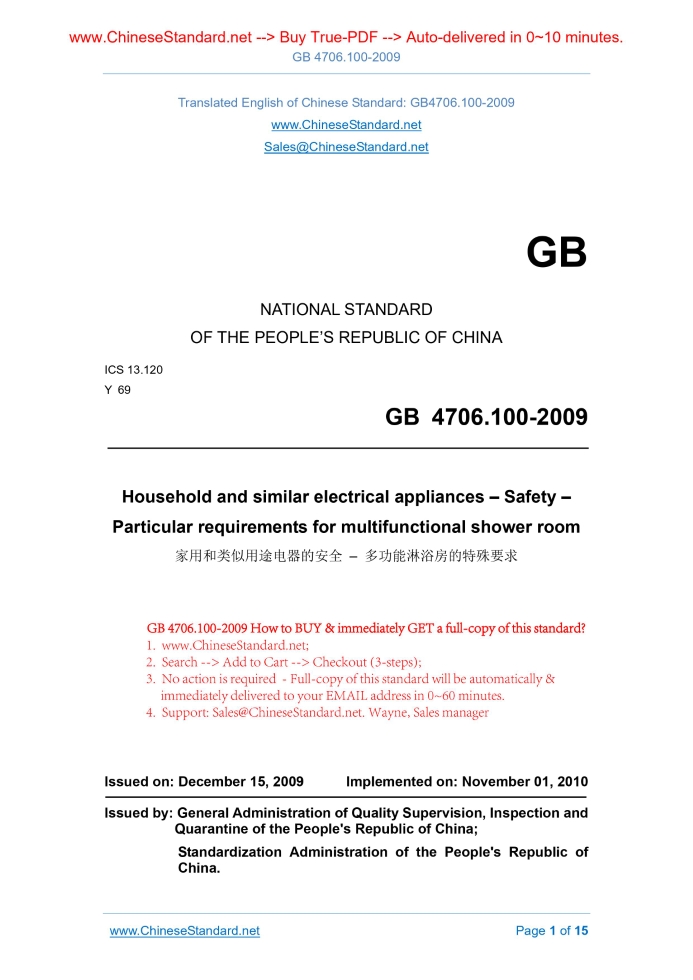 GB 4706.100-2009: Household and similar electrical appliances - Safety - Particular requirements for multifunctional shower room Delivery: 9 seconds. True-PDF full-copy in English & invoice will be downloaded + auto-delivered via email. See step-by-step procedure Status: Valid GB 4706.100: Historical versions