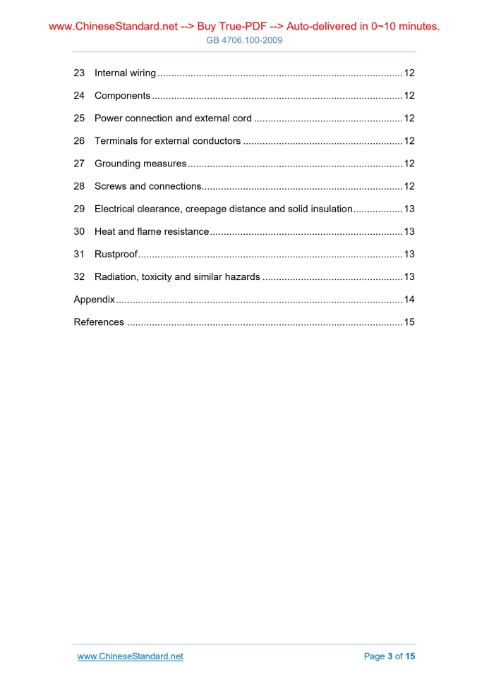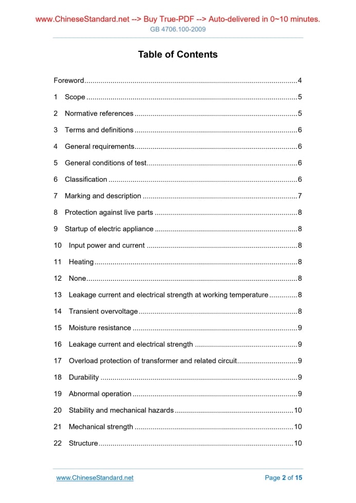 Similar standardsGB 4706.100-2009: Household and similar electrical appliances - Safety - Particular requirements for multifunctional shower room---This is an excerpt. Full copy of true-PDF in English version (including equations, symbols, images, flow-chart, tables, and figures etc.), auto-downloaded/delivered in 9 seconds, can be purchased online: https://www.ChineseStandard.net/PDF.aspx/GB4706.100-2009 GB NATIONAL STANDARD ICS 13.120 Y 69 Household and similar electrical appliances – Safety – Particular requirements for multifunctional shower room Issued on: DECEMBER 15, 2009 Implemented on: NOVEMBER 01, 2010 Issued by. General Administration of Quality Supervision, Inspection and Quarantine of the People's Republic of China; Standardization Administration of the People's Republic of China. 3.No action is required - Full-copy of this standard will be automatically & immediately delivered to your EMAIL address in 0~60 minutes. Table of ContentsForeword... 4 1 Scope... 5 2 Normative references... 5 3 Terms and definitions... 6 4 General requirements... 6 5 General conditions of test... 6 6 Classification... 6 7 Marking and description... 7 8 Protection against live parts... 8 9 Startup of electric appliance... 8 10 Input power and current... 8 11 Heating... 8 12 None... 8 13 Leakage current and electrical strength at working temperature... 8 14 Transient overvoltage... 8 15 Moisture resistance... 9 16 Leakage current and electrical strength... 9 17 Overload protection of transformer and related circuit... 9 18 Durability... 9 19 Abnormal operation... 9 20 Stability and mechanical hazards... 10 21 Mechanical strength... 10 22 Structure... 10 23 Internal wiring... 12 24 Components... 12 25 Power connection and external cord... 12 26 Terminals for external conductors... 12 27 Grounding measures... 12 28 Screws and connections... 12 29 Electrical clearance, creepage distance and solid insulation... 13 30 Heat and flame resistance... 13 31 Rustproof... 13 32 Radiation, toxicity and similar hazards... 13 Appendix... 14 References... 15ForewordAll technical contents of this part are mandatory. GB 4706 “Household and similar electrical appliances – Safety” is composed of several parts, the part 1 is general requirement AND the rest parts are special requirements. This part is part 100 of GB 4706. This part shall be used in conjunction with GB 4706.1-2005 “Household and similar electrical appliances – Safety – Part 1.General requirements”. The contents in this part which are indicated of “applicable” means that the corresponding clauses in GB 4706.1-2005 apply to this part; the contents in this part which are indicated of “replacement” or “modification” shall prevail; AND the contents in this part which are indicated of “addition” means that in addition to comply with the corresponding clauses of GB 4706.1-2005, it shall also comply with the clauses added in this part. This part was proposed by the China Light Industry Federation. This part shall be under the jurisdiction of the National Household Electrical Appliances Standardization Technical Committee. The main drafting organizations of this part. China Household Electrical Appliances Research Institute, National Household Electrical Appliances Quality Supervision and Inspection Center. The main drafters of this part. Ma Dejun, Lu Jianguo, Zhu Yan, Xu Zhengang, Sun Peng. Household and similar electrical appliances – Safety – Particular requirements for multifunctional shower room1 ScopeThis clause in GB 4706.1-2005 is replaced by the following. This part specifies the safety of the household and similar purposes multifunctional shower room for which the single-phase appliance has a rated voltage of not exceeding 250 V AND the other appliances have a rated voltage of not exceeding 480 V. Items that are not intended to be used as general household BUT which can still be dangerous to the public, such as appliances used by non-professionals in hotels, fitness centers and similar places, are within the scope of this part. This part deals with the general danger of the presence of appliances that are likely to be encountered in all residential and residential surroundings. This part does not cover. - The risk of using the appliances by unattended child and the disabled; - The risk of child playing appliances. Note 1.Note the following. - As for the shower room equipped on the vehicle, ship or aircraft, it may require additional requirements; - National health care departments, national labor protection departments, national water supply management departments and similar departments have provided additional requirements for appliances. Note 2.This section does not apply to. - The appliance designed for medical purposes; - The appliance intended to be used in special environmental conditions wherein corrosive or explosive gases (such as dust, steam, or gas) are frequently produced.2 Normative referencesThe provisions in following documents become the provisions of this Standard through reference in this part of GB 4706.For the dated references, the subsequent amendments (excluding corrections) or revisions do not apply to this Standard; however, parties who reach an agreement based on this Standard are encouraged to study if the latest versions of these documents are applicable. For undated references, the latest edition of the referenced document applies. This clause in GB 4706.1-2005 is applicable.3 Terms and definitionsThe following terms and definitions as established in GB 4706.1-2005 AND the following terms and definitions apply to this part of GB 4706. 3.1.9 Replacement. Normal operation The appliance shall work under the following conditions. All the sprinklers in the shower room reach the maximum flow rate, AND the heating device with heating function is opened to the maximum gear. 3.101 Multifunctional shower room It refers to the enclosed room which can provide jetting water current or electromagnetic