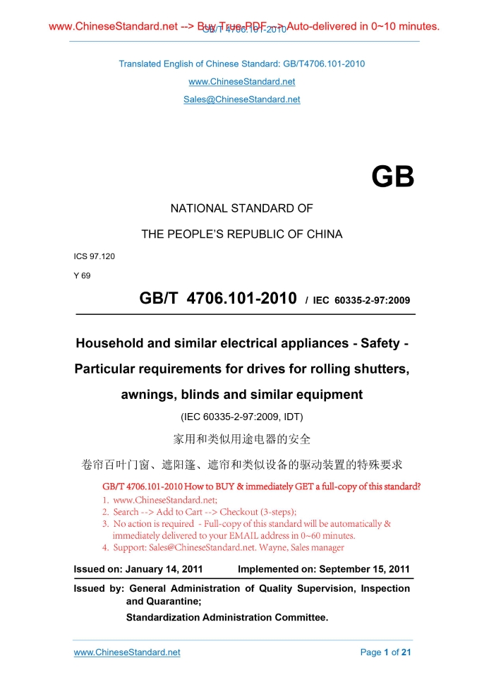 GB 4706.101-2010: Household and similar electrical appliances -- Safety -- Particular requirements for drives for rolling shutters, awnings, blinds and similar equipment Delivery: 9 seconds. True-PDF full-copy in English & invoice will be downloaded + auto-delivered via email. See step-by-step procedure Status: Valid GB 4706.101: Historical versions