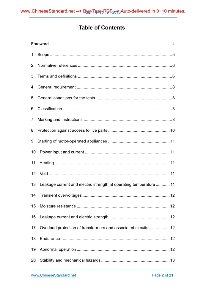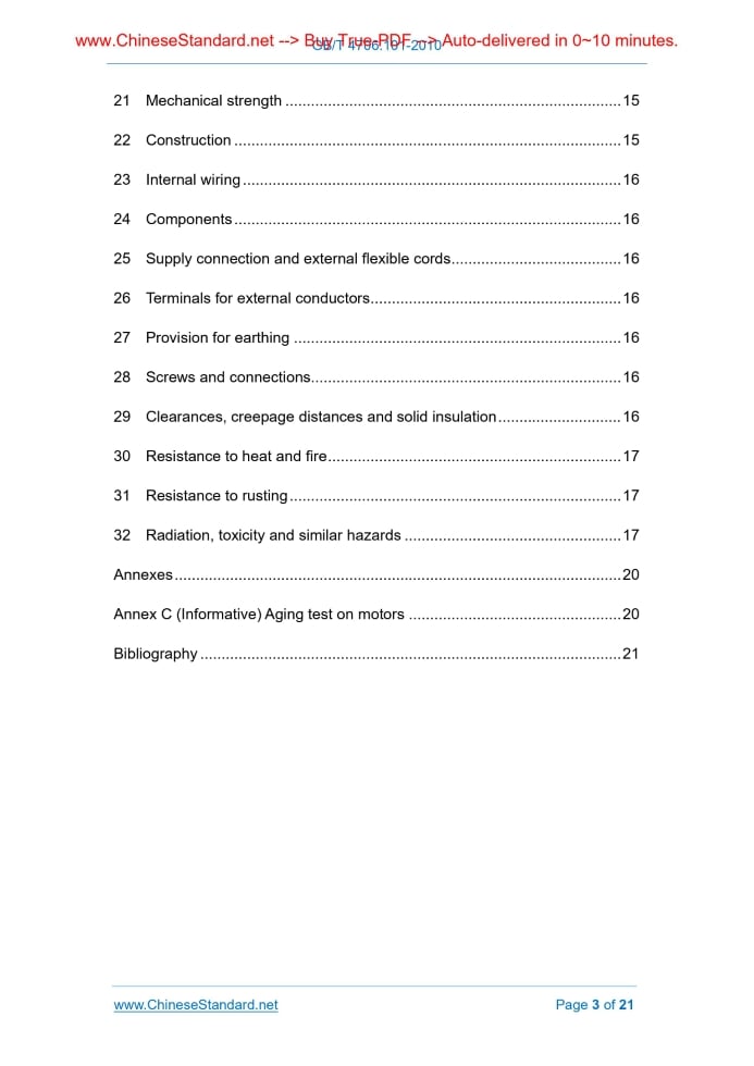 Similar standardsGB 4706.101-2010: Household and similar electrical appliances -- Safety -- Particular requirements for drives for rolling shutters, awnings, blinds and similar equipment---This is an excerpt. Full copy of true-PDF in English version (including equations, symbols, images, flow-chart, tables, and figures etc.), auto-downloaded/delivered in 9 seconds, can be purchased online: https://www.ChineseStandard.net/PDF.aspx/GB4706.101-2010 GB NATIONAL STANDARD OF THE PEOPLE’S REPUBLIC OF CHINA ICS 97.120 Y 69 GB/T 4706.101-2010 / IEC 60335-2-97.2009 Household and similar electrical appliances - Safety - Particular requirements for drives for rolling shutters, awnings, blinds and similar equipment (IEC 60335-2-97.2009, IDT) Issued on: JANUARY 14, 2011 Implemented on: SEPTEMBER 15, 2011 Issued by. General Administration of Quality Supervision, Inspection and Quarantine; Standardization Administration Committee. 3.No action is required - Full-copy of this standard will be automatically & immediately delivered to your EMAIL address in 0~60 minutes. Table of ContentsForeword... 4 1 Scope... 5 2 Normative references... 6 3 Terms and definitions... 6 4 General requirement... 8 5 General conditions for the tests... 8 6 Classification... 8 7 Marking and instructions... 8 8 Protection against access to live parts... 10 9 Starting of motor-operated appliances... 11 10 Power input and current... 11 11 Heating... 11 12 Void... 11 13 Leakage current and electric strength at operating temperature... 11 14 Transient overvoltages... 12 15 Moisture resistance... 12 16 Leakage current and electric strength... 12 17 Overload protection of transformers and associated circuits... 12 18 Endurance... 12 19 Abnormal operation... 12 20 Stability and mechanical hazards... 13 21 Mechanical strength... 15 22 Construction... 15 23 Internal wiring... 16 24 Components... 16 25 Supply connection and external flexible cords... 16 26 Terminals for external conductors... 16 27 Provision for earthing... 16 28 Screws and connections... 16 29 Clearances, creepage distances and solid insulation... 16 30 Resistance to heat and fire... 17 31 Resistance to rusting... 17 32 Radiation, toxicity and similar hazards... 17 Annexes... 20 Annex C (Informative) Aging test on motors... 20 Bibliography... 21ForewordAll technical contents of this Part are mandatory. GB 4706 Safety of household and similar electrical appliances consists of several parts. Part 1 is general requirements; the rest are particular requirements. This Part is the 101st Part of GB 4706. This Part shall be in use with GB 4706.1-2006 Safety of household and similar electrical appliances; General requirements. This Part was drafted in accordance with the rules given in GB/T 1.1-2009. This Part uses translation method to identically adopt IEC 60335-2-97.2009 Household and similar electrical appliances - Safety - Part 2-97.Particular requirements for drives for rolling shutters, awnings, blinds and similar equipment, including its Supplement 1 (2004) and Supplement 2 (2008). This Part made the following editorial modifications. - modified “Part 1” to “GB 4706.1”; - used decimal point “.” to replace “,” that was used as decimal point. Attention is drawn to the possibility that some of the elements of this Part may be the subject of patent rights. The issuing authority shall not be held responsible for identifying any or all such patent rights. This Part was proposed by China Light Industry Federation. This Part shall be under the jurisdiction of National Technical Committee on Home Appliances of Standardization Administration of China (SAC/TC 46). The drafting organizations of this Part. Shenzhen Inspection and Quarantine Science Research Institute, Foshan Quality Supervision and Inspection Center, Zhejiang Inspection and Quarantine Science and Technology Research Institute, China Household Electrical Appliances Research Institute, Zhejiang Quality and Technical Supervision and Testing Institute, Shanghai Entry-Exit Inspection and Quarantine Bureau Electromechanical Product Testing Technology Center, Ningbo Product Quality Supervision and Inspection Research Institute. Main drafters of this Part. Xie Jinxiong, Ou Zhuoma, Wang Chun, Wu MEng, Wang Xiaoling, Jiang Yingzhou, Chen Shan, Suo Yanyan, Zhang Dong. Household and similar electrical appliances - Safety - Particular requirements for drives for rolling shutters, awnings, blinds and similar equipment1 ScopeThis clause of GB 4706.1-2005 is replaced by the following. This Part of GB 4706 deals with the safety of electric drives for rolling equipment such as shutters, blinds and awnings, intended for household and similar purposes, their rated voltage being not more than 250 V for single-phase appliances and 480 V for other appliances. Drives for equipment with a spring-controlled driven part, such as a folding arm awning, are also within the scope of this Part. NOTE 101 Examples of rolling equipment that can be driven are - awnings; - blinds; - grilles covering doors and windows; - projection screens; - shutters covering doors and windows. Examples are shown in Figure 101. NOTE 102 Drives may be supplied with a driven part. Appliances not intended for normal household use but that nevertheless may be a source of danger to the public, such as appliances intended to be used by laymen in shops, in light industry, on farms and on industrial premises, are within the scope of this Part. As far as is practicable, this Part deals with the common hazards presented by appliances that are encountered by all persons in and around the home. However, in general, it does not take into account playing with the appliance by young children but recognizes that children may be in the vicinity. driven part shall not unroll in an uncontrolled manner. After 15 s, the driven part is retracted. The drive is then supplied at 0.9 times rated voltage and started 10 times from different positions in the rolling direction so as