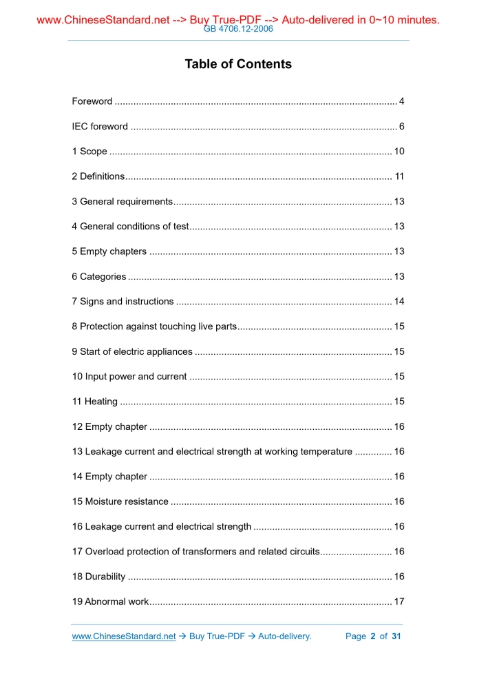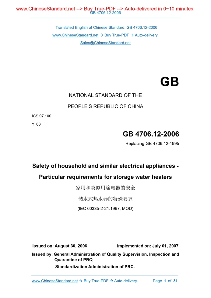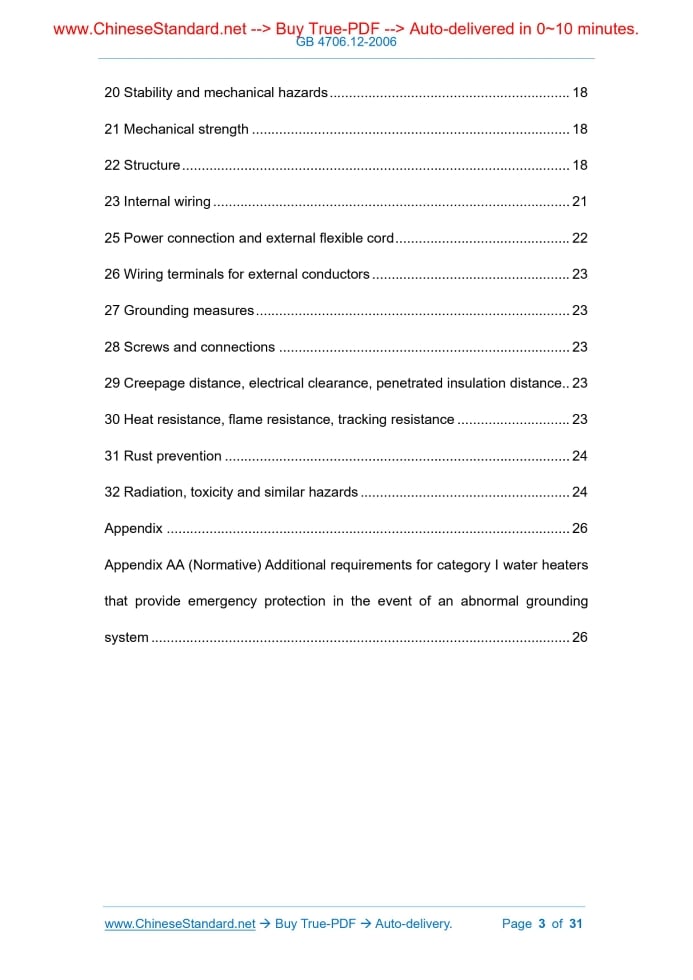 Similar standardsGB 4706.12-2006: Safety of household and similar electrical appliances -- Particular requirements for storage water heaters---This is an excerpt. Full copy of true-PDF in English version (including equations, symbols, images, flow-chart, tables, and figures etc.), auto-downloaded/delivered in 9 seconds, can be purchased online: https://www.ChineseStandard.net/PDF.aspx/GB4706.12-2006 NATIONAL STANDARD OF THE PEOPLE’S REPUBLIC OF CHINA ICS 97.100 Y 63 Replacing GB 4706.12-1995 Safety of household and similar electrical appliances - Particular requirements for storage water heaters (IEC 60335-2-21.1997, MOD) Issued on: AUGUST 30, 2006 Implemented on: JULY 01, 2007 Issued by. General Administration of Quality Supervision, Inspection and Quarantine of PRC; Standardization Administration of PRC. Table of ContentsForeword... 4 IEC foreword... 6 1 Scope... 10 2 Definitions... 11 3 General requirements... 13 4 General conditions of test... 13 5 Empty chapters... 13 6 Categories... 13 7 Signs and instructions... 14 8 Protection against touching live parts... 15 9 Start of electric appliances... 15 10 Input power and current... 15 11 Heating... 15 12 Empty chapter... 16 13 Leakage current and electrical strength at working temperature... 16 14 Empty chapter... 16 15 Moisture resistance... 16 16 Leakage current and electrical strength... 16 17 Overload protection of transformers and related circuits... 16 18 Durability... 16 19 Abnormal work... 17 20 Stability and mechanical hazards... 18 21 Mechanical strength... 18 22 Structure... 18 23 Internal wiring... 21 25 Power connection and external flexible cord... 22 26 Wiring terminals for external conductors... 23 27 Grounding measures... 23 28 Screws and connections... 23 29 Creepage distance, electrical clearance, penetrated insulation distance.. 23 30 Heat resistance, flame resistance, tracking resistance... 23 31 Rust prevention... 24 32 Radiation, toxicity and similar hazards... 24 Appendix... 26 Appendix AA (Normative) Additional requirements for category I water heaters that provide emergency protection in the event of an abnormal grounding system... 26ForewordAll contents of this part of GB 4706 are mandatory. GB 4706 " Safety of household and similar electrical appliances" is divided into the following parts. - Part I. General requirements; - Part II. Particular requirements. This part is the particular requirements for storage water heaters. This part replaces GB 4706.12-1995 "Safety of household and similar electrical appliances - Particular requirements for storage water heaters". This part modifies and adopts IEC 60335-2-21.1997.This part shall be used in conjunction with GB 4706.1-1998. This part is formed by adding or modifying GB 4706.1.The specific provisions in GB 4706.1 are not mentioned in this part, which means that the corresponding provisions in GB 4706.1 apply to this part. In this part, the portion indicated as “applicable” means that the corresponding provisions in GB 4706.1 are applicable to this part. In this part, the portion indicated as “replaced” means that the provisions of this part shall prevail. In this part, the portion indicated as “added” means that in addition to the corresponding provisions of GB 4706.1, it must also comply with the provisions added in this part. The main difference between this part and IEC 60335-2-21.1997 is the addition of Appendix AA (normative). Appendix AA to this part is a normative appendix. This part was proposed by China Light Industry Federation. This part shall be under the jurisdiction and interpretation of the National Household Appliance Standardization Technical Committee (SAC/TC 46). Drafting organizations of this part. China Household Electrical Appliances Research Institute, Haier Water Heater Co., Ltd., Aio Smith (China) Water Heater Co., Ltd., Shuaikang Water Heater Co., Ltd., Kangquan Water Heater Co., Ltd., Meroni Sanitary Ware (China) Co., Ltd., Shenzhen Entry& Exit Inspection and Quarantine Bureau. The main drafters of this part. Ma Dejun, Hou Quanduo, Wan Huaxin, Li Yi, Zhang Huibao, Xu Zhong, Xie Jinxiong, Ji Bing. Safety of household and similar electrical appliances - Particular requirements for storage water heaters1 ScopeThis chapter of GB 4706.1-1998 is replaced by the following. This part of GB 4706 relates to the safety of storage water heaters whose single-phase appliances have a rated voltage not exceeding 250 V, and other appliances whose rated voltage does not exceed 480 V for domestic and similar purposes. Appliances that are not intended for general household use but still pose a danger to the public, such as appliances intended for use by persons without knowledge of electricity in shops, light industries, and farms are also within the scope of this part. As a practical matter, this part deals with general hazards that arise from appliances that can be encountered by everyone in the home and surrounding environment. This part generally does not consider the following situations. - Appliances used by children, old, young, sick, and weak without care; - Children playing with appliances. Note 1.Attention is drawn to the following. - Additional requirements may be required for appliances intended for use on plateaus; - Additional requirements may be required for appliances intended for use on a vehicle, ship or aircraft; - Additional requirements may be required for appliances intended for use in tropical countries; - Additional requirements have been developed by health, labor protection, water and similar authorities in many countries; - In many countries there are also installation regulations for appliances connected to water. Note 2.This part does not apply to. - Appliances for boiling water (IEC 60335-2-15); - Fast-heating water heater (IEC 60335-2-35); - Commercial electric hot water boilers and liquid heaters (IEC 60335-2-63); - Commercial vending machines (IEC 60335-2-75); - Appliances intended for industrial use; - Equ