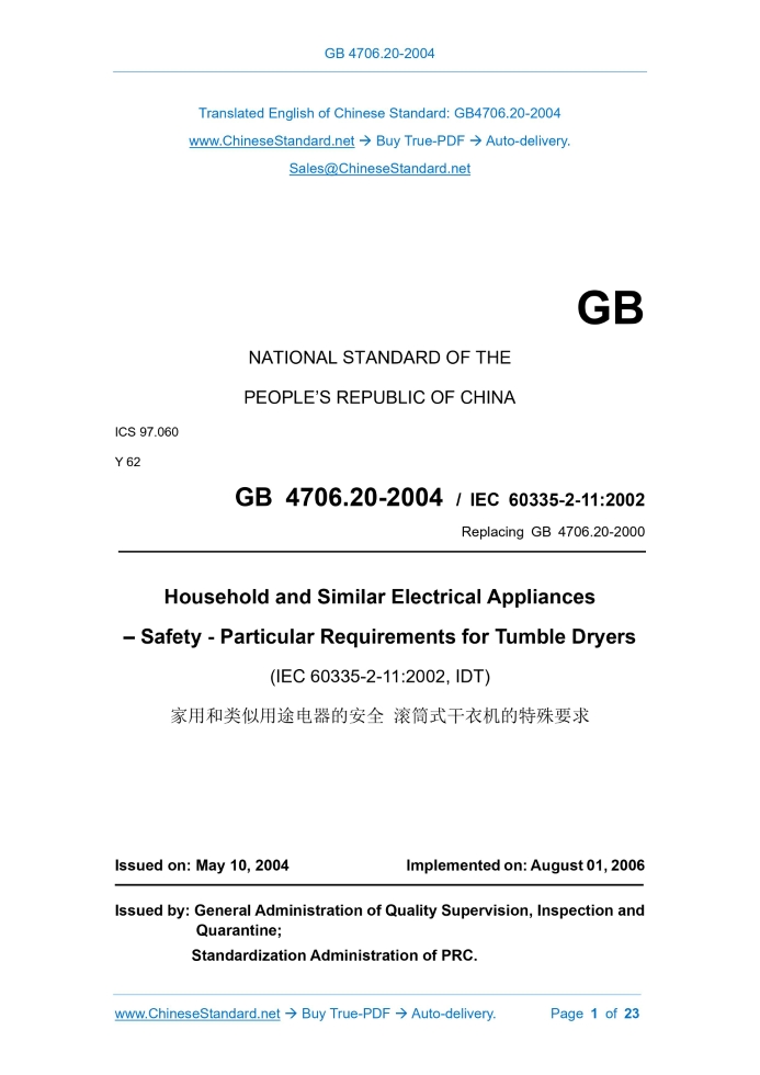 GB 4706.20-2004: Safety of household and similar electrical appliances -- Safety -- Particular requirements for tumble dryers Delivery: 9 seconds. True-PDF full-copy in English & invoice will be downloaded + auto-delivered via email. See step-by-step procedure Status: Valid GB 4706.20: Historical versions