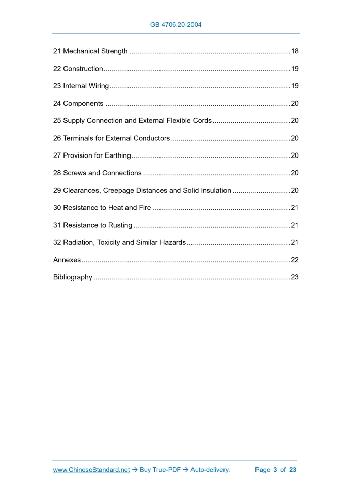 Similar standardsGB 4706.20-2004: Safety of household and similar electrical appliances -- Safety -- Particular requirements for tumble dryers---This is an excerpt. Full copy of true-PDF in English version (including equations, symbols, images, flow-chart, tables, and figures etc.), auto-downloaded/delivered in 9 seconds, can be purchased online: https://www.ChineseStandard.net/PDF.aspx/GB4706.20-2004 GB NATIONAL STANDARD OF THE PEOPLE’S REPUBLIC OF CHINA ICS 97.060 Y 62 GB 4706.20-2004 / IEC 60335-2-11.2002 Replacing GB 4706.20-2000 Household and Similar Electrical Appliances – Safety - Particular Requirements for Tumble Dryers (IEC 60335-2-11.2002, IDT) Issued on: MAY 10, 2004 Implemented on: AUGUST 01, 2006 Issued by. General Administration of Quality Supervision, Inspection and Quarantine; Standardization Administration of PRC. Table of ContentsForeword... 4 IEC Foreword... 6 1 Scope... 9 2 Normative References... 10 3 Definitions... 10 4 General Requirement... 11 5 General Conditions for the Tests... 11 6 Classification... 11 7 Marking and Instructions... 11 8 Protection against Access to Live Parts... 13 9 Starting of Motor-Operated Appliances... 13 10 Power Input and Current... 13 11 Heating... 13 12 Void... 14 13 Leakage Current and Electric Strength at Operating Temperature... 15 14 Transient Over-Voltages... 15 15 Moisture Resistance... 15 16 Leakage Current and Electric Strength... 16 17 Overload Protection of Transformers and Associated Circuits... 16 18 Endurance... 16 19 Abnormal Operation... 16 20 Stability and Mechanical Hazards... 17 21 Mechanical Strength... 18 22 Construction... 19 23 Internal Wiring... 19 24 Components... 20 25 Supply Connection and External Flexible Cords... 20 26 Terminals for External Conductors... 20 27 Provision for Earthing... 20 28 Screws and Connections... 20 29 Clearances, Creepage Distances and Solid Insulation... 20 30 Resistance to Heat and Fire... 21 31 Resistance to Rusting... 21 32 Radiation, Toxicity and Similar Hazards... 21 Annexes... 22 Bibliography... 23ForewordAll the technical contents of this Part of GB 4706 are mandatory. This Part revised GB 4706.20-2000 Safety of Household and Similar Electrical Appliances - Particular Requirements for Tumbler Dryers. This Part equivalently adopted IEC 60335-2-11.2002 Household and Similar Electrical Appliances - Safety – Part 2.Particular Requirements for Tumble Dryers. This Part is used in conjunction with GB 4706.1-2005 (equivalently adopts IEC 60335-1.2001, Amendment 1, namely, Edition 4.1). If the version difference may cause problems in the use of this Part, the corresponding version of the IEC original text standard shall be referred to. The “applicable” part of this Part indicates that the corresponding clauses in GB 4706.1 is applicable to this Part. The part that says “replacement” or “modification” in this Part shall be subject to this Part. The part that says "addition" means that in addition to complying with the corresponding clauses of GB 4706.1, it shall also comply with the clauses added in this Part. This Part replaced GB 4706.20-2000.The major differences between this Part and GB 4706.20-2000 are as follows. 1.Change Clause 2 "Definition" into Clause 2 "Normative References"; change Clause 3 "General Requirements" into Clause 3 "Definition"; change Clause 4 "General Conditions of Tests" into Clause 4 "General Requirements"; change Clause 5 "Void" into Clause 5 "General Conditions of Tests". 2.In Clause 3, add the definition of tumble dryer; and the definition of exhaust type tumble dryer is limited to condensing tumble dryer. 3.In Clause 7, add the content of 7.6; and add the requirement for the description of 7.6 symbols in 7.12; add the requirements of “it is not allowed to emit gas to the flue of the burning gas or appliances of other materials” in 7.12.1; add the content of 7.102. 4.Add Clause14 "Transient Overvoltage". 5.In Clause 19, add the requirements of “it is a more unfavourable working condition for the appliance connected to the water source, if it works without water. The test is carried out with the water inlet valve closed. This Water inlet valve shall not be closed after the appliance starts to operate” in 19.1.Add the requirements of “for the condensing tumble dryer, repeat the test; but 75% of the condenser air outlet are shall be blocked, then carry out the blocking test of all air outlet” in 19.4.Change the content of 19.102 into "The Test C in IEC 61032 refers to the Household and Similar Electrical Appliances – Safety - Particular Requirements for Tumble Dryers1 ScopeThis clause of GB 4706.1 is replaced by the following. This International Standard deals with the safety of electric tumble dryers intended for household and similar purposes, their rated voltage being not more than 250 V for single-phase appliances and 480 V for other appliances. NOTE 101.This Part applies to the drying function of washing machines having a drying cycle. Appliances not intended for normal household use but which nevertheless may be a source of danger to the public, such as appliances intended to be used by laymen in shops, in light industry and on farms are within the scope of this Part. NOTE 102.Examples of such appliances are tumble dryers for communal use in blocks of flats or in launderettes. As far as is practicable, this standard deals with the common hazards presented by appliances that are encountered by all persons in and around the home. However, in general, it does not take into account – the use of appliances by young children or infirm persons without supervision; – playing with the appliance by young children. NOTE 103.Attention is drawn to the fact that – for appliances intended to be used in vehicles or on-board ships or aircraft, additional requirements may be necessary; – in many countries additional requirements are specified by the national health authorities, the national authorities responsible for the protect