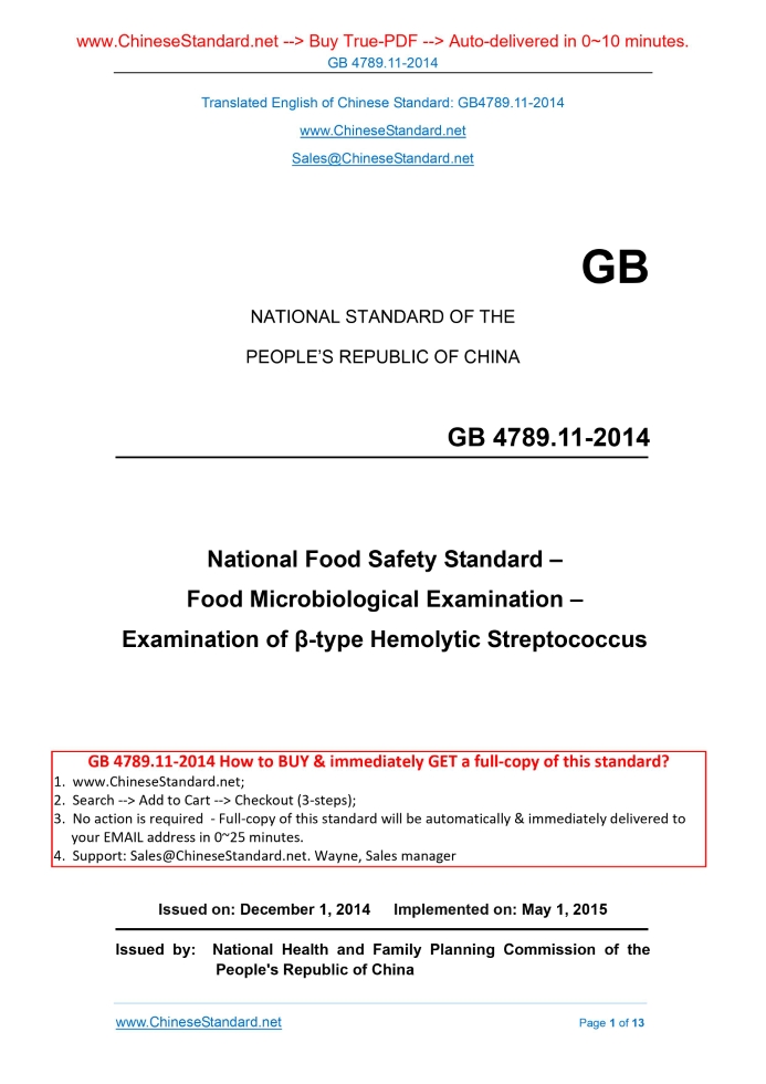 GB 4789.11-2014: National Food Safety Standard -- Microbiological Examination of Food Hygiene -- Examination of Streptococcus Hemolyticus Delivery: 9 seconds. True-PDF full-copy in English & invoice will be downloaded + auto-delivered via email. See step-by-step procedure Status: Valid GB 4789.11: Historical versions