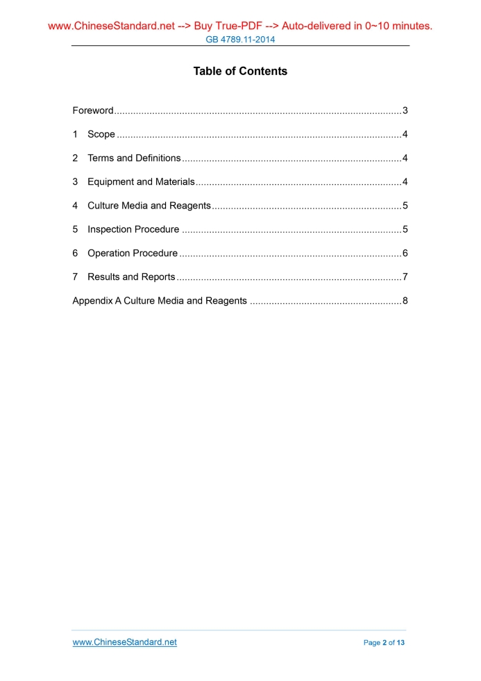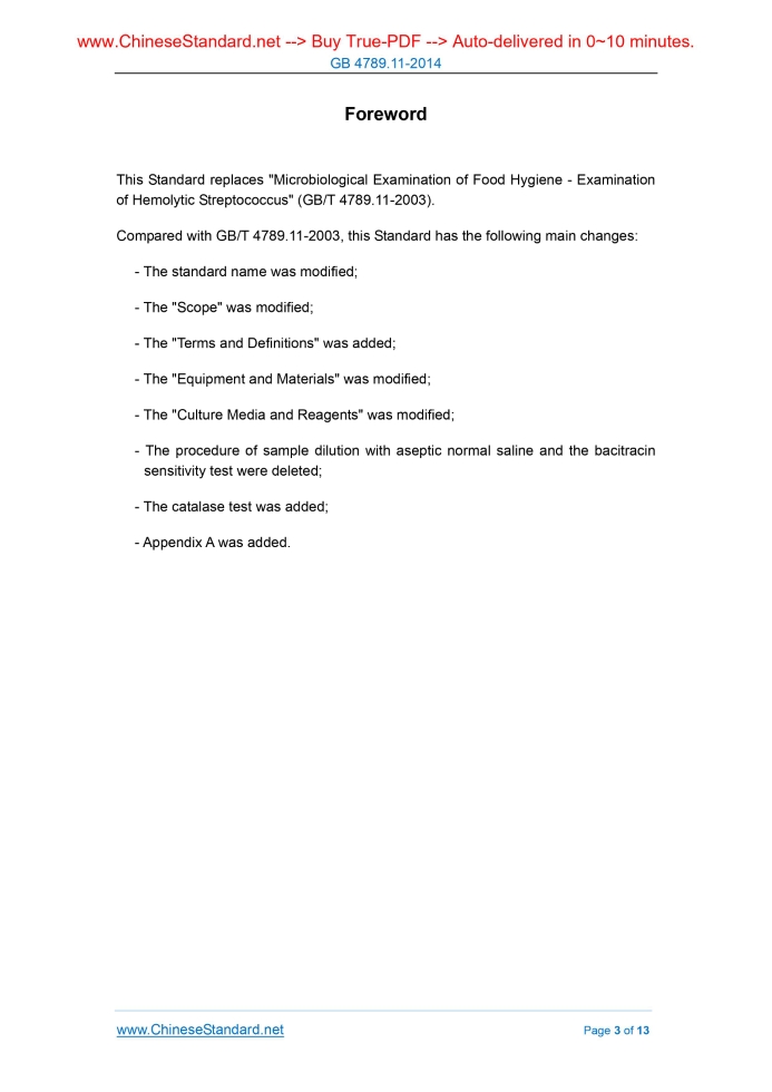 Similar standardsGB 4789.11-2014: National Food Safety Standard -- Microbiological Examination of Food Hygiene -- Examination of Streptococcus Hemolyticus---This is an excerpt. Full copy of true-PDF in English version (including equations, symbols, images, flow-chart, tables, and figures etc.), auto-downloaded/delivered in 9 seconds, can be purchased online: https://www.ChineseStandard.net/PDF.aspx/GB4789.11-2014 GB NATIONAL STANDARD OF THE PEOPLE’S REPUBLIC OF CHINA National Food Safety Standard – Food Microbiological Examination – Examination of β-type Hemolytic Streptococcus Issued on. DECEMBER 1, 2014 Implemented on. MAY 1, 2015 Issued by. National Health and Family Planning Commission of the People's Republic of China Table of ContentsForeword... 3 1 Scope... 4 2 Terms and Definitions... 4 3 Equipment and Materials... 4 4 Culture Media and Reagents... 5 5 Inspection Procedure... 5 6 Operation Procedure... 6 7 Results and Reports... 7 Appendix A Culture Media and Reagents... 8ForewordThis Standard replaces "Microbiological Examination of Food Hygiene - Examination of Hemolytic Streptococcus" (GB/T 4789.11-2003). Compared with GB/T 4789.11-2003, this Standard has the following main changes. - The standard name was modified; - The "Scope" was modified; - The "Terms and Definitions" was added; - The "Equipment and Materials" was modified; - The "Culture Media and Reagents" was modified; - The procedure of sample dilution with aseptic normal saline and the bacitracin sensitivity test were deleted; - The catalase test was added; - Appendix A was added. National Food Safety Standard – Food Microbiological Examination – Examination of β-type Hemolytic Streptococcus1 ScopeThis Standard specifies the inspection method for β-type hemolytic streptococcus in foods. This Standard is applicable to inspection of β-type hemolytic streptococcus in foods.2 Terms and Definitions2.1 β-type hemolysis Totally transparent hemolytic rings are formed around the bacterial colony, and the erythrocytes are fully dissolved. 2.2 β-type hemolytic streptococcus It can produce β-type hemolytic streptococcus pyogenes (or A-group) and streptococcus agalactiae (or B-group).3 Equipment and MaterialsIn addition to the conventional sterilization and cultivation equipment in microbiological laboratory, other equipment and materials are as follows.4 Culture Media and Reagents4.1 Modified tryptone soybean broth (mTSB). see A.1 of Appendix A. 4.2 Columbia CNA blood agar. see A.2 of Appendix A. 4.3 Columbia blood agar. see A.3 of Appendix A. 4.4 Gram stain solution. see A.4 of Appendix A. 4.8 3% hydrogen peroxide (H2O2) solution. see A.8 of Appendix A. 4.9 Biochemical identification kit or card.5 Inspection ProcedureThe inspection procedure of hemolytic streptococcus is detailed in Figure 1.6 Operation Procedure6.1 Sample Treatment and Bacteria Enrichment Weigh 25 g (mL) of sample according to aseptic operation; put into a homogenizing bag that contains 225 mL of mTSB; 6.2 Separation The enrichment broth is subject to streak inoculation to the Columbia CNA blood agar plate and anaerobic cultivation under 36°C±1°C for 18 h~24 h, then observe the colony shape. 6.3 Identification 6.3.1 Separable pure cultivation Select five suspicious colonies (if less than five, select all) to inoculate with Columbia blood agar plate and TSB enrichment broth respectively, then cultivate under 36°C±1°C for 18 h~24 h. 6.3.2 Gram stain microscopy Select suspicious colony for gram staining microscopic examination. The β-type hemolytic streptococcus is gram positive, spherical or oval, and generally shaped in short chain. 6.3.4 Streptokinase test (optional item) Suck 0.2 mL of potassium oxalate blood plasma into 0.8 mL of sterilized normal saline and mix well; then add 0.5 mL of TSB culture solution of suspicious colony after cultivation under 36°C±1°C for 18 h~24 h and 0.25 mL of 0.25% calcium chloride solution; oscillate and shake well; place into the water bath of 36°C±1°C for 10 min; 6.3.5 Other inspections Identify the suspicious colony with biochemical identification kit or biochemical identification card.7 Results and ReportsUpon the above test results, report the detected or un-detected hemolytic streptococcus in every 25 g (mL) of samples.Appendix ACulture Media and Reagents A.1 Modified tryptone soybean broth (mTSB) culture medium A.1.1 Basal medium (Tryptone soybean broth [TSB]) A.1.2 Antibiotic solution A.1.2.1 Polymyxin solution Weigh 10 mg of polymyxin B into 10 mL of sterile purified water, shake to mix well, filter and remove bacteria after fully dissolved. A.1.2.2 Nalidixic acid sodium solution Weigh 10 mg of nalidixic acid into 10 mL of sodium hydroxide solution (0.05mol/L), shake to mix well, filter and remove bacteria after fully dissolved. A.1.3 Complete medium A.2.2 Preparation Dissolve the compositions listed in A.2.1 into the distilled water, heat to dissolve, calibrate the pH value to 7.3±0.2 and sterilize at 121°C for 12 min; after cooling to around 50°C, add 50 mL of aseptic defibrinated sheep blood, shake well and pour to the plate. A.3 Columbia blood agar A.3.1 Basal medium A.3.1.1 Compositions Animal tissue zymolyte 23.0 g Starch 1.0 g Sodium chloride 5.0 g Agar 8.0 g~18.0 g Distilled water 1 000.0mL A.4 Gram stain solution A.4.1 Basal medium of crystal violet staining solution A.4.1.1 Compositions Crystal violet 1.0 g 95% ethanol 20.0mL 1% ammonium oxalate solution 80.0 mL A.4.1.2 Preparation Fully dissolve the crystal violet into ethanol, and then mix with ammonium oxalate solution. A.4.2 Gram's iodine solution A.4.2.1 Compositions Iodine 1.0 g Kalium iodide 2.0 g Distilled water 300.0mL A.4.3 Safranin solution A.4.3.1 Compositions Safranin 0.25 g 95% ethanol 10.0mL Distilled water 90.0mL A.4.3.2 Preparation Dissolve safranin into the ethanol, and dilute with distilled water. A.5 Tryptone soybean broth (TSB) A.5.1 Compositions Tryptone 17.0 g Soybean peptone 3.0 g Sodium chloride 5.0 g 