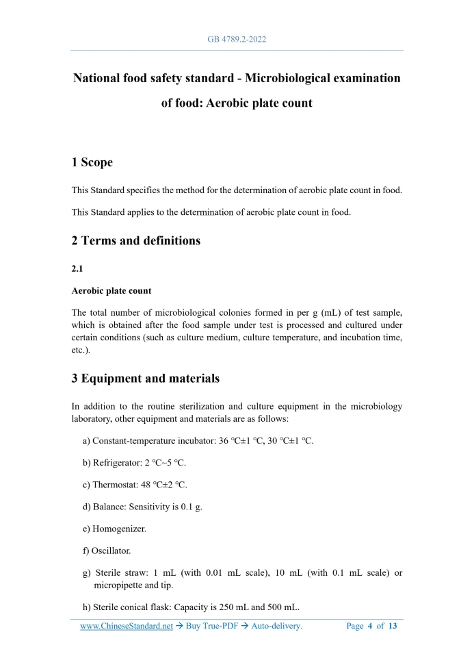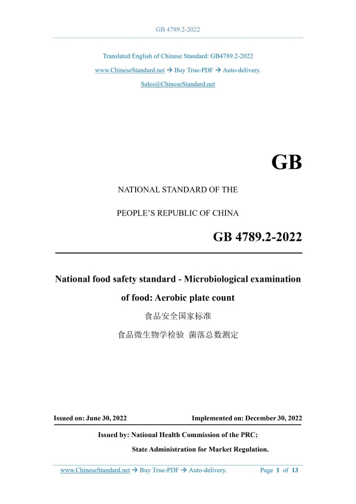 GB 4789.2-2022: National food safety standard - Microbiological examination of food: Aerobic plate count Delivery: 9 seconds. True-PDF full-copy in English & invoice will be downloaded + auto-delivered via email. See step-by-step procedure Status: Valid GB 4789.2: Historical versions