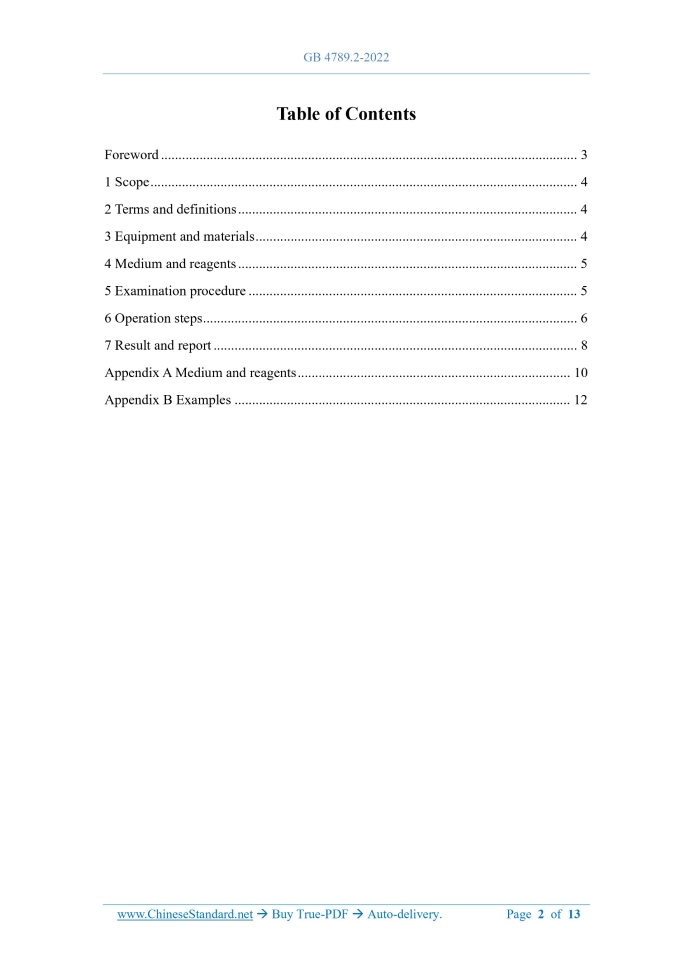 Similar standardsGB 4789.2-2022: National food safety standard - Microbiological examination of food: Aerobic plate count---This is an excerpt. Full copy of true-PDF in English version (including equations, symbols, images, flow-chart, tables, and figures etc.), auto-downloaded/delivered in 9 seconds, can be purchased online: https://www.ChineseStandard.net/PDF.aspx/GB4789.2-2022 NATIONAL STANDARD OF THE PEOPLE’S REPUBLIC OF CHINA National food safety standard - Microbiological examination of food. Aerobic plate count Issued on. JUNE 30, 2022 Implemented on. DECEMBER 30, 2022 Issued by. National Health Commission of the PRC; State Administration for Market Regulation. Table of ContentsForeword... 3 1 Scope... 4 2 Terms and definitions... 4 3 Equipment and materials... 4 4 Medium and reagents... 5 5 Examination procedure... 5 6 Operation steps... 6 7 Result and report... 8 Appendix A Medium and reagents... 10 Appendix B Examples... 12ForewordThis Standard replaces GB 4789.2-2016 "National food safety standard - Food microbiological examination - Aerobic plate count". Compared with GB 4789.2-2016, the main changes of this Standard are as follows. - Add Appendix B; - Modify the equipment and materials; - Modify the medium and reagents; - Modify the examination procedure; - Modify the operation steps; - Modify Appendix A. National food safety standard - Microbiological examination of food. Aerobic plate count1 ScopeThis Standard specifies the method for the determination of aerobic plate count in food. This Standard applies to the determination of aerobic plate count in food.2 Terms and definitions2.1 Aerobic plate count The total number of microbiological colonies formed in per g (mL) of test sample, which is obtained after the food sample under test is processed and cultured under certain conditions (such as culture medium, culture temperature, and incubation time, etc.).3 Equipment and materialsIn addition to the routine sterilization and culture equipment in the microbiology laboratory, other equipment and materials are as follows. a) Constant-temperature incubator. b) Refrigerator. c) Thermostat. d) Balance. Sensitivity is 0.1 g. e) Homogenizer. f) Oscillator. g) Sterile straw. 1 mL (with 0.01 mL scale), 10 mL (with 0.1 mL scale) or micropipette and tip. h) Sterile conical flask. Capacity is 250 mL and 500 mL. i) Sterile petri dish. Diameter is 90 mm. j) pH meter or pH colorimetric tube or precision pH test paper. k) Magnifying glass or/and colony counter.4 Medium and reagents4.1 Plate count agar medium. See A.1. 4.2 Test piece of aerobic plate count. It shall meet the quality control requirements of plate count agar medium in GB 4789.28.The main nutrients are consistent with the formula of plate count agar medium. 4.3 Sterile phosphate buffer. See A.2.5 Examination procedureThe examination procedure for aerobic plate count is shown in Figure 1.6 Operation steps6.1 Dilution of sample 6.1.1 Solid and semi-solid sample. Weigh 25 g of sample; place it in a sterile homogeneous cup filled with 225 mL of sterile phosphate buffer or sterile normal saline. Homogenize at 8000 r/min~10000 r/min for 1 min~2 min. Or put it into a sterile homogeneous bag containing 225 mL of diluent. Use a slap-type homogenizer to beat for 1 min~2 min, to make a 1.10 sample homogenate. Test sample25 g (mL) of sample + 225 mL of diluent,homogenized10-fold serial dilution Culture Add 15 mL~20 mL of plate count agar medium to each dish and mix well Select 1~3 sample homogenates of appropriate dilution; add 1 mL of each to asterile petri dish Count the number of colonies on each plate Calculate the aerobic plate count Report Culture at 36 °C±1 °C for 48 h±2 h. Aquatic products are cultured at 30 °C±1 °C for 72 h±3 h 6.1.2 Liquid sample. Use a sterile straw to pipette 25 mL of sample; place it in a sterile conical flask containing 225 mL of sterile phosphate buffer or sterile normal saline (an appropriate number of sterile glass beads can be preset in the bottle); and mix thoroughly. Or put it into a sterile homogeneous bag containing 225 mL of diluent. Use a slap-type homogenizer to beat for 1 min~2 min, to make a 1.10 sample homogenate. When the result is required to be the aerobic plate count per g of sample, operate according to 6.1.1. 6.1.3 Use a 1 mL sterile straw or micropipette to draw 1 mL of the 1.10 sample homogenate; along the tube wall, slowly inject it into a sterile test tube containing 9 mL of diluent (be careful not to touch the surface of the diluent with the pipette or the tip). Oscillate and mix on an oscillator, to make a 1.100 sample homogenate. 6.1.4 According to the operation in 6.1.3, prepare a 10-fold serial dilution of the sample homogenate. For each incremental dilution, use a new 1 mL sterile straw or tip. 6.1.5 According to the estimation of the contamination status of sample, select 1 to 3 sample homogenates with appropriate dilution (liquid samples can include stock solution). Pipette 1 mL of the sample homogenate into a sterile petri dish; make two petri dishes for each degree of dilution. At the same time, respectively pipette 1 mL of blank diluent; add it to two sterile petri dishes as blank control. 6.1.6 In a timely manner, pour 15 mL~20 mL of plate count agar medium cooled to 46 °C~50 °C (which can be kept in a thermostat at 48 °C±2 °C) into a petri dish; rotate the petri dish to make it evenly mixed. 6.2 Culture 6.2.1 Place horizontally until the agar solidifies; turn the plate over; incubate at 36 °C±1 °C for 48 h±2 h. Aquatic products are cultured at 30 °C±1 °C for 72 h±3 h. If the sample may contain colonies that spread and grow on the surface of the agar medium, it is possible to cover the surface of the solidified agar medium with a thin layer of plate count agar medium (about 4 mL). After solidification, turn the plate over and culture. 6.2.2 If the test piece of aerobic plate count is used, it shall be operated in accordance with the relevant technical 
