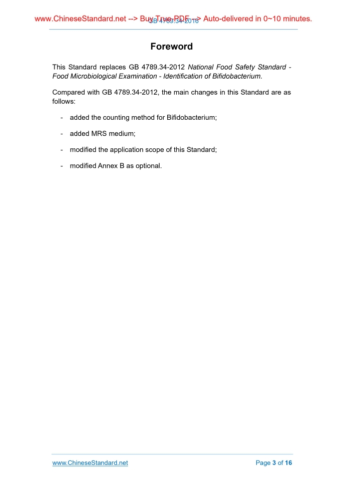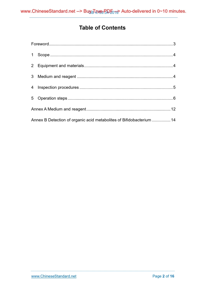 Similar standardsGB 4789.34-2016: National food safety standard - Food Microbiological Examination - Examination of Bifidobacterium---This is an excerpt. Full copy of true-PDF in English version (including equations, symbols, images, flow-chart, tables, and figures etc.), auto-downloaded/delivered in 9 seconds, can be purchased online: https://www.ChineseStandard.net/PDF.aspx/GB4789.34-2016 GB NATIONAL STANDARD OF THE PEOPLE’S REPUBLIC OF CHINA National Food Safety Standard - Food Microbiological Examination - Examination of Bifidobacterium Issued on. DECEMBER 23, 2016 Implemented on. JUNE 23, 2017 Issued by. National Health and Family Planning Commission of the People 's Republic of China; China Food and Drug Administration. Table of ContentsForeword... 3 1 Scope... 4 2 Equipment and materials... 4 3 Medium and reagent... 4 4 Inspection procedures... 5 5 Operation steps... 6 Annex A Medium and reagent... 12 Annex B Detection of organic acid metabolites of Bifidobacterium... 14ForewordThis Standard replaces GB 4789.34-2012 National Food Safety Standard - Food Microbiological Examination - Identification of Bifidobacterium. Compared with GB 4789.34-2012, the main changes in this Standard are as follows. - added the counting method for Bifidobacterium; - added MRS medium; - modified the application scope of this Standard; - modified Annex B as optional. National Food Safety Standard - Food Microbiological Examination - Examination of Bifidobacterium1 ScopeThis Standard specifies the identification and counting method for Bifidobacterium. This Standard applies to the identification and counting of pure bacteria strain of Bifidobacterium. This Standard applies to the identification of bacteria when the food only contains single Bifidobacterium. This Standard applies to the counting when the food only contains Bifidobacterium, i.e., the food may contain one or more different Bifidobacterium species.2 Equipment and materialsIn addition to microbial laboratory routine sterilization and training equipment, other equipment and materials are as follows. 2.1 Constant temperature incubator. 36°C ± 1°C. 2.2 Refrigerator. 2°C ~ 5°C. 2.5 Sterile pipettes. 1mL (with 0.01mL scale), 10mL (with 0.1mL scale) or micro-pipettes (200μL ~ 1000μL) and matching tips. 2.6 Sterile petri dish. 90 mm in diameter.3 Medium and reagent3.1 Bifidobacterium culture medium. see A.1. 3.2 PYG medium. see A.2. 3.6 Sulfuric acid. analytically pure. 3.7 Sulfuric acid. analytically pure. 3.8 Lactic acid. analytically pure.4 Inspection proceduresBifidobacterium inspection procedures are shown in Figure 1.5 Operation steps5.1 Sterile requirements All operating procedures shall follow the sterile procedures. 5.2 Identification of Bifidobacterium 5.2.1 Pure bacteria species 5.2.2 Food sample 5.2.2.1 Sample processing. take 25.0g (mL) of sample into a sterile conical flask or homogeneous bag containing 225.0mL of physiological saline, homogenizing at 8000r/min ~ 10000r/min for 1min ~ 2min or using slapping homogenizer to beat 1min ~ 2min to make 1.10 sample homogenizing solution. 5.2.3 Identification of bacteria 5.2.3.1 Smear microscopy. pick up Bifidobacterium single colony growing in Bifidobacterium plate or MRS plate for dyeing. Bifidobacterium is Gram-positive, short rod-shaped, slender rod-shaped or spherical, can form a variety of branches or bifurcation and other forms, non-acid, no spores, no power. 5.3 Counting of Bifidobacterium 5.3.1 Pure bacteria species 5.3.1.1 Preparation of solid and semi - solid samples. weigh aseptically 2.0g of sample; place into a sterile homogeneous cup containing 198.0mL of diluent, homogenizing at 8000r/min ~ 10000r/min for 1min ~ 2min, OR place in a sterile homogeneous bag containing 198.0mL of diluent; 5.3.2 Food sample 5.3.4 Colony counting 5.3.4.1 It can be observed with the naked eye, if necessary, with a magnifying glass or colony counter. Record the dilution factor and the corresponding number of colonies. The colony counting is expressed in colony-forming units (CFU). 5.3.5 Result representation 5.3.5.1 If the number of colonies on a dilution plate is within the appropriate counting range, calculate the average of the two plate colonies and multiply the average by the corresponding dilution factor as the total number of colonies per gram or milliliter. 5.3.5.2 If there are two consecutive dilutions of the number of plate colonies in the appropriate counting range, it shall calculate according to equation (1). 5.3.6 Report of the number of colonies 5.4 Results and report According to the results of 5.2.3.1, 5.2.3.2, 5.2.3.3, the species name of Bifidobacterium shall be reported. Issue the report according to the results of 5.3.6 colony counting, in CFU/g (mL).Annex AMedium and reagent A.1 Bifidobacterium agar medium A.1.1 Ingredients A.1.2 Preparation A.2 PYG liquid medium A.2.1 Composition Peptone 10.0 g Glucose 2.5 g Yeast 5.0 g Cysteine-HCl 0.25 g Salt solution 20.0 mL Vitamin K1 solution 0.5 mL Hemoglobin solution 5 mg/mL 2.5 mL Adding distilled water to 500.0 mL A.2.2 Preparation A.3 MRS medium A.3.1 Composition A.3.2 Preparation Add all components of A.3.1 to distilled water, dissolve by heating, calibrate to pH 6.2 ± 0.1, autoclave at 121°C for 15min ~ 20min after sub-packaging.Annex BDetection of organic acid metabolites of Bifidobacterium B.1 Preparation of Bifidobacterium culture medium Inoculate the Bifidobacterium cultured on Bifidobacterium agar plate or MRS agar plate into PYG liquid medium. Then use non-inoculated PYG liquid medium for blank control, anaerobic, culture at 36°C ± 1°C for 48h. B.2 Preparation of standard solution B.3 Method B.3.1 Treatment of acetic acid Take 2.0ml ~ 3.0mL of Bifidobacterium culture medium into 10mL centrifuge tube, add 0.2mL of 50% sulfuric acid solution (volume fraction), mix, add 2.0mL of acetone, mix and add excess sodium chloride, shake for 1min, then add 2.0mL of ether, shake for 1min, centrifuge at 3000 r/min for 5min. B.3