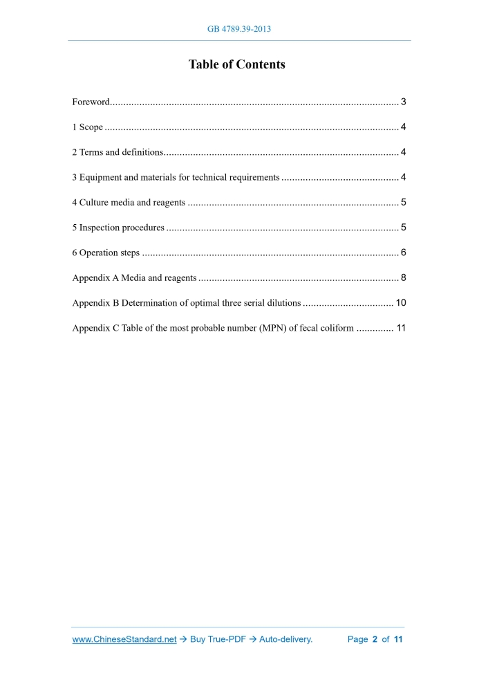 Similar standardsGB 4789.39-2013: National food safety standard - Food Microbiological Examination - Counting of fecal coliform---This is an excerpt. Full copy of true-PDF in English version (including equations, symbols, images, flow-chart, tables, and figures etc.), auto-downloaded/delivered in 9 seconds, can be purchased online: https://www.ChineseStandard.net/PDF.aspx/GB4789.39-2013 NATIONAL STANDARD OF THE PEOPLE’S REPUBLIC OF CHINA National Food Safety Standard - Food Microbiological Examination - Counting of fecal coliform ISSUED ON: NOVEMBER 29, 2013 IMPLEMENTED ON: JUNE 01, 2014 Issued by: National Health and Family Planning Commission of the People's Republic of China. Table of ContentsForeword ... 3 1 Scope ... 4 2 Terms and definitions... 4 3 Equipment and materials for technical requirements ... 4 4 Culture media and reagents ... 5 5 Inspection procedures ... 5 6 Operation steps ... 6 Appendix A Media and reagents ... 8 Appendix B Determination of optimal three serial dilutions ... 10 Appendix C Table of the most probable number (MPN) of fecal coliform ... 11 National Food Safety Standard - Food Microbiological Examination - Counting of fecal coliform1 ScopeThis Standard specifies the method for counting of fecal coliform in food. This Standard applies to the counting of fecal coliform in various foods.2 Terms and definitions2.1 Fecal coliform A group of aerobic and facultative anaerobic gram-negative bacillus bacteria – cultivated at 44.5 °C for 24 h ~ 48 h – that can ferment lactose, and produce acid and gas. The flora comes from the feces of humans and warm-blooded animals, and is used as an indicator of fecal contamination to evaluate the hygiene status of food and to infer the possibility of contamination by enteric pathogens in food.3 Equipment and materials for technical requirementsIn addition to the routine sterilization and culture equipment in the microbiology laboratory, other equipment and materials are as follows: a) Constant temperature incubator: 36 °C ± 1 °C; b) Refrigerator: 2 °C ~ 5 °C; c) Constant temperature water bath: 44.5 °C ± 0.2 °C; d) Balance: sensitive 0.1 g; e) Homogenizer; f) Oscillator; g) Sterile pipette: 1 mL (scale of 0.01 mL), 10 mL (scale of 0.1 mL), or micropipette and tip; h) Sterile conical flask: capacity 500 mL; i) Sterile petri dish: diameter 90 mm;6 Operation steps6.1 Dilution of samples 6.1.1 Solid and semi-solid samples: Weigh 25 g of the sample; put it in a sterile homogenizing cup containing 225 mL of phosphate buffer saline or normal saline; homogenize it at 8 000 r/min ~ 10 000 r/min for 1 min ~ 2 min to make a 1:10 sample homogenate solution; OR put it in a sterile homogenizing bag containing 225 mL of diluent; use a flapping homogenizer to beat it for 1 ~ 2 min to make a 1:10 sample homogenate solution. 6.1.2 Liquid sample: Use a sterile pipette to take 25 mL of sample; put it in a sterile conical flask containing 225 mL of phosphate buffer saline or normal saline (preset an appropriate number of sterile glass beads in the bottle); mix well to make a 1:10 sample homogenate solution. 6.1.3 The pH value of the sample homogenate solution shall be 6.5 ~ 7.5; use 1 mol/L NaOH or 1 mol/L HCl to adjust if necessary. 6.1.4 Use a 1 mL sterile pipette or micropipette to draw 1 mL of the 1:10 sample homogenate solution; slowly inject it along the tube wall into a sterile test tube containing 9 mL of phosphate buffer saline or normal saline (the pipette or tip shall not touch the diluent liquid level); shake the test tube or use a 1 mL sterile pipette for repeated pipetting to make it evenly mixed, to make a 1:100 sample homogenate solution. 6.1.5 According to the estimation of the contamination status of the sample, make a serial dilution of homogenate sample in ten-fold increments. For each incremental dilution, use a new 1 mL sterile pipette or tip. From the preparation of the sample homogenate solution to the completion of the sample inoculation, the whole process shall not exceed 15 minutes. 6.2 Initial fermentation test For each sample, select 3 appropriate serial dilutions of sample homogenate solutions (a stock solution can be selected for the liquid sample); for each dilution, inoculate 3 tubes of lauryl sulfate tryptone (LST) broth; for each tube, inoculate 1 mL (if the inoculum volume needs to exceed 1 mL, use double LST broth); incubate at 36 °C ± 1 °C for 24 h ± 2 h; observe whether there are bubbles in the inverted tube; perform a re-fermentation test for those which produce gas within 24 h; if no gas is produced, continue to cultivate to 48 h ± 2 h. Record the number of LST broth tubes producing gas within 24 h and 48 h. Those producing no gas are negative for fecal coliform; those producing gas shall be subjected to a re-fermentation test. If multiple dilutions are used, see Appendix B for the final determination of the optimal three serial dilutions. ......Source: Above contents are excerpted from the full-copy PDF -- translated/reviewed by: www.ChineseStandard.net / Wayne Zheng et al. Tips & Frequently Asked Questions:Question 1: How long will the true-PDF of English version of GB 4789.39-2013 be delivered?Answer: The full copy PDF of English version of GB 4789.39-2013 can be downloaded in 9 seconds, and it will also be emailed to you in 9 seconds (double mechanisms to ensure the delivery reliably), with PDF-invoice.Question 2: Can I share the purchased PDF of GB 4789.39-2013_English with my colleagues?Answer: Yes. The purchased PDF of GB 4789.39-2013_English will be deemed to be sold to your employer/organization who actually paid for it, including your colleagues and your employer's intranet.Question 3: Does the price include tax/VAT?Answer: Yes. Our tax invoice, downloaded/delivered in 9 seconds, includes all tax/VAT and complies with 100+ countries' tax regulations (tax exempted in 100+ countries) -- See Avoidance of Double Taxation Agreements (DTAs): List of DTAs signed between Singapore and 10
