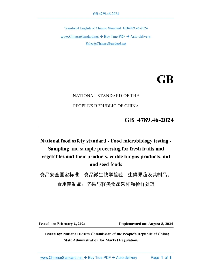 GB 4789.46-2024: National Food Safety Standards - Food Microbiology Testing - Sampling and Sample Processing of Fresh Fruits and Vegetables and Their Products, Edible Fungi Products, Nuts and Seeds Delivery: 9 seconds. True-PDF full-copy in English & invoice will be downloaded + auto-delivered via email. See step-by-step procedure Status: Valid