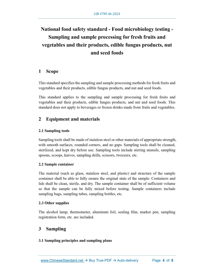 Similar standardsGB 4789.46-2024: National Food Safety Standards - Food Microbiology Testing - Sampling and Sample Processing of Fresh Fruits and Vegetables and Their Products, Edible Fungi Products, Nuts and Seeds---This is an excerpt. Full copy of true-PDF in English version (including equations, symbols, images, flow-chart, tables, and figures etc.), auto-downloaded/delivered in 9 seconds, can be purchased online: https://www.ChineseStandard.net/PDF.aspx/GB4789.46-2024 GB NATIONAL STANDARD OF THE PEOPLE'S REPUBLIC OF CHINA National food safety standard - Food microbiology testing - Sampling and sample processing for fresh fruits and vegetables and their products, edible fungus products, nut and seed foods ISSUED ON: FEBRUARY 8, 2024 IMPLEMENTED ON: AUGUST 8, 2024 Issued by: National Health Commission of the People's Republic of China; State Administration for Market Regulation. Table of ContentsForeword ... 3 1 Scope ... 4 2 Equipment and materials ... 4 3 Sampling ... 4 4 Sample processing ... 5 5 Inspection ... 8 National food safety standard - Food microbiology testing - Sampling and sample processing for fresh fruits and vegetables and their products, edible fungus products, nut and seed foods1 ScopeThis standard specifies the sampling and sample processing methods for fresh fruits and vegetables and their products, edible fungus products, and nut and seed foods. This standard applies to the sampling and sample processing for fresh fruits and vegetables and their products, edible fungus products, and nut and seed foods. This standard does not apply to beverages or frozen drinks made from fruits and vegetables.2 Equipment and materials2.1 Sampling tools Sampling tools shall be made of stainless steel or other materials of appropriate strength, with smooth surfaces, rounded corners, and no gaps. Sampling tools shall be cleaned, sterilized, and kept dry before use. Sampling tools include stirring utensils, sampling spoons, scoops, knives, sampling drills, scissors, tweezers, etc. 2.2 Sample container The material (such as glass, stainless steel, and plastic) and structure of the sample container shall be able to fully ensure the original state of the sample. Containers and lids shall be clean, sterile, and dry. The sample container shall be of sufficient volume so that the sample can be fully mixed before testing. Sample containers include sampling bags, sampling tubes, sampling bottles, etc. 2.3 Other supplies The alcohol lamp, thermometer, aluminum foil, sealing film, marker pen, sampling registration form, etc. are included.3 Sampling3.1 Sampling principles and sampling plans possible, both prepackaged and bulk samples shall be mixed in the original packaging container. 4.2.2 For vegetables and their products containing antibacterial substances, such as onions, garlic (garlic sprout), leeks, and scallions, it is necessary to reduce the antibacterial activity of the sample before testing, such as increasing the dilution, or adding potassium sulfite (K2SO3) to the initial diluent, so that the final concentration reaches 0.5%. 4.2.3 If required by the test method, the initial diluent and enrichment solution of the sample can be adjusted to pH 7.0±0.5 with 1 moL/L NaOH or 1 moL/L HCl. 4.2.4 For products with high-fat content, such as nut and seed pastes and purees, an appropriate proportion of sterilized Tween 80 can be added to the diluent or enrichment solution used in sample processing according to different fat contents for emulsification and mixing; the additive amount can be calculated by adding 1 g/L for every 10% fat content (for example, if the fat content is 40%, add 4 g/L). 4.3 Fresh food 4.3.1 Fresh fruits 4.3.1.1 For fresh-cut fruits, chop all the test samples and mix them evenly; weigh 25 g, put them into a sterile homogenizing bag containing 225 mL of diluent or enrichment solution, homogenize, and then test. 4.3.1.2 For fruits that need to be peeled in whole, such as watermelons, kiwis, citrus fruits, and bananas, first rinse the surface with tap water, then disinfect it with 75% ethanol, and open it aseptically; take the edible part, put it into a sterile container, and homogenize it with a homogenizer for 1 min~2 min. 4.3.1.3 For fruits that do not need to be peeled, such as tomatoes and pears, take the whole fruit, cut it into small pieces under sterile conditions, mix it or homogenize it with a homogenizer for 1 min to 2 min; weigh 25 g, put it into a sterile homogenizing bag containing 225 mL of diluent or enrichment solution, and inspect it after homogenization. 4.3.2 Fresh vegetables Use sterile scissors or a chopper to cut the edible part of the sample into small segments (pieces), and mix thoroughly and evenly. Weigh 25 g, put it into a sterile homogenization bag containing 225 mL of diluent or enrichment solution, and inspect after homogenization. 4.4 Fruit and vegetable products 4.4.1 Dehydrated, frozen foods (fruits, vegetables, edible fungi, etc.) and preserved fruits 4.4.1.1 Frozen samples shall be thawed for inspection. They can be thawed below 45 °C for no more than 15 minutes, at 18 °C to 27 °C for no more than 3 hours, or at 2 °C to 5 °C for no more than 18 hours (unless there are special provisions in the inspection method). 4.4.1.2 Use sterile scissors to cut the sample into small segments (pieces), and mix thoroughly and evenly; weigh 25 g, put it into a sterile homogenization bag containing 225 mL of diluent or enrichment solution, and inspect after homogenization. 4.4.1.3 For dehydrated products, increase the additive amount of diluent or enrichment solution appropriately according to the situation. 4.4.2 Sauces, purees and powders of fruits, vegetables, edible fungi, etc. 4.4.2.1 Use sterile tools to stir the test sample evenly or use a homogenizer to homogenize it for 1 to 2 minutes. Weigh 25 g, put it into a sterile homogenization bag containing 225 mL of diluent or enrichment solution, and inspect after homogenization. 4.4.2.2 The direc