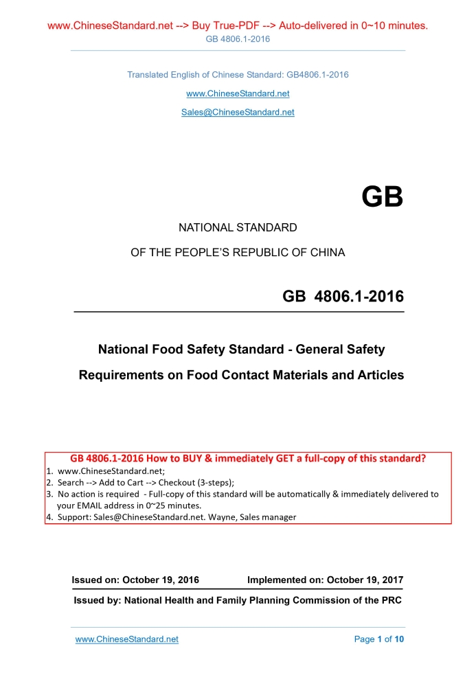 GB 4806.1-2016: National food safety standard - General Safety Requirements on Food Contact Materials and Articles Delivery: 9 seconds. True-PDF full-copy in English & invoice will be downloaded + auto-delivered via email. See step-by-step procedure Status: Valid GB 4806.1: Historical versions
