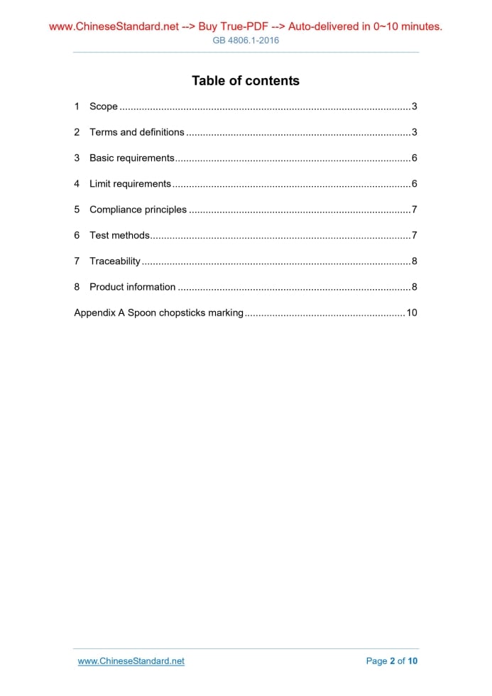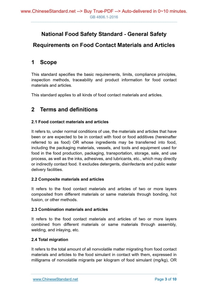 Similar standardsGB 4806.1-2016: National food safety standard - General Safety Requirements on Food Contact Materials and Articles---This is an excerpt. Full copy of true-PDF in English version (including equations, symbols, images, flow-chart, tables, and figures etc.), auto-downloaded/delivered in 9 seconds, can be purchased online: https://www.ChineseStandard.net/PDF.aspx/GB4806.1-2016 GB NATIONAL STANDARD National Food Safety Standard - General Safety Requirements on Food Contact Materials and Articles Issued on: OCTOBER 19, 2016 Implemented on: OCTOBER 19, 2017 Issued by. National Health and Family Planning Commission of the PRC Table of Contents1 Scope... 3 2 Terms and definitions... 3 3 Basic requirements... 6 4 Limit requirements... 6 5 Compliance principles... 7 6 Test methods... 7 7 Traceability... 8 8 Product information... 8 Appendix A Spoon chopsticks marking... 10 National Food Safety Standard - General Safety Requirements on Food Contact Materials and Articles1 ScopeThis standard specifies the basic requirements, limits, compliance principles, inspection methods, traceability and product information for food contact materials and articles. This standard applies to all kinds of food contact materials and articles.2 Terms and definitions2.1 Food contact materials and articles It refers to, under normal conditions of use, the materials and articles that have been or are expected to be in contact with food or food additives (hereinafter referred to as food) OR whose ingredients may be transferred into food, including the packaging materials, vessels, and tools and equipment used for food in the food production, packaging, transportation, storage, sale, and use process, as well as the inks, adhesives, and lubricants, etc., which may directly or indirectly contact food. It excludes detergents, disinfectants and public water delivery facilities. 2.2 Composite materials and articles It refers to the food contact materials and articles of two or more layers composited from different materials or same materials through bonding, hot fusion, or other methods. 2.3 Combination materials and articles It refers to the food contact materials and articles of two or more layers combined from different materials or same materials through assembly, welding, and inlaying, etc. 2.4 Total migration It refers to the total amount of all nonvolatile matter migrating from food contact materials and articles to the food simulant in contact with them, expressed in milligrams of nonvolatile migrants per kilogram of food simulant (mg/kg), OR milligrams of nonvolatile migrants per square decimeter contact area (mg/dm2). As for the food contact materials and articles dedicated for infants, it is expressed in mg/kg. 2.5 Overall migration limit (OML) It refers to the maximum allowable amount of all nonvolatile matter migrating from food contact materials and articles to the food simulant in contact with them, expressed in milligrams of nonvolatile migrants per kilogram of food simulant (mg/kg), OR milligrams of nonvolatile migrants per square decimeter contact area (mg/dm2). As for the food contact materials and articles dedicated for infants, it is expressed in mg/kg. 2.6 Maximum usage It refers to the maximum allowable amount of a certain substance or substances added when producing food contact materials and articles, which is expressed in mass fraction (%). 2.7 Specific migration It refers to the amount of a substance or substances migrating from food contact materials and articles to the food or food simulant in contact with them, expressed in milligrams of migrants per kilogram of food or food simulant (mg/kg), OR milligrams of migrants per square decimeter contact area between the food contact materials and articles AND the food or food simulants (mg/dm2). 2.8 Specific migration limit (SML) It refers to the maximum allowable amount of one or more substances from the food contact materials and articles to the food or food simulants in contact with them, expressed in milligrams of migrants per kilogram of food or food simulant (mg/kg), OR milligrams of migrants per square decimeter contact area between the food contact materials and articles AND the food or food simulants (mg/dm2). 2.9 Specific migration total It refers to the total amount of two or more substances migrating from food contact materials and articles to the food or food simulants in contact with them, expressed in milligrams of a specified migrant or migrants (or group) per kilogram of food or food simulant (mg/kg), OR milligrams of a specified migrant or migrants (or group) per square decimeter contact area between the food contact materials and articles AND the food or food simulants (mg/dm2). 2.10 Specific migration total limit [SML (T)] It refers to the maximum allowable amount of two or more substances migrating from food contact materials and articles to the food or food simulants in contact with them, expressed in milligrams of a specified migrant or migrants (or group) per kilogram of food or food simulant (mg/kg), OR milligrams of a specified migrant or migrants (or group) per square decimeter contact area between the food contact materials and articles AND the food or food simulants (mg/dm2). 2.11 Residue It refers to the amount of one or more residual substances in the food contact materials and articles, expressed in the milligrams of the residual substance per kilogram of food contact materials and articles (mg/kg), OR the milligrams of residual substances per square decimeter contact area between the food contact materials and articles AND the food (mg/dm2). 2.12 Maximum Residue (QM) It refers to the maximum allowable amount of one or more residual substances in the food contact materials and articles, expressed in the milligrams of the residual substance per kilogram of food contact materials and articles (mg/kg), OR the milligrams of residual substances per square decimeter contact area between the food contact materials 