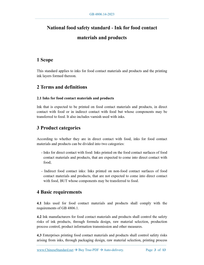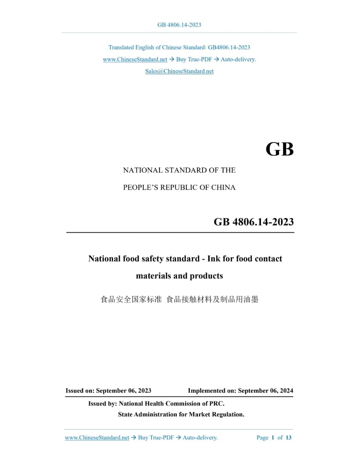 GB 4806.14-2023: National food safety standard - Ink for food contact materials and products Delivery: 9 seconds. True-PDF full-copy in English & invoice will be downloaded + auto-delivered via email. See step-by-step procedure Status: Valid