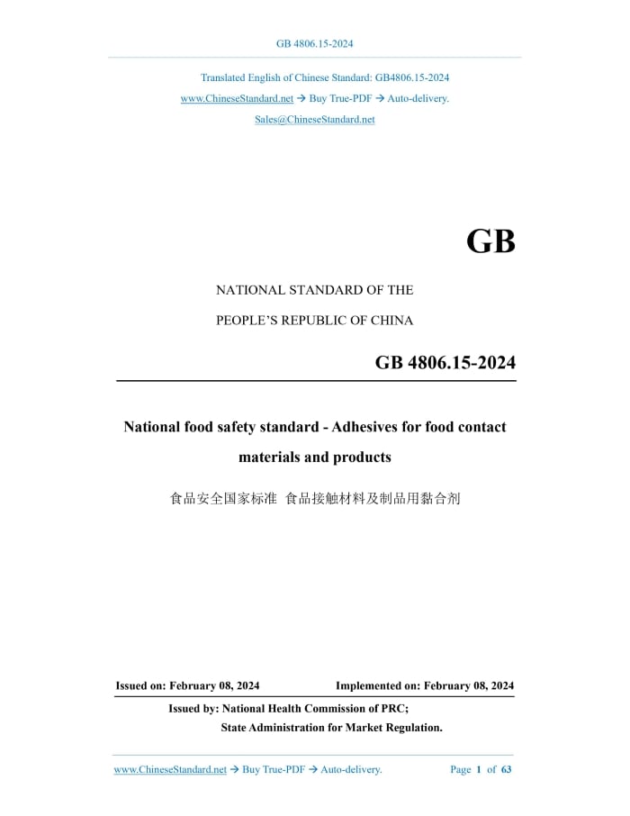 GB 4806.15-2024: National food safety standard - Adhesives for food contact materials and products Delivery: 9 seconds. True-PDF full-copy in English & invoice will be downloaded + auto-delivered via email. See step-by-step procedure Status: Valid