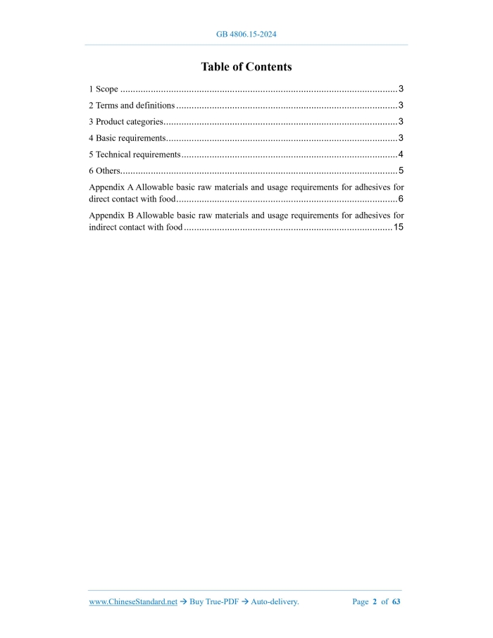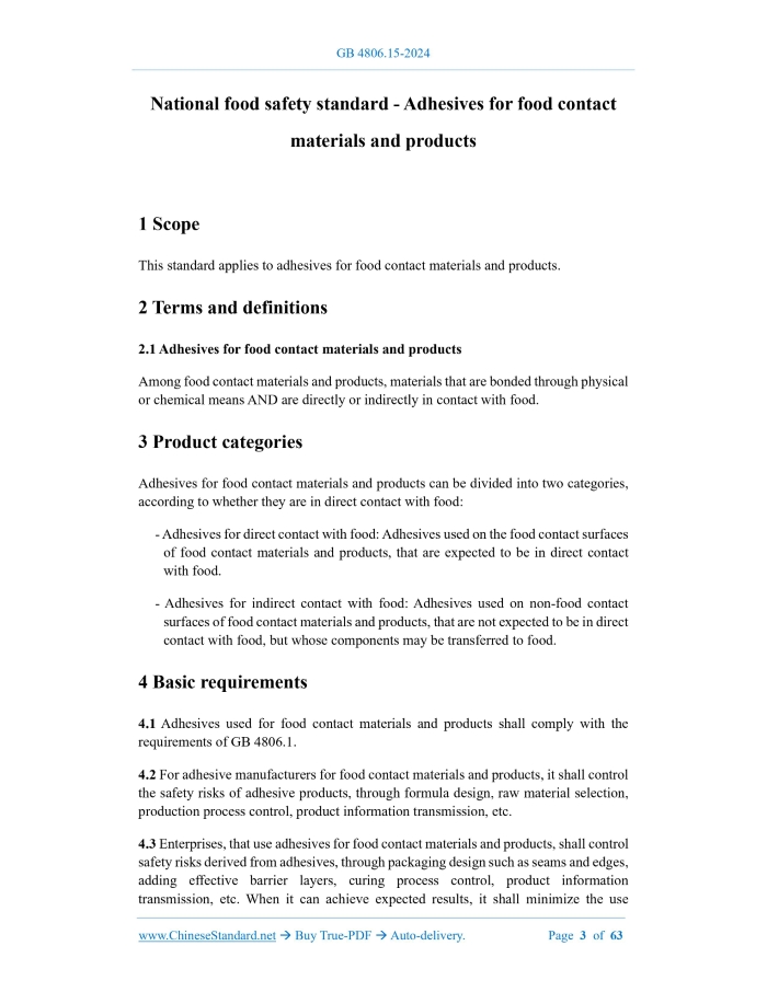 Similar standardsGB 4806.15-2024: National food safety standard - Adhesives for food contact materials and products---This is an excerpt. Full copy of true-PDF in English version (including equations, symbols, images, flow-chart, tables, and figures etc.), auto-downloaded/delivered in 9 seconds, can be purchased online: https://www.ChineseStandard.net/PDF.aspx/GB4806.15-2024 GB NATIONAL STANDARD OF THE PEOPLE’S REPUBLIC OF CHINA National food safety standard - Adhesives for food contact materials and products Issued on. FEBRUARY 08, 2024 Implemented on. FEBRUARY 08, 2024 Issued by. National Health Commission of PRC; State Administration for Market Regulation. Table of Contents1 Scope... 3 2 Terms and definitions... 3 3 Product categories... 3 4 Basic requirements... 3 5 Technical requirements... 4 6 Others... 5 Appendix A Allowable basic raw materials and usage requirements for adhesives for direct contact with food... 6 Appendix B Allowable basic raw materials and usage requirements for adhesives for indirect contact with food... 15 National food safety standard - Adhesives for food contact materials and products1 ScopeThis standard applies to adhesives for food contact materials and products.2 Terms and definitions2.1 Adhesives for food contact materials and products Among food contact materials and products, materials that are bonded through physical or chemical means AND are directly or indirectly in contact with food.3 Product categoriesAdhesives for food contact materials and products can be divided into two categories, according to whether they are in direct contact with food. - Adhesives for direct contact with food. Adhesives used on the food contact surfaces of food contact materials and products, that are expected to be in direct contact with food.4 Basic requirements4.1 Adhesives used for food contact materials and products shall comply with the requirements of GB 4806.1. 4.2 For adhesive manufacturers for food contact materials and products, it shall control the safety risks of adhesive products, through formula design, raw material selection, production process control, product information transmission, etc. 4.3 Enterprises, that use adhesives for food contact materials and products, shall control safety risks derived from adhesives, through packaging design such as seams and edges, adding effective barrier layers, curing process control, product information transmission, etc.5 Technical requirements5.1 Raw material requirements 5.1.1 The use of basic raw materials for adhesives used in direct contact with food shall comply with the requirements of Appendix A and relevant announcements. 5.2 Sensory requirements The sensory requirements of the adhesive layer for direct contact with food shall comply with the provisions of Table 1. 5.3 Physical and chemical indicators 5.3.1 General physical and chemical indicators The general physical and chemical indicators of the adhesive layer shall comply with the provisions of Table 2. 5.3.2 Other physical and chemical indicators 5.3.2.1 Adhesives for food contact materials and products shall comply with the requirements for physical and chemical indicators, such as specific migration limits (SML), specific total migration limits [SML(T)], maximum residues (QM) of basic raw materials in Appendix A, Appendix B and relevant announcements.6 Others6.1 Migration test The migration test shall be carried out in accordance with the provisions of GB 31604.1 and GB 5009.156, unless there are special provisions in this standard. 6.2 Label identification 6.2.1 Label identification shall comply with the provisions of GB 4806.1.Appendix AAllowable basic raw materials and usage requirements for adhesives for direct contact with food A.1 Table A.1 specifies the list of basic raw materials allowed to be used in adhesives for direct contact with food and their usage requirements. The basic raw materials listed in Table A.1 shall be subject to CAS number. If there is no CAS number, the Chinese name shall prevail. A.2 The specific total migration limit [SML(T)] and SML(T) group number in GB 9685 are applicable to this standard. A.3 If the monomers and other starting materials used in the polymer synthesis in Table A.1 are acids, alcohols or phenolic substances, their sodium salts, potassium salts and calcium salts (including acid salts and double salts) can also be used in the synthesis of corresponding polymers;Appendix BAllowable basic raw materials and usage requirements for adhesives for indirect contact with food B.1 Table B.1 specifies the list of basic raw materials allowed to be used in adhesives for indirect contact with food and their usage requirements. The basic raw materials listed in Table B.1 shall be subject to CAS number. If there is no CAS number, the Chinese name shall prevail. B.2 Substances, which have a molecular weight greater than 1000 Da formed by polymerization or other means of monomers, other starting materials, base polymers and other basic raw materials listed in Table B.1, are also allowed to be used as the basic raw materials of adhesives for indirect contact with food. They shall comply with the restrictive requirements for basic raw materials, such as corresponding monomers, other starting materials, basic polymers. B.3 The specific total migration limit [SML(T)] and SML(T) group number in GB 9685 are applicable to this standard. B.4 If the monomers and other starting materials used in the polymer synthesis in Table B.1 are acids, alcohols or phenolic substances, their sodium salts, potassium salts and calcium salts (including acid salts and double salts) can also be used in the synthesis of corresponding polymers; ......Source: Above contents are excerpted from the full-copy PDF -- translated/reviewed by: www.ChineseStandard.net / Wayne Zheng et al. Tips & Frequently Asked Questions:Question 1: How long will the true-PDF of English version of GB 4806.15-2024 be delivered?Answer: The full copy PDF of English version of GB