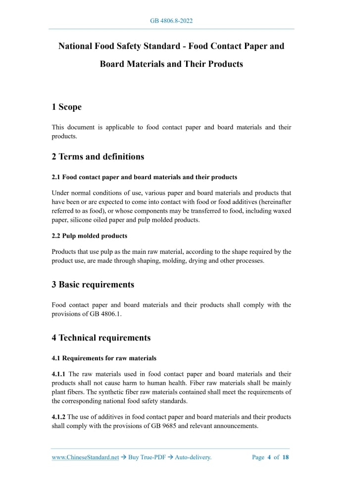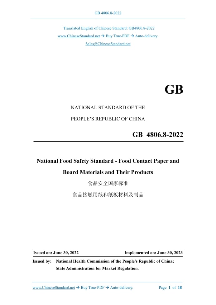 GB 4806.8-2022: National food safety standard - Food Contact Paper and Board Materials and Their Products Delivery: 9 seconds. True-PDF full-copy in English & invoice will be downloaded + auto-delivered via email. See step-by-step procedure Status: Valid GB 4806.8: Historical versions