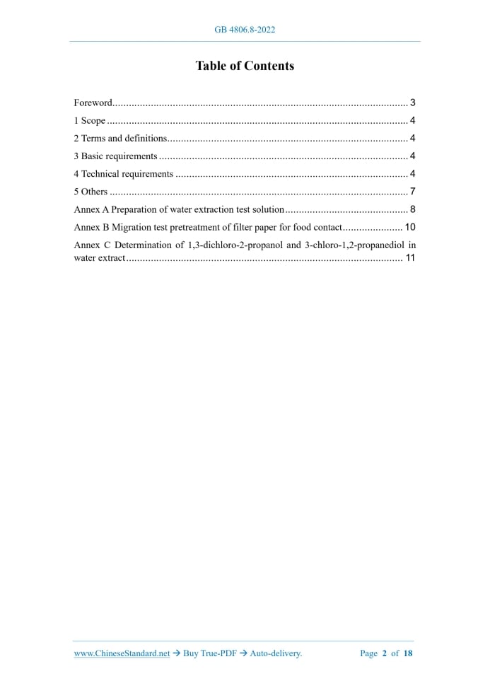 Similar standardsGB 4806.8-2022: National food safety standard - Food Contact Paper and Board Materials and Their Products---This is an excerpt. Full copy of true-PDF in English version (including equations, symbols, images, flow-chart, tables, and figures etc.), auto-downloaded/delivered in 9 seconds, can be purchased online: https://www.ChineseStandard.net/PDF.aspx/GB4806.8-2022 NATIONAL STANDARD OF THE PEOPLE’S REPUBLIC OF CHINA ICS 11.100.20 CCS C 30 GB/T 16886.16-2021 / ISO 10993-16.2017 Replacing GB/T 16886.16-2013 Biological Evaluation of Medical Devices – Part 16. Toxicokinetic Study Design for Degradation Products and Leachables (ISO 10993-16.2017, IDT) Issued on. NOVEMBER 26, 2021 Implemented on. DECEMBER 01, 2022 Issued by. State Administration for Market Regulation; Standardization Administration of the People’s Republic of China. Table of ContentsForeword... 3 Introduction... 6 1 Scope... 9 2 Normative References... 9 3 Terms and Definitions... 9 4 Principles for Design of Toxicokinetic Studies... 11 5 Guidance on Test Methods... 12 5.1 General considerations... 12 5.2 Guidance on specific types of test... 14 5.2.1 General... 14 5.2.2 Absorption... 14 5.2.3 Distribution... 14 5.2.4 Metabolism and excretion... 15 Annex A (Normative) Circumstances in which Toxicokinetic Studies shall be Considered... 17 Bibliography... 19ForewordThis Document was drafted as per the rules specified in GB/T 1.1-2020 Directives for Standardization – Part 1.Rules for the Structure and Drafting of Standardizing Documents. This Document is the Part 16 of GB/T 16886 Biological Evaluation of Medical Devices. GB/T 16886 has issued the following parts. --- Part 1.Evaluation and Testing within a Risk Management Process; --- Part 2.Animal Welfare Requirements; --- Part 3.Tests for Genotoxicity, Carcinogenicity and Reproductive Toxicity; --- Part 4.Selection for Tests for Interactions with Blood; --- Part 5.Tests for Cytotoxicity. in Vitro Methods; --- Part 6.Tests for Local Effects after Implantation; --- Part 7.Ethylene Oxide Sterilization Residuals; --- Part 9.Framework for Identification and Quantification of Potential Degradation Products; --- Part 10.Tests for Irritation and Skin Sensitization; --- Part 11.Tests for Systemic Toxicity; --- Part 12.Sample Preparation and Reference Materials; --- Part 13.Identification and Quantification of Degradation Products from Polymeric Medical Devices; --- Part 14.Identification and Quantification of Degradation Products from Ceramics; --- Part 15.Identification and Quantification of Degradation Products from Metals and Alloys; --- Part 16.Toxicokinetic Study Design for Degradation products and Leachables; --- Part 17.Establishment of Allowable Limits for Leachable Substances; --- Part 18.Chemical Characterization of Materials; --- Part 19.Physico-Chemical, Morphological and Topographical Characterization of Materials; --- Part 20.Principles and Methods for Immunotoxicology Testing of Medical Devices. This Document replaced GB/T 16886.16-2013 Biological Evaluation of Medical Devices - Part 16.Toxicokinetic Study Design for Degradation Products and Leachables. Compared with GB/T 16886.16-2013, the major technical changes of this Document are as follows besides the editorial modifications. --- Modify the definition of term “Absorption” (see 3.1 of this Edition; 3.1 of 2013 Edition); --- Modify "Principles for design of toxicokinetic studies" (see Clause 4 of this Edition; Clause 4 of 2013 Edition); --- Modify the "Guidance on test methods" (see Clause 5 of this Edition; Clause 5 of 2013 Edition); --- Add information on toxicokinetic studies of nanomaterials (see A.4 of this Edition); --- Modify the circumstances that shall be considered in toxicokinetic studies (see A.4 of this Edition; A.4 of 2013 Edition). This Document used translation method to equivalently adopt ISO 10993-16.2017 Biological Evaluation of Medical Devices – Part 16.Toxicokinetic Study Design for Degradation Products and Leachables. The Chinese document that has a consistent correspondence with the international documents normatively cited in this document is as follows. --- GB/T 16886.1-2011 Biological Evaluation of Medical Devices - Part 1.Evaluation and Testing within a Risk Management Process (ISO 10993-1.2009, IDT). Please note some contents of this Document may involve patents. The issuing agency of this Document shall not assume the responsibility to identify these patents. This Document was proposed by National Medical Products Administration. This Document shall be under the jurisdiction of National Technical Committee on Biological Evaluation on Medical Device of Standardization Administration of China (SAC/TC 248). Drafting organizations of this Document. Shandong Quality Inspection Center for Medical Device; and Shandong University. Chief drafting staffs of this Document. Fan Chunguang, Liu Chenghu, Hou Li, Zhang Na, Liu Xiangdong, and Dong Xiuli. The historical editions replaced by this Document are as follows. --- GB/T 16886.16-2003 was first-time published in 2003; first-time revised in 2013; --- It is the second-time revised hereby.1 ScopeThis Document provides principles on designing and performing toxicokinetic studies relevant to medical devices. Annex A describes the considerations for inclusion of toxicokinetic studies in the biological evaluation of medical devices.2 Normative ReferencesThe provisions in following documents become the essential provisions of this Document through reference in this Document. For the dated documents, only the versions with the dates indicated are applicable to this Document; for the undated documents, only the latest version (including all the amendments) is applicable to this Document. ISO 10993-1 Biological Evaluation of Medical Devices – Part 1.Evaluation and Testing within a Risk Management Process3 Terms and DefinitionsFor the purposes of this Document, the terms and definitions given in ISO 10993-1 and the following apply