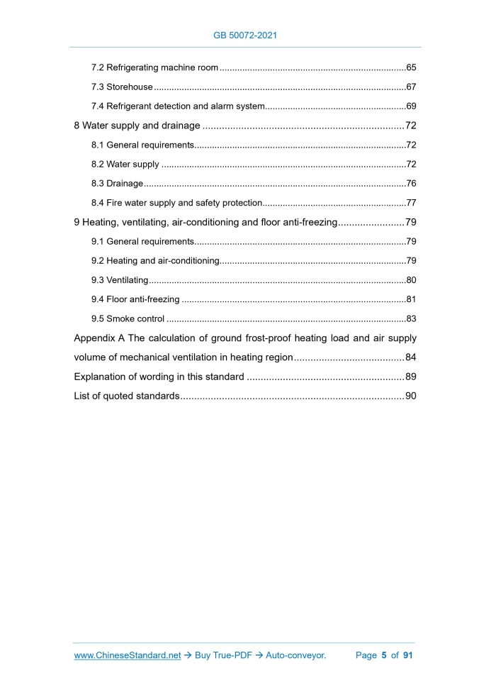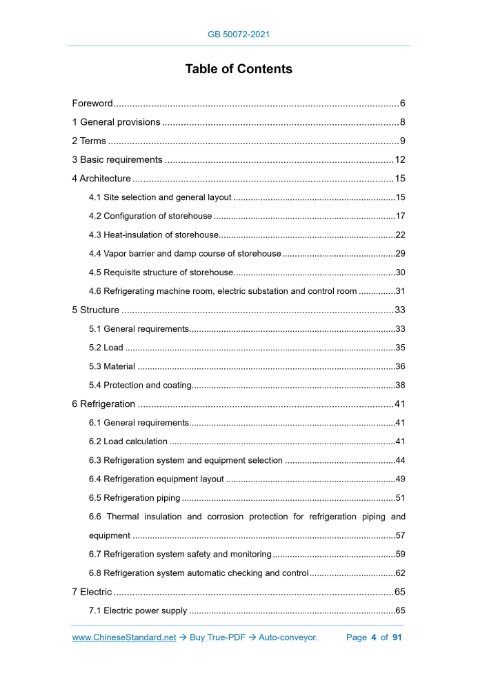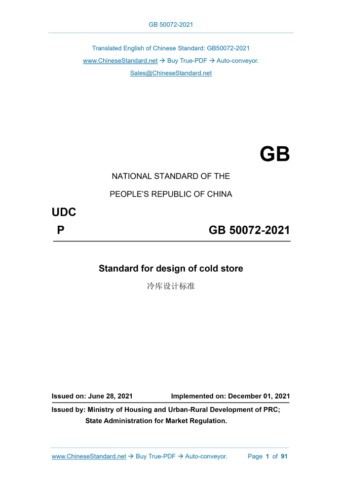 Similar standardsGB 50072-2021: Code for design of cold store---This is an excerpt. Full copy of true-PDF in English version (including equations, symbols, images, flow-chart, tables, and figures etc.), auto-downloaded/delivered in 9 seconds, can be purchased online: https://www.ChineseStandard.net/PDF.aspx/GB50072-2021GB NATIONAL STANDARD OF THE PEOPLE’S REPUBLIC OF CHINA UDC P GB 50072-2021 Standard for design of cold store Issued on. JUNE 28, 2021 Implemented on. DECEMBER 01, 2021 Issued by. Ministry of Housing and Urban-Rural Development of PRC; State Administration for Market Regulation. NATIONAL STANDARD OF THE PEOPLE’S REPUBLIC OF CHINA Standard for design of cold store Editor-in-chief. Ministry of Commerce of the People's Republic of China Approval department. Ministry of Housing and Urban-Rural Development of the People's Republic of China Effective date. December 1, 2021 China Planning Press 2021 Beijing Table of ContentsForeword... 6 1 General provisions... 8 2 Terms... 9 3 Basic requirements... 12 4 Architecture... 15 5 Structure... 33 6 Refrigeration... 41 7 Electric... 65 8 Water supply and drainage... 72 9 Heating, ventilating, air-conditioning and floor anti-freezing... 79 Appendix A The calculation of ground frost-proof heating load and air supply volume of mechanical ventilation in heating region... 84 Explanation of wording in this standard... 89 List of quoted standards... 901 General provisions1.0.1 This standard is formulated, in order to standardize and integrate the technical requirements for design of cold store, guide the design of cold store, meet food refrigeration technology and hygiene requirements, achieve the goals of economical and reasonable, energy-saving, environmentally friendly, safe and reliable. 1.0.2 This standard is applicable to the newly-built, expanded, reconstructed food cold store, which adopts the subcritical vapor compression direct refrigeration systems using ammonia, halogenated hydrocarbons and their mixtures, carbon dioxide as refrigerants, AND the indirect refrigeration systems using carbon dioxide, brine, etc. as refrigerating medium. 1.0.3 The cold store design shall be safe and reliable, energy-saving, environmentally friendly, economically reasonable, advanced and applicable. 1.0.4 The cold store design shall not only meet the requirements of this standard, BUT also meet the requirements of relevant national standards.2 Terms2.0.1 Cold store Storage buildings, which adopt artificial refrigeration AND have cold insulation functions, including storehouse, refrigerating machine rooms, power distribution rooms, etc. 2.0.2 Assembly cold store The cold store, which adopts light-weight composite sandwich panels, such as metal surface insulation sandwich panels, as thermal insulation and envelope structures, AND is assembled on-site. 2.0.4 High rack cold store The rack cold store, which has a rack height of more than 7 m AND adopts mechanized or automated control. 2.0.5 Storehouse The main body of the cold store building and its supporting stairwells, elevator rooms, anteroom, other auxiliary rooms. 2.0.6 Anteroom The passages, which are set up for the entry and exit of goods in the cold storage room, ice storage room, chilling room. It is divided into the temperature- controlled anteroom, which has artificial refrigeration and temperature reduction, AND non-temperature controlled anteroom, which has no artificial refrigeration and cooling. 2.0.9 Chilling room The room, where the product is cooled. 2.0.10 Freezing room The room, where the product is frozen. 2.0.11 Cold storage room A room, which is used to store cold processed products. 2.0.12 Chilled food storage room A room, which is used to store goods, at a temperature higher than freezing point AND lower than normal temperature.3 Basic requirements3.0.1 The design scale of the cold store shall be calculated, based on the nominal volume of the cold storage room or ice storage room. Those which has a nominal volume greater than 20000 m3 shall be large-scale cold store. Those which has a nominal volume of 5000 m3 ~ 20000 m3 shall be medium-sized cold store. 3.0.2 The calculated capacity of the cold store, for directly stacking cold storage items, can be calculated as follows. 3.0.7 The design temperature and relative humidity of the cold room shall be determined, according to the cold storage process requirements of various foods. 3.0.9 The minimum spacing, between rooms using ammonia refrigeration system, ammonia refrigeration equipment and pipes installed outdoors and civil buildings outside the plant area, shall not be less than 150 m.4 Architecture4.1 Site selection and general layout 4.1.1 The site selection of the cold store shall meet the following requirements. 4.1.2 The general layout of the cold store shall meet the following requirements. 4.1.3 The general layout of the cold store shall be a combination of short-term and long-term, focusing on the short-term. Resources such as storehouse land, railway dedicated lines, water transport wharf, equipment pipelines, roads, carriage return yards, shall be planned as a whole, reasonably arranged, taking into account the needs of future expansion. 4.1.4 The vertical design of the general plan of the cold store shall meet the following requirements. 4.1.5 The main roads in the storehouse area shall be paved with concrete or asphalt pavements, which are suitable for vehicles. 4.1.8 When the storehouse covers an area larger than 1500 m2, fire lanes shall be set, at least along the two long sides of the storehouse. 4.2.3 The partition wall, between the cold storage room and the anteroom or closed platform, shall be a fire partition wall. The fire resistance rating of the fire partition wall shall not be less than 3.00 h. 4.2.4 When the assembly cold store is not equipped with the fire partition wall, which is specified in clause 4.2.3 of this standard, the fire resistance grade, number of layers, area shall meet the requirements of T
