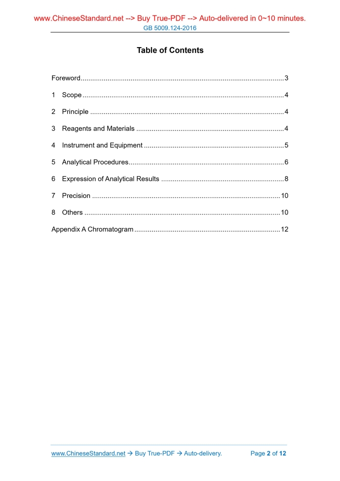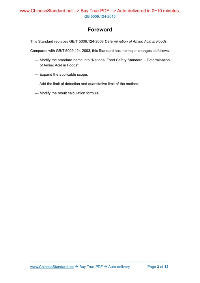 Similar standardsGB 5009.124-2016: National food safety standard - Determination of Amino Acid in Foods---This is an excerpt. Full copy of true-PDF in English version (including equations, symbols, images, flow-chart, tables, and figures etc.), auto-downloaded/delivered in 9 seconds, can be purchased online: https://www.ChineseStandard.net/PDF.aspx/GB5009.124-2016GB NATIONAL STANDARD OF THE PEOPLE’S REPUBLIC OF CHINA National Food Safety Standard – Determination of Amino Acid in Foods Issued on. DECEMBER 23, 2016 Implemented on. JUNE 23, 2017 Issued by. National Health and Family Planning Commission of PRC; China Food and Drug Administration. Table of ContentsForeword... 3 1 Scope... 4 2 Principle... 4 3 Reagents and Materials... 4 4 Instrument and Equipment... 5 5 Analytical Procedures... 6 6 Expression of Analytical Results... 8 7 Precision... 10 8 Others... 10 Appendix A Chromatogram... 12ForewordThis Standard replaces GB/T 5009.124-2003 Determination of Amino Acid in Foods. Compared with GB/T 5009.124-2003, this Standard has the major changes as follows. --- Modify the standard name into “National Food Safety Standard – Determination of Amino Acid in Foods”; --- Expand the applicable scope; --- Add the limit of detection and quantitative limit of the method; --- Modify the result calculation formula. National Food Safety Standard – Determination of Amino Acid in Foods1 ScopeThis Standard specifies using the amino acid analyzer (ninhydrin post-column derivatization ion exchange chromatography) to determine the amino acid in foods. This Standard is applicable to determine the amino acid hydrolyzed by acid in foods, there are totally 16 kinds of amino acids such as aspartic acid, threonine, serine, glutamic acid, proline, glycine, alanine, valine, methionine, isoleucine, leucine, tyrosine, phenylalanine, histidine, lysine, and arginine.2 PrincipleThe protein in food is hydrolyzed by hydrochloric acid into free amino acid; after being separated by ion exchange column, it occurs color reaction with ninhydrin solution; then determine the amino acid content through the visible light spectrophotometer.3 Reagents and MaterialsUnless otherwise specified, the reagents used in this method are analytically pure; while water is Class-I water stipulated in GB/T 6682. 3.1 Reagents 3.1.1 Hydrochloric acid (HCl). concentration≥36%, guarantee reagent. 3.2 Reagents preparation 3.2.1 Hydrochloric acid solution (6mol/L). take 500mL of hydrochloric acid, dilute with water to 1000mL, mix evenly. 3.2.2 Refrigerant. mix the commercial salt and ice by the mass ratio of 1.3. 3.3 Standard substance 3.3.1 Mixed amino acid standard solution. standard solution approved by the state or awarded the standard substance certificate by the state. 3.3.2 16 individual amino acid standard substance. solid with purity≥98%. 3.4 Preparation of standard solution 3.4.1 Mixed amino acid standard stock solution (1µmol/mL). separately and accurately take individual amino acid standard substances (accurate to 0.00001g) into the same 50mL beaker; use 8.3mL of 6mol/L hydrochloric acid solution to dissolve;4 Instrument and Equipment4.1 Laboratory used tissue crusher and grinder. 4.2 Homogenizer. 4.7 Electric blower thermostat or hydrolysis furnace. 4.8 Test tube concentrator or parallel evaporator (with supporting 15mL~25mL test tube). 4.9 Amino acid analyzer. ninhydrin post-column derivatization ion exchange chromatography.5 Analytical Procedures5.1 Specimen preparation Crush the solid or semi-solid specimen by tissue crusher or grinder; use the homogenizer to homogenize the liquid specimen into homogenate, sealed and frozen to store; when analyzing, thaw it to use. 5.2 Specimen weighing For sample with good uniformity such as milk powder, etc., accurately weigh a certain quantity of specimen (accurate to 0.0001g); so that the protein content in the specimen is in the range of 10mg~20mg. For samples with unknown protein content, the protein content in the specimen can be measured firstly. Then place the weighed specimen into the hydrolysis tube. 5.3 Specimen hydrolysis According to the protein content in the specimen, add 10mL~15mL of 6mol/L hydrochloric acid solution into the hydrolysis tube. For the specimen with high water content and low protein content, such as beverages, fruits, vegetables, etc., firstly add the same volume of hydrochloric acid to mix evenly, after that supplement by 6mol/L hydrochloric acid solution to about 10mL. Continue to add 3 drops ~ 4 drops of phenol into the hydrolysis tube. 5.4 Determination 5.4.1 Instrument conditions Inject the mixed amino acid standard working solution into the automatic amino acid analyzer; refer to the test protocol and instrument manual of the amino acid analyzer stipulated in JJG1064-2011; appropriately adjust the instrument operation procedures, parameters, and reagent ratio of buffer solution; confirm the instrument operating conditions. 5.4.2 Chromatographic reference conditions6 Expression of Analytical Results6.1 Calculation of individual amino acids in mixed amino acid standard stock solution 6.2 Calculation of amino acid content in the sample The amino acid content in the sample assay solution can be calculated by Formula (2).7 PrecisionThe absolute difference between two independent measurement results obtained under the repeatability conditions shall not exceed 12% of the arithmetic mean.8 OthersWhen the specimen is solid or semi-solid, the maximum specimen quantity is 2g; the dissolution volume after drying is 1mL; the detection limits and quantitative limits of each amino acid can refer to Table 3.Appendix AChromatogram The chromatogram of mixed amino acid standard working solution can refer to Table A.1. ......Source: Above contents are excerpted from the full-copy PDF -- translated/reviewed by: www.ChineseStandard.net / Wayne Zheng et al. Tips & Frequently Asked Questions:Question 1: How long will the true-PDF of English version of GB 5009.124-2016 