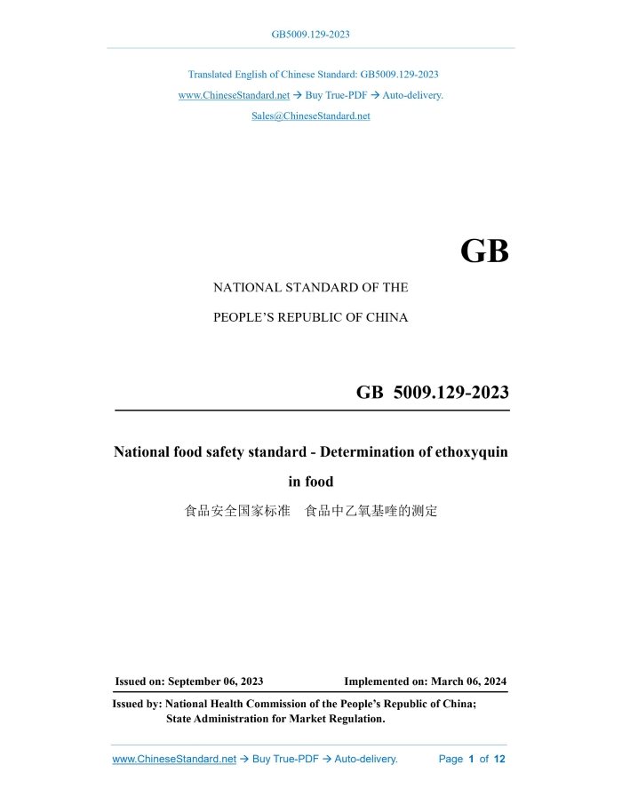 GB 5009.129-2023: National food safety standard - Determination of ethoxyquin in foods Delivery: 9 seconds. True-PDF full-copy in English & invoice will be downloaded + auto-delivered via email. See step-by-step procedure Status: Valid GB 5009.129: Historical versions