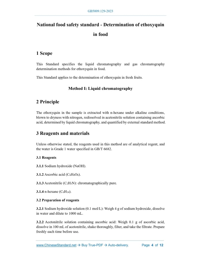 Similar standardsGB 5009.129-2023: National food safety standard - Determination of ethoxyquin in foods---This is an excerpt. Full copy of true-PDF in English version (including equations, symbols, images, flow-chart, tables, and figures etc.), auto-downloaded/delivered in 9 seconds, can be purchased online: https://www.ChineseStandard.net/PDF.aspx/GB5009.129-2023GB NATIONAL STANDARD OF THE PEOPLE’S REPUBLIC OF CHINA GB 5009.129-2023 National food safety standard - Determination of ethoxyquin in food ISSUED ON: SEPTEMBER 06, 2023 IMPLEMENTED ON: MARCH 06, 2024 Issued by: National Health Commission of the People’s Republic of China; State Administration for Market Regulation. Table of ContentsForeword ... 3 1 Scope ... 4 2 Principle ... 4 3 Reagents and materials ... 4 4 Instruments and equipment ... 5 5 Analysis procedure ... 6 6 Expression of analysis results ... 7 7 Precision ... 7 8 Others ... 8 9 Principle ... 8 10 Reagents and materials ... 8 11 Instruments and equipment ... 9 12 Analysis procedure ... 9 13 Expression of analysis results ... 10 14 Precision ... 11 15 Others ... 11 Annex A Ethoxyquin chromatograms ... 12 National food safety standard - Determination of ethoxyquin in food1 ScopeThis Standard specifies the liquid chromatography and gas chromatography determination methods for ethoxyquin in food. This Standard applies to the determination of ethoxyquin in fresh fruits. Method I: Liquid chromatography2 PrincipleThe ethoxyquin in the sample is extracted with n-hexane under alkaline conditions, blown to dryness with nitrogen, redissolved in acetonitrile solution containing ascorbic acid, determined by liquid chromatography, and quantified by external standard method.3 Reagents and materialsUnless otherwise stated, the reagents used in this method are of analytical regent, and the water is Grade 1 water specified in GB/T 6682. 3.1 Reagents 3.1.1 Sodium hydroxide (NaOH). 3.1.2 Ascorbic acid (C6H8O6). 3.1.3 Acetonitrile (C2H3N): chromatographically pure. 3.1.4 n-hexane (C6H14). 3.2 Preparation of reagents 3.2.1 Sodium hydroxide solution (0.1 mol/L): Weigh 4 g of sodium hydroxide, dissolve in water and dilute to 1000 mL. 3.2.2 Acetonitrile solution containing ascorbic acid: Weigh 0.1 g of ascorbic acid, dissolve in 100 mL of acetonitrile, shake thoroughly, filter, and take the filtrate. Prepare freshly each time before use. 3.3 Reference material Ethoxyquin reference material (C14H19NO, CAS number: 91-53-2): purity ≥ 99 %, or a reference material certified by the country and awarded a reference material certificate. 3.4 Preparation of standard solutions 3.4.1 Ethoxyquin standard stock solution (1.00 mg/mL): Weigh 100 mg of ethoxyquin reference material (accurate to 0.1 mg) in a 100 mL volumetric flask, dissolve with acetonitrile solution containing ascorbic acid and dilute to the mark, and mix well. Transfer the solution to a brown glass container and store it in the dark at -18 °C. The validity period is 3 months. 3.4.2 Ethoxyquin standard intermediate solution (10.0 μg/mL): Pipette 1.00 mL of the standard stock solution (1.00 mg/mL) into a 100 mL volumetric flask, dilute to the mark with acetonitrile solution containing ascorbic acid, and mix well. Transfer the solution to a brown glass container and store it in the dark at -18 °C. The validity period is 1 month. 3.4.3 Ethoxyquin standard use solution (1.00 μg/mL): Pipette 1.00 mL of the standard intermediate solution (10.0 μg/mL) into a 10 mL volumetric flask, dilute to the mark with acetonitrile solution containing ascorbic acid, and mix well. Prepare freshly each time before use. 3.4.4 Ethoxyquin standard series working solutions: Pipette 40.0 μL, 100 μL, 200 μL, 500 μL and 1000 μL of the standard use solution (1.00 μg/mL) into 10 mL volumetric flasks respectively, dilute to the mark with acetonitrile solution containing ascorbic acid, and mix well. The concentrations of ethoxyquin standard series working solutions are 4.00 ng/mL, 10.0 ng/mL, 20.0 ng/mL, 50.0 ng/mL and 100 ng/mL respectively. Prepare freshly each time before use.4 Instruments and equipment4.1 Liquid chromatograph: equipped with a fluorescence detector. 4.2 Tissue masher. 4.3 Analytical balances: the minimum divisions are 0.01 g and 0.1 mg respectively. 4.4 Vortex mixer. 4.5 Oscillator. 4.6 Nitrogen concentration device. 4.7 Centrifuge.5 Analysis procedure5.1 Preparation of samples Take 500 g of the edible part of the representative sample, add 10 g of ascorbic acid, crush and mix with a tissue masher and process into a slurry, put into a clean container and seal it. The prepared samples are frozen and stored at -18 °C for determination as soon as possible. NOTE: When GB 2763 is used for judgment, the determination site shall be in accordance with the provisions of GB 2763. 5.2 Extraction of samples Weigh 5 g (accurate to 0.01 g) of the sample in a 50 mL centrifuge tube, add 5 mL of sodium hydroxide solution (0.1 mol/L), vortex and mix for 30 s, add 10 mL of n-hexane, vortex and mix for 30 s, oscillate for 15 min for extraction, then centrifuge at 4000 r/min for 5 min, transfer the n-hexane layer to a 25 mL volumetric flask, add 10 mL n- hexane to the residue, repeat the extraction once, centrifuge at 4000 r/min for 5 min, combine the n-hexane layer in the same volumetric flask, add n-hexane to dilute to the mark, and mix well. Pipette 5.0 mL of n-hexane extract, concentrate to dryness with nitrogen at 30 °C, quickly add 5.0 mL of acetonitrile solution containing ascorbic acid, vortex and mix for 30 s, filter through a 0.45 μm organic microporous membrane to prepare the sample solution to be tested. 5.3 Reference conditions for liquid chromatography a) Chromatographic column: C18 chromatographic column (4.6 mm × 250 mm, 5 μm) or one with equivalent performance. b) Mobile phase: acetonitrile-water (65 : 35, volume ratio). c) Flow rate: 1 mL/min. d) Column temperature: 30 ℃. e) Excitation wavelength: 365 nm; emission wavelength: 435 n