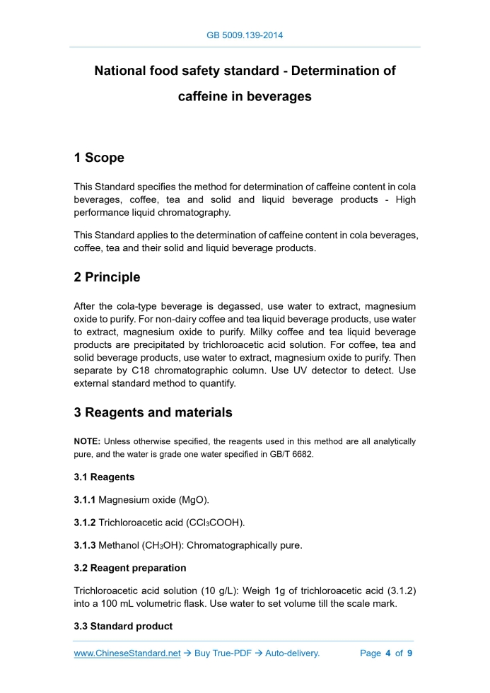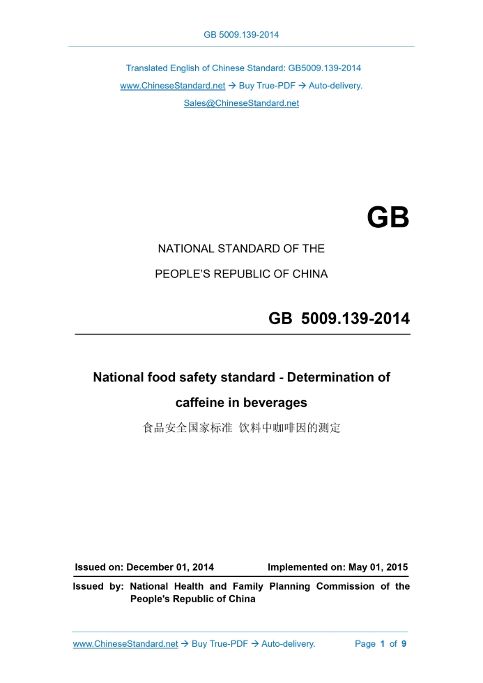 GB 5009.139-2014: National food safety standard -- Determination of caffeine in beverages Delivery: 9 seconds. True-PDF full-copy in English & invoice will be downloaded + auto-delivered via email. See step-by-step procedure Status: Valid GB 5009.139: Historical versions