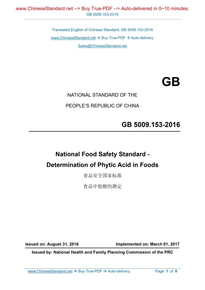GB 5009.153-2016: Determination of phytic acid in vegetable foods Delivery: 9 seconds. True-PDF full-copy in English & invoice will be downloaded + auto-delivered via email. See step-by-step procedure Status: Valid GB 5009.153: Historical versions