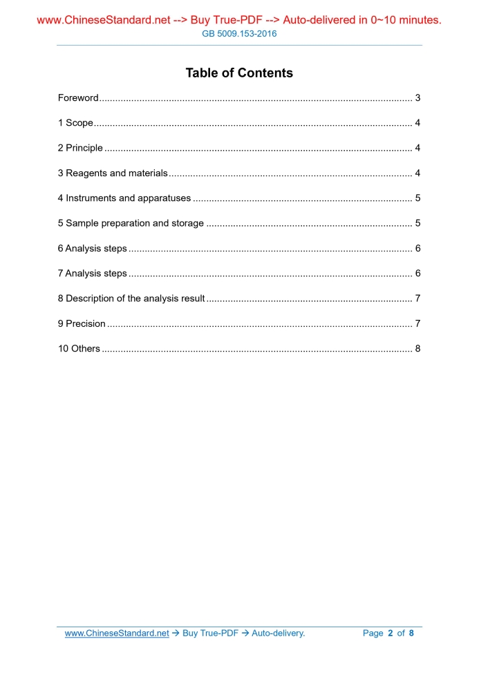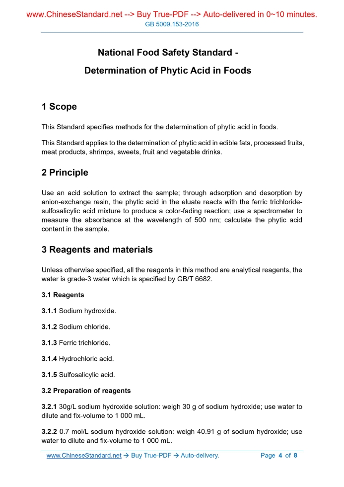 Similar standardsGB 5009.153-2016: Determination of phytic acid in vegetable foods---This is an excerpt. Full copy of true-PDF in English version (including equations, symbols, images, flow-chart, tables, and figures etc.), auto-downloaded/delivered in 9 seconds, can be purchased online: https://www.ChineseStandard.net/PDF.aspx/GB5009.153-2016NATIONAL STANDARD OF THE PEOPLE’S REPUBLIC OF CHINA National Food Safety Standard - Determination of Phytic Acid in Foods ISSUED ON: AUGUST 31, 2016 IMPLEMENTED ON: MARCH 01, 2017 Issued by: National Health and Family Planning Commission of the PRC Table of ContentsForeword ... 3 1 Scope ... 4 2 Principle ... 4 3 Reagents and materials ... 4 4 Instruments and apparatuses ... 5 5 Sample preparation and storage ... 5 6 Analysis steps ... 6 7 Analysis steps ... 6 8 Description of the analysis result ... 7 9 Precision ... 7 10 Others ... 8 National Food Safety Standard - Determination of Phytic Acid in Foods1 ScopeThis Standard specifies methods for the determination of phytic acid in foods. This Standard applies to the determination of phytic acid in edible fats, processed fruits, meat products, shrimps, sweets, fruit and vegetable drinks.2 PrincipleUse an acid solution to extract the sample; through adsorption and desorption by anion-exchange resin, the phytic acid in the eluate reacts with the ferric trichloride- sulfosalicylic acid mixture to produce a color-fading reaction; use a spectrometer to measure the absorbance at the wavelength of 500 nm; calculate the phytic acid content in the sample.3 Reagents and materialsUnless otherwise specified, all the reagents in this method are analytical reagents, the water is grade-3 water which is specified by GB/T 6682. 3.1 Reagents 3.1.1 Sodium hydroxide. 3.1.2 Sodium chloride. 3.1.3 Ferric trichloride. 3.1.4 Hydrochloric acid. 3.1.5 Sulfosalicylic acid. 3.2 Preparation of reagents 3.2.1 30g/L sodium hydroxide solution: weigh 30 g of sodium hydroxide; use water to dilute and fix-volume to 1 000 mL. 3.2.2 0.7 mol/L sodium hydroxide solution: weigh 40.91 g of sodium hydroxide; use water to dilute and fix-volume to 1 000 mL. Take a representative edible part; use a tissue masher to pulverize and homogenate; mix it evenly; put it into a clean container; seal it and mark it. 5.1.2 Liquid sample Take a representative sample; mix it evenly; put it into a clean container; seal it and mark it. 5.2 Sample storage The sample shall be stored in a refrigerator at -18°C. Note: During sample preparation and storage, the sample shall be protected from contamination and the test object shall be prevented from loss.6 Analysis steps6.1 Extraction Weigh 10.0 g of the sample; place it in a triangular flask with a plug; add 40 mL of sodium sulfate-hydrochloric acid extraction solution (3.2.5); shake and extract for 2 h; centrifuge the extract at 5 000 r/min for 5 min; collect all the supernatant and use sodium sulfate-hydrochloric acid extraction solution to fix-volume to 50 mL; filter it through a quick filter paper and set aside. 6.2 Purification Take 0.5 g of anion-exchange resin (3.5) and wet-pack it into an empty column tube (4.5); respectively use 15 mL of a sodium chloride solution (3.2.2) and 20 mL of water to wash the ion-exchange column. Take 5 mL (for fresh shrimp sample, take 10 mL) of filtrate; add 1mL (for fresh shrimp sample, add 2mL) of sodium hydroxide solution (3.2.1); use water to dilute to 30 mL (for fresh shrimp sample, to 60mL); mix and transfer it to the activated ion-exchange column; then, respectively use 15 mL of water and 15 mL of sodium chloride solution (3.2.3) to elute the exchange column at a flow rate of 1 mL/min; discard the effluent. Finally, use 25 mL of sodium chloride solution (3.2.2) to elute; collect all the eluate in a 25 mL graded tube with a plug; fix-volume to the scale. Note: When the resin is filled, a sieve plate, with a hole diameter of 20 μm ~ 50 μm, should be placed between the upper and lower layers, and the resin should be compacted.7 Analysis steps7.1 Preparation of the standard curve ......Source: Above contents are excerpted from the full-copy PDF -- translated/reviewed by: www.ChineseStandard.net / Wayne Zheng et al. Tips & Frequently Asked Questions:Question 1: How long will the true-PDF of English version of GB 5009.153-2016 be delivered?Answer: The full copy PDF of English version of GB 5009.153-2016 can be downloaded in 9 seconds, and it will also be emailed to you in 9 seconds (double mechanisms to ensure the delivery reliably), with PDF-invoice.Question 2: Can I share the purchased PDF of GB 5009.153-2016_English with my colleagues?Answer: Yes. The purchased PDF of GB 5009.153-2016_English will be deemed to be sold to your employer/organization who actually paid for it, including your colleagues and your employer's intranet.Question 3: Does the price include tax/VAT?Answer: Yes. Our tax invoice, downloaded/delivered in 9 seconds, includes all tax/VAT and complies with 100+ countries' tax regulations (tax exempted in 100+ countries) -- See Avoidance of Double Taxation Agreements (DTAs): List of DTAs signed between Singapore and 100+ countriesQuestion 4: Do you accept my currency other than USD?Answer: Yes. www.ChineseStandard.us -- GB 5009.153-2016 -- Click this link and select your country/currency to pay, the exact amount in your currency will be printed on the invoice. Full PDF will also be downloaded/emailed in 9 seconds.Question 5: Should I purchase the latest version GB 5009.153-2016?Answer: Yes. Unless special scenarios such as technical constraints or academic study, you should always prioritize to purchase the latest version GB 5009.153-2016 even if the enforcement date is in future. Complying with the latest version means that, by default, it also complies with all the earlier versions, technically.How to buy and download a true PDF of English version of GB 5009.153-2016?A step-by-step guide to download PDF of GB 5009.153-2016_EnglishStep 1: Visit website 