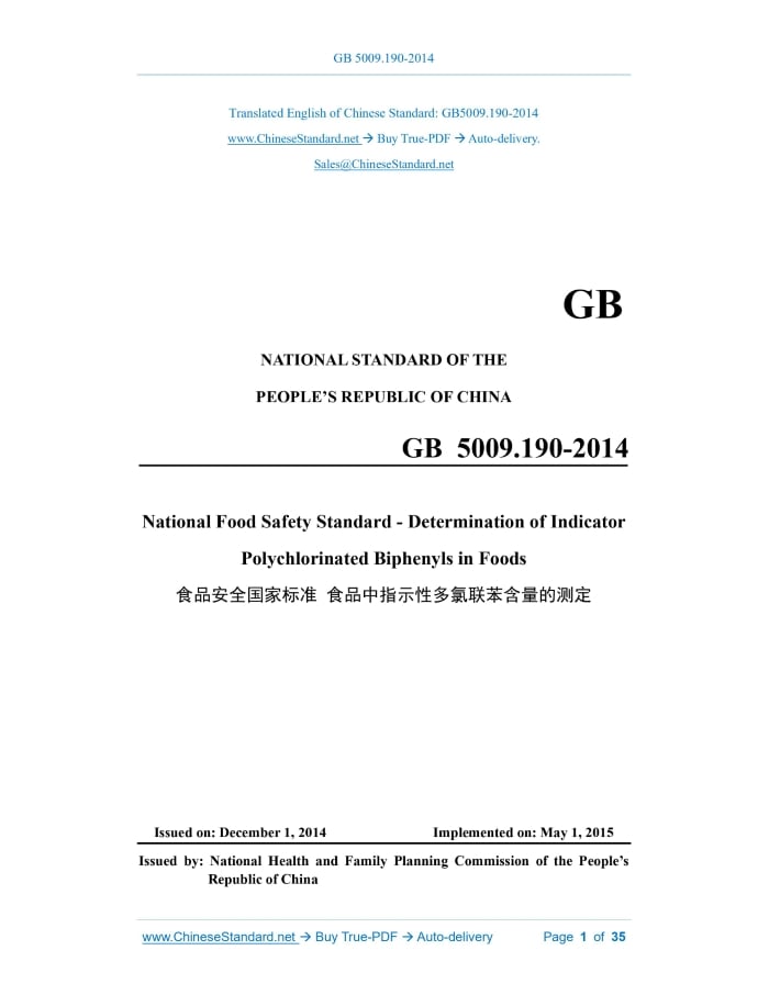 GB 5009.190-2014: National Food Safety Standard -- Determination of Indicator Polychlorinated Biphenyls in Foods Delivery: 9 seconds. True-PDF full-copy in English & invoice will be downloaded + auto-delivered via email. See step-by-step procedure Status: Valid GB 5009.190: Historical versions