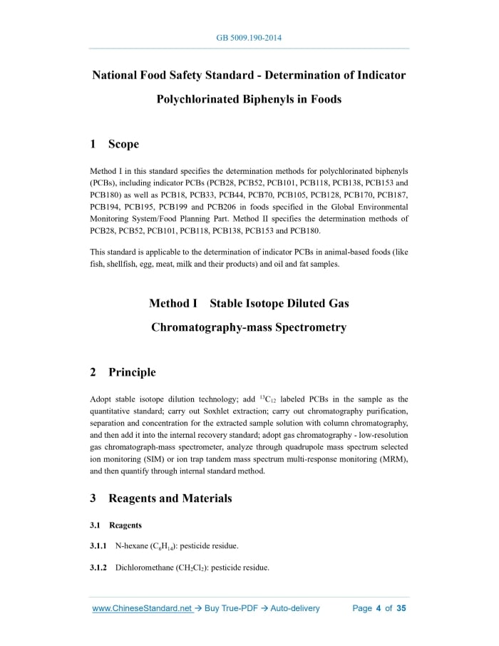 Similar standardsGB 5009.190-2014: National Food Safety Standard -- Determination of Indicator Polychlorinated Biphenyls in Foods---This is an excerpt. Full copy of true-PDF in English version (including equations, symbols, images, flow-chart, tables, and figures etc.), auto-downloaded/delivered in 9 seconds, can be purchased online: https://www.ChineseStandard.net/PDF.aspx/GB5009.190-2014 GB NATIONAL STANDARD OF THE PEOPLE’S REPUBLIC OF CHINA National Food Safety Standard - Determination of Indicator Polychlorinated Biphenyls in Foods ISSUED ON: DECEMBER 1, 2014 IMPLEMENTED ON: MAY 1, 2015 Issued by: National Health and Family Planning Commission of the People’s Republic of China Table of ContentsForeword ... 3 1 Scope ... 4 Method I Stable Isotope Diluted Gas Chromatography-mass Spectrometry ... 4 2 Principle ... 4 3 Reagents and Materials ... 4 4 Instruments and Equipment ... 6 5 Analytical Procedure ... 7 6 Quality Control and Assurance ... 13 7 Others ... 14 Method II Gas-chromatographic Method ... 14 8 Principle ... 14 9 Reagents and Materials ... 15 10 Instruments and Equipment ... 15 11 Analysis Procedure ... 16 12 Determination ... 17 13 Precision ... 19 14 Others ... 19 Appendix A Standard Solution for Indicator Polychlorinated Biphenyl ... 20 Appendix B Characteristic Ion and Isotopic Abundance Ratio ... 23 Appendix C PCBs Mass Chromatogram and Mass Spectrogram through GC-MS Determination ... 25 Appendix D Purification Flow Diagram ... 33 National Food Safety Standard - Determination of Indicator Polychlorinated Biphenyls in Foods1 ScopeMethod I in this standard specifies the determination methods for polychlorinated biphenyls (PCBs), including indicator PCBs (PCB28, PCB52, PCB101, PCB118, PCB138, PCB153 and PCB180) as well as PCB18, PCB33, PCB44, PCB70, PCB105, PCB128, PCB170, PCB187, PCB194, PCB195, PCB199 and PCB206 in foods specified in the Global Environmental Monitoring System/Food Planning Part. Method II specifies the determination methods of PCB28, PCB52, PCB101, PCB118, PCB138, PCB153 and PCB180. This standard is applicable to the determination of indicator PCBs in animal-based foods (like fish, shellfish, egg, meat, milk and their products) and oil and fat samples. Method I Stable Isotope Diluted Gas Chromatography-mass Spectrometry2 PrincipleAdopt stable isotope dilution technology; add 13C12 labeled PCBs in the sample as the quantitative standard; carry out Soxhlet extraction; carry out chromatography purification, separation and concentration for the extracted sample solution with column chromatography, and then add it into the internal recovery standard; adopt gas chromatography - low-resolution gas chromatograph-mass spectrometer, analyze through quadrupole mass spectrum selected ion monitoring (SIM) or ion trap tandem mass spectrum multi-response monitoring (MRM), and then quantify through internal standard method.3 Reagents and Materials3.1 Reagents 3.1.1 N-hexane (C6H14): pesticide residue. 3.1.2 Dichloromethane (CH2Cl2): pesticide residue. 3.1.3 Acetone (C3H6O): pesticide residue. 3.1.4 Methanol (CH3OH): pesticide residue. 3.1.5 Isooctane (C8H18): pesticide residue. 3.1.6 Anhydrous sodium sulfate (Na2SO4): guaranteed reagent. Put the commercially available anhydrous sodium sulfate into the chromatographic column, and successively elute it twice with n-hexane and dichloromethane; the volume of solvent used for each elution is about twice the volume of anhydrous sodium sulfate. After elution, transfer the anhydrous sodium sulfate into a flask; bake it to dry at 50℃ and then bake it for 8~12h at 225℃; cool it and then store it in a dryer. 3.1.7 Sulfuric acid (H2SO4): with content of 95%~98%, guaranteed reagent. 3.1.8 Sodium hydroxide (NaOH): guaranteed reagent. 3.1.9 Silver nitrate (AgNO3): guaranteed reagent. 3.1.10 Chromatographic silica gel (75~250μm). Put the commercially available silica gel into the glass chromatographic column, and successively elute it twice with n-hexane and dichloromethane; the volume of solvent used for each elution is about twice the volume of silica gel. After elution, transfer the silica gel into flask, and cover the flask mouth with aluminum foil; put it into the oven, and bake at 50℃ to dry; then heat up to 180℃ and bake for 8~12h; cool it and then put it into a reagent bottle with ground stopper; store it in the dryer. 3.1.11 44% acid silica gel: weigh 100g of activated silica gel, dropwise add 78.6g of sulfuric acid and shake until it is free of cake; put in into the reagent bottle with ground stopper and store it in dryer. 3.1.12 33% alkaline silica gel: weigh 100g of activated silica gel, dropwise add 49.2g of 1mol/L sodium hydroxide solution and shake until it is free of cake; put in into the reagent bottle with ground stopper and store it in dryer. 3.1.13 10% silver nitrate silica gel: dissolve 5.6g of silver nitrate into 21.5mL of deionized water, dropwise add it into 50g of activated silica gel, and shake until it is free of cake; put in into the brown reagent bottle with ground stopper and store it in dryer. 3.1.14 Alkaline aluminum oxide: adopt alkaline aluminum oxide for chromatogram chromatography, and bake it at 660℃ for 6h; put it into the reagent bottle with ground stopper and store it in dryer. 3.2 Standard solutions 3.2.1 Standard solution for the determination of the time window: composed of cognate can lead to a good cleaning effect. Where brush is adopted for cleaning, special attention shall be paid to that the brush shall not damage the internal surface of glass ware.5 Analytical Procedure5.1 Sample preparation 5.1.1 Pretreatment 5.1.1.1 Pack the site-collected sample with lucifugal material like aluminum foil and brown bottle, put it in small refrigerator and then transport it to the laboratory; store it in a cryogenic refrigerator below -10℃. 5.1.1.2 Solid sample like fish and meat may be dried by freezing or anhydrous sodium sulfate, and shall be mixed uniformly. Oil and fat may be dire